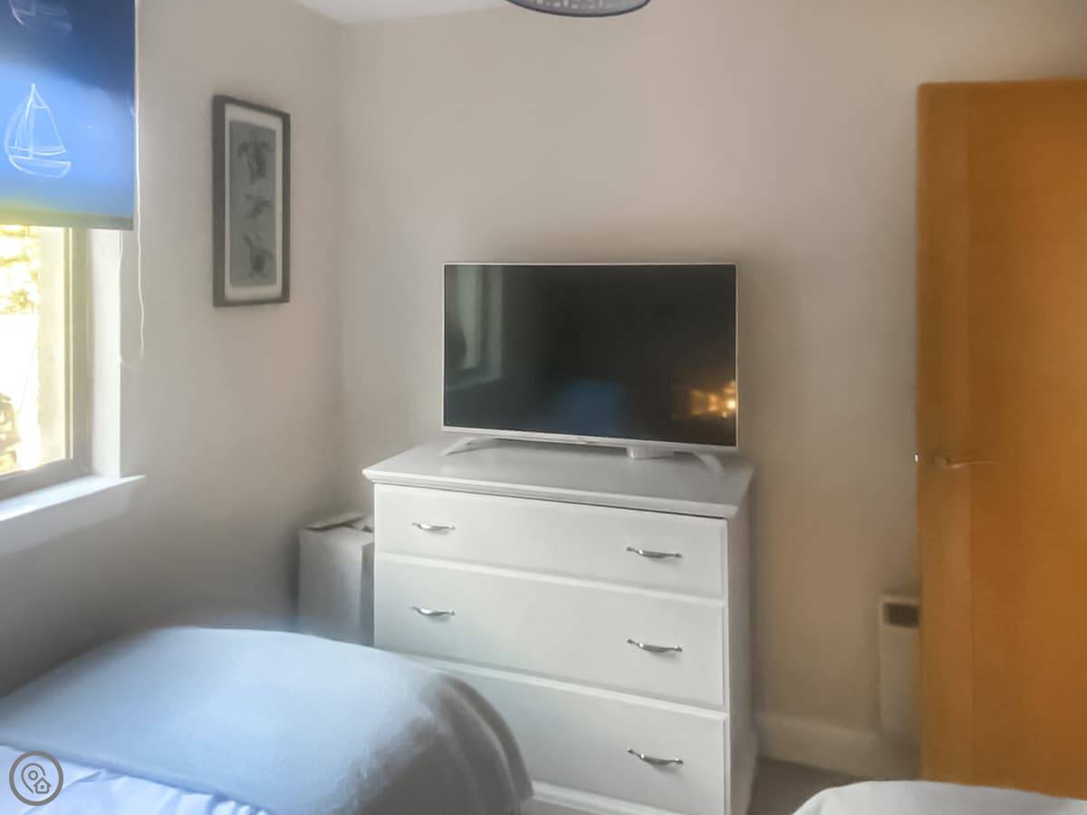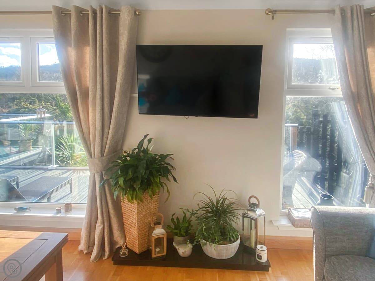 The main living area looks out over Lamlash Bay. You get a good view of the sea and Holy Isle from there. There's also a view of the river from the side. The kitchen has a breakfast bar and a dishwasher. It's got a 4 Star rating, which means it's well-equipped and comfortable.
