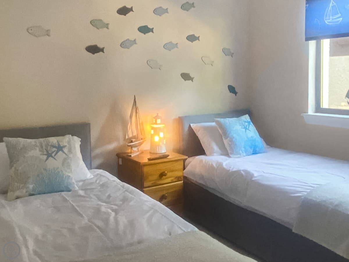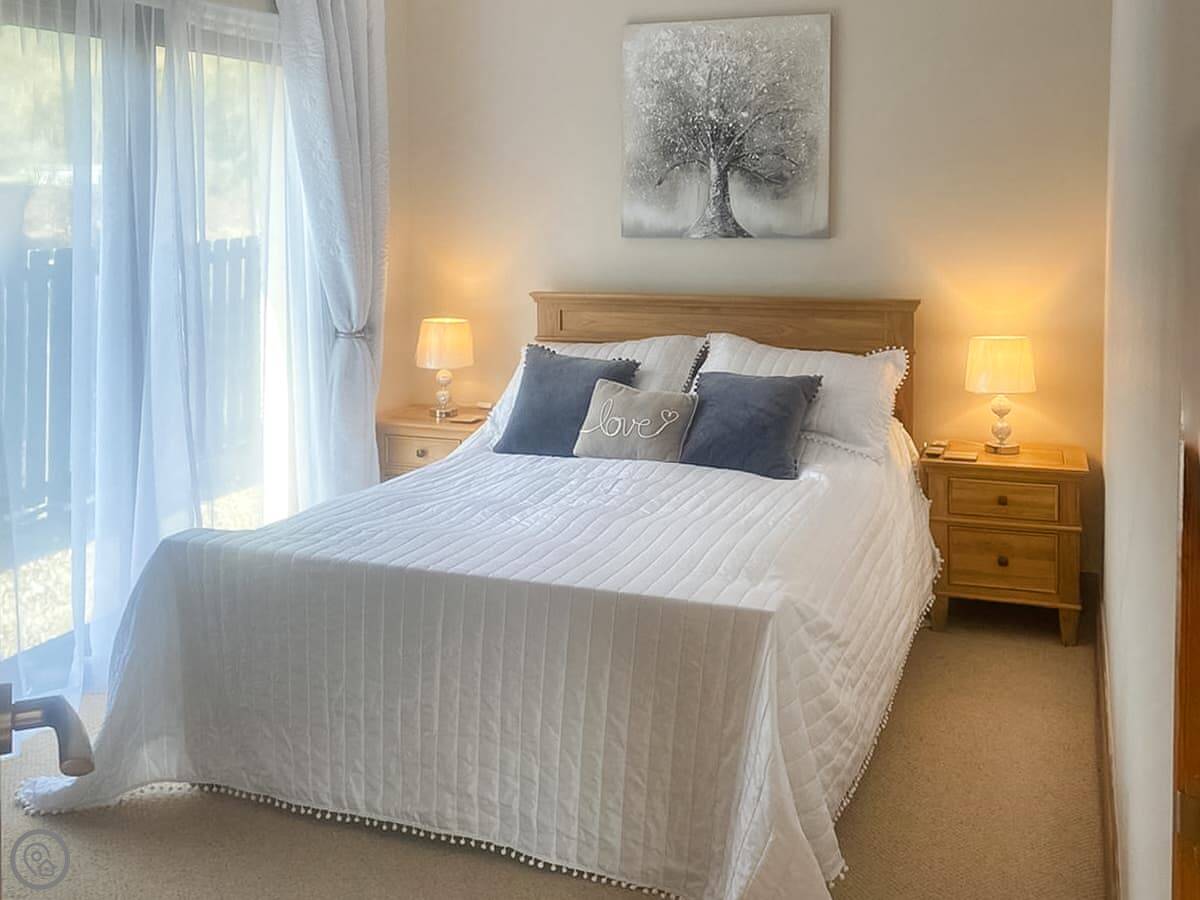 It sleeps six. Three bedrooms, two bathrooms. One double has an ensuite, which is handy. Another double has doors out to the garden. Everything is on one level, so no stairs to worry about.