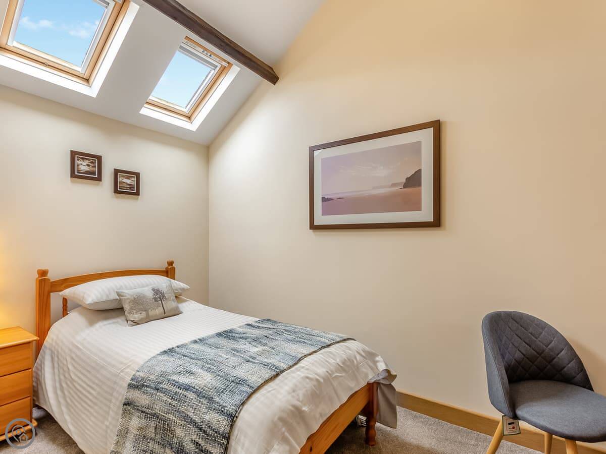 It sleeps three people. There are two bedrooms and one bathroom, plus a separate loo downstairs. The stairs are cottage stairs, so they're fairly steep.