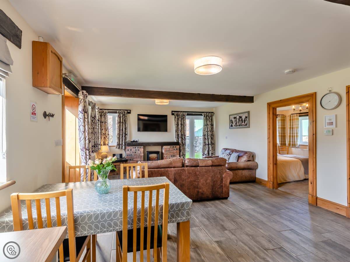 It sleeps four. Two bedrooms, one king and one twin, and one bathroom with a bath and shower over. It has a 4 Star rating. It's open plan inside, which we find makes it feel quite spacious. The main doors open out onto the patio.