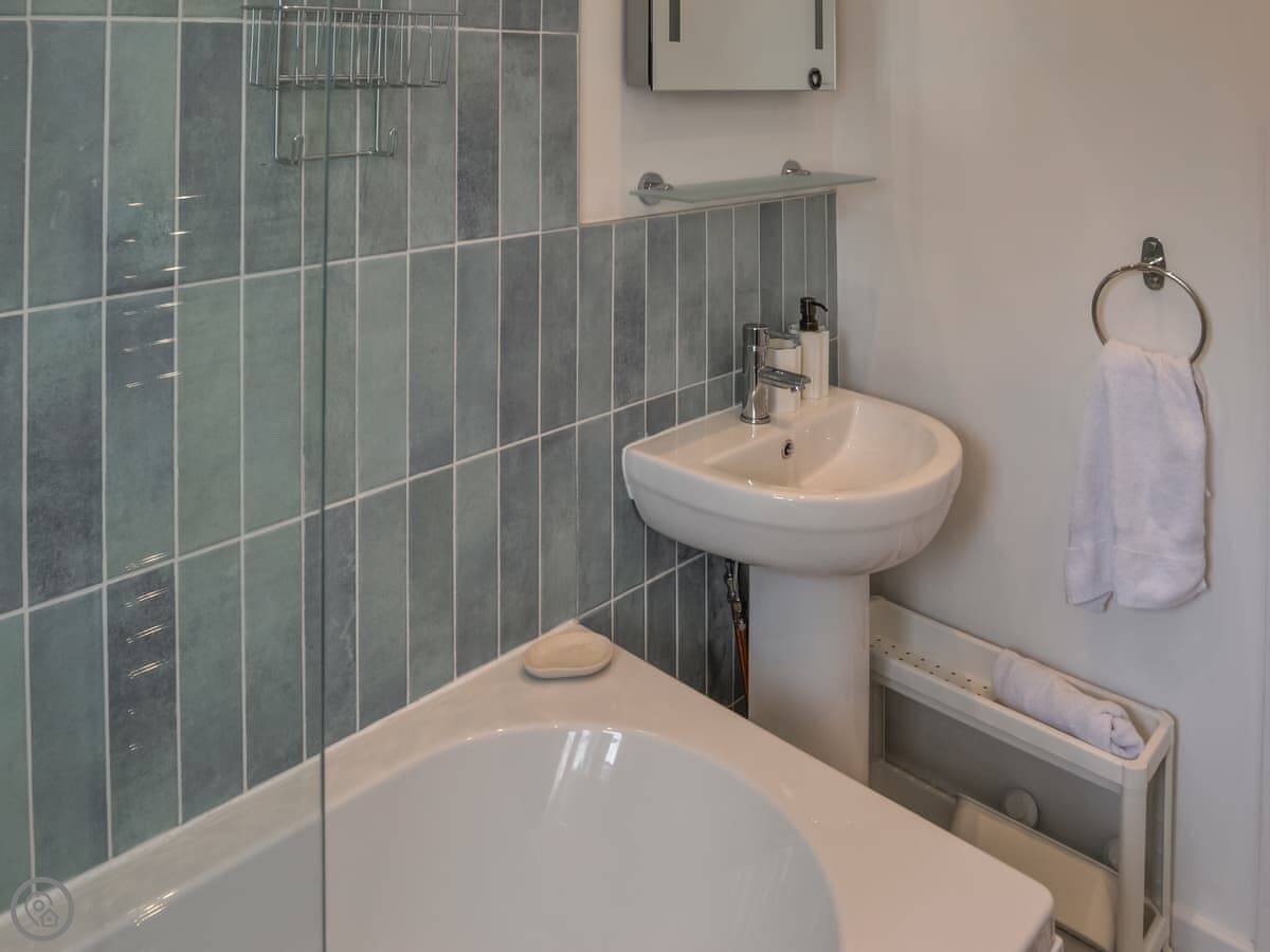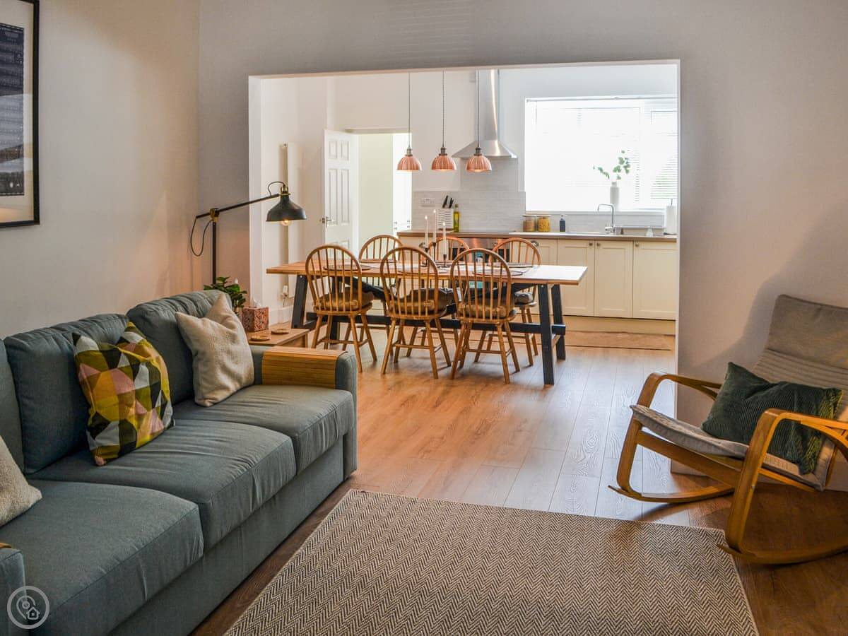 It sleeps four. Two bedrooms upstairs and one bathroom. It's got a 4 Star rating. They've done it up recently, so it's fresh and clean. The living room has a wood burner.