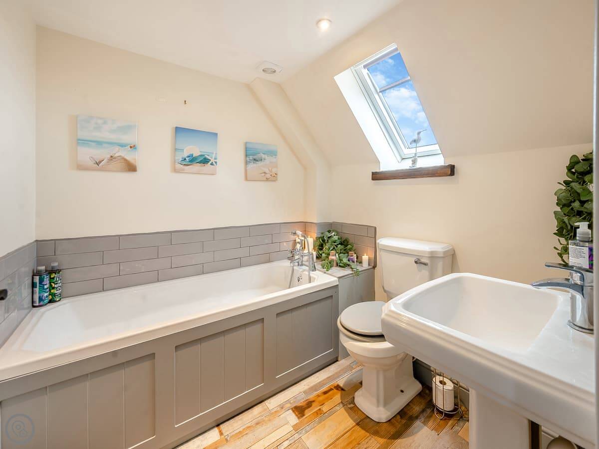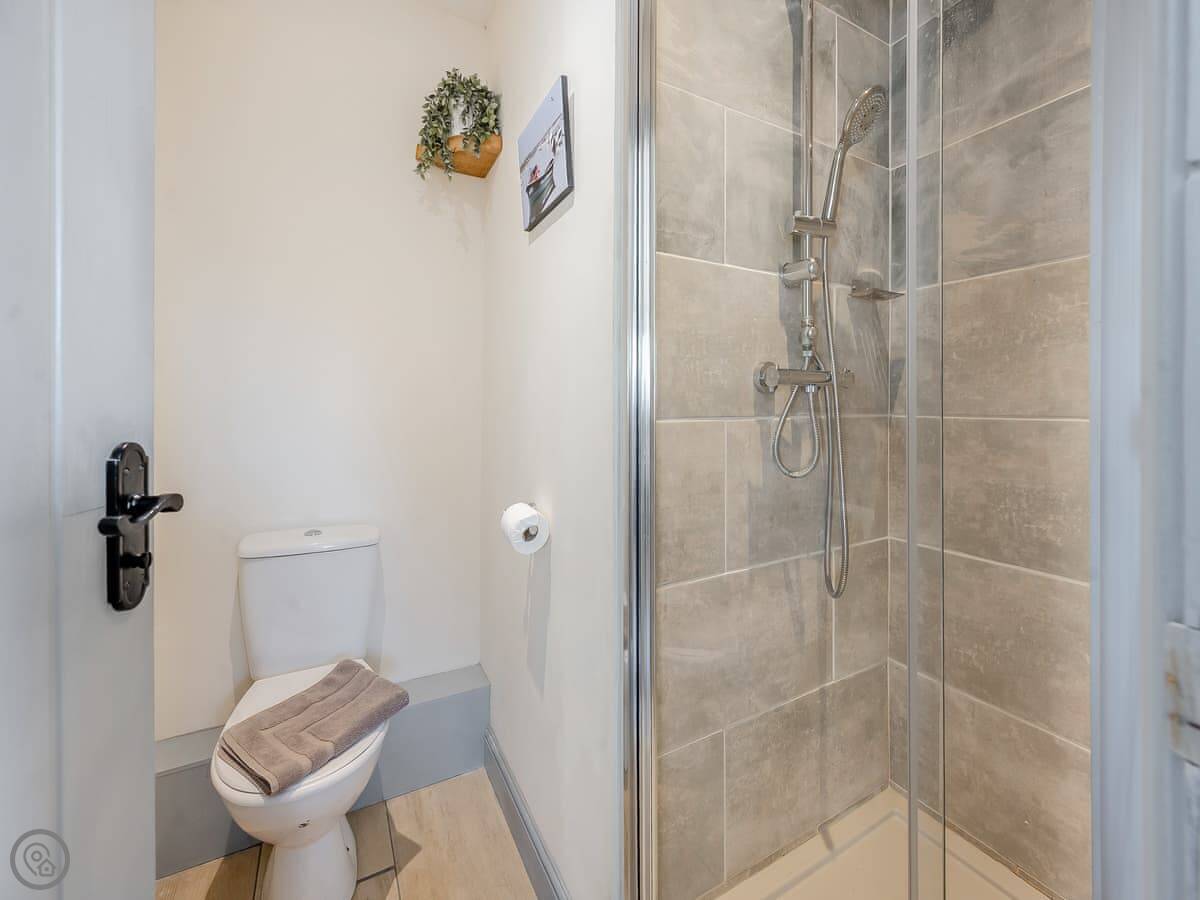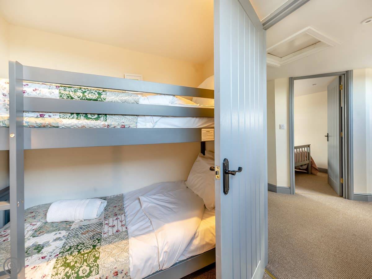 It sleeps six in three bedrooms. Two doubles, one with bunk beds. There are two bathrooms, one downstairs is just a shower and toilet. The stairs are open, steep and a bit narrow, typical for a barn conversion.