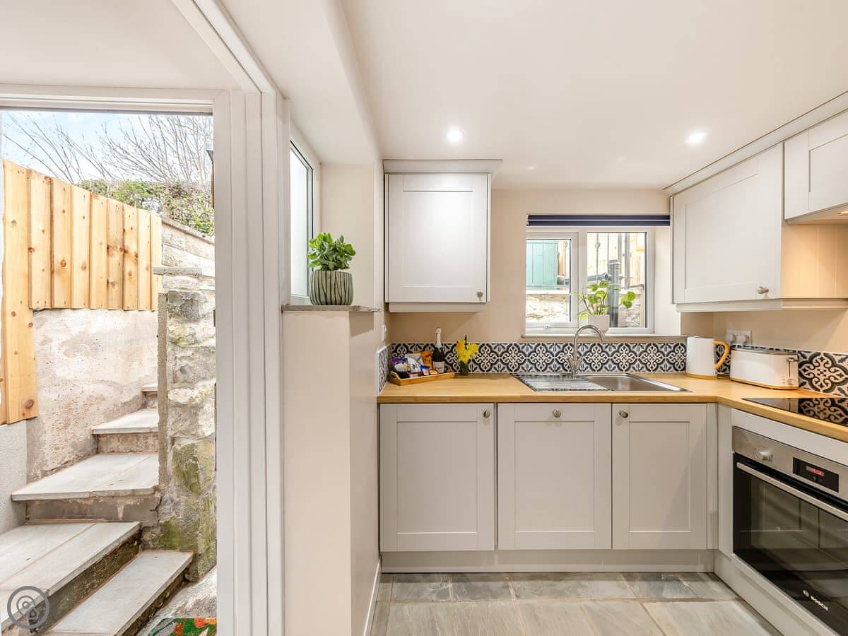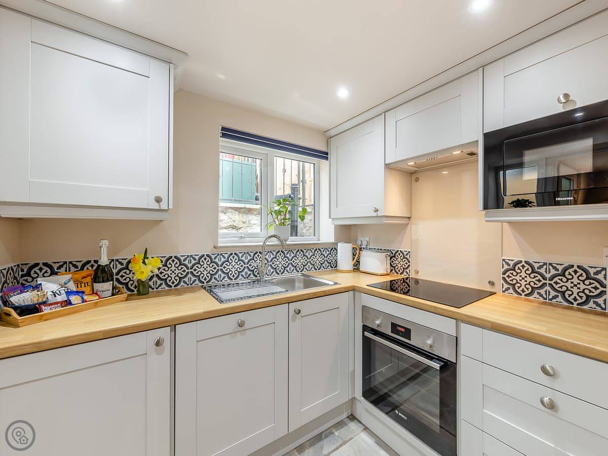 The living room has a wood burner for cooler evenings. There's a TV and a table to eat at. The kitchen is fine for making meals. It has a dishwasher and a washing machine.