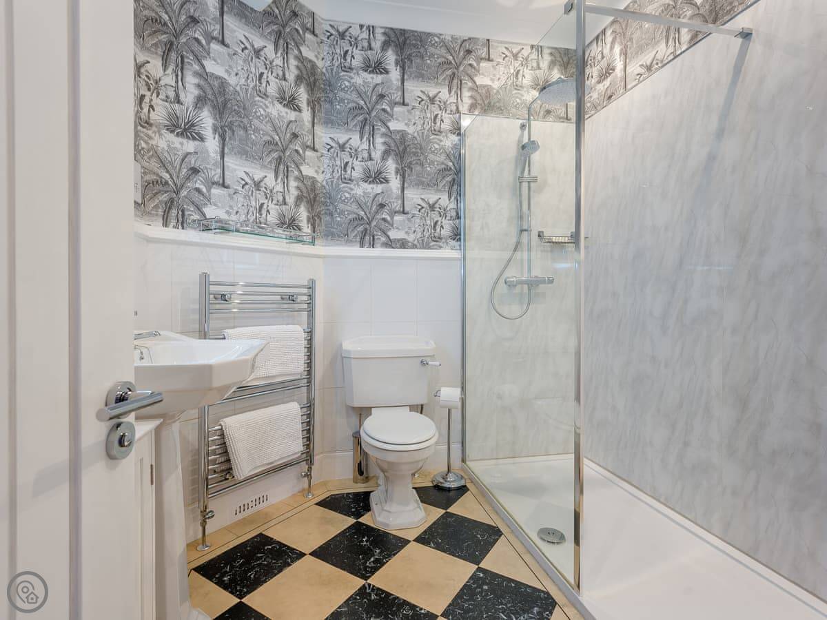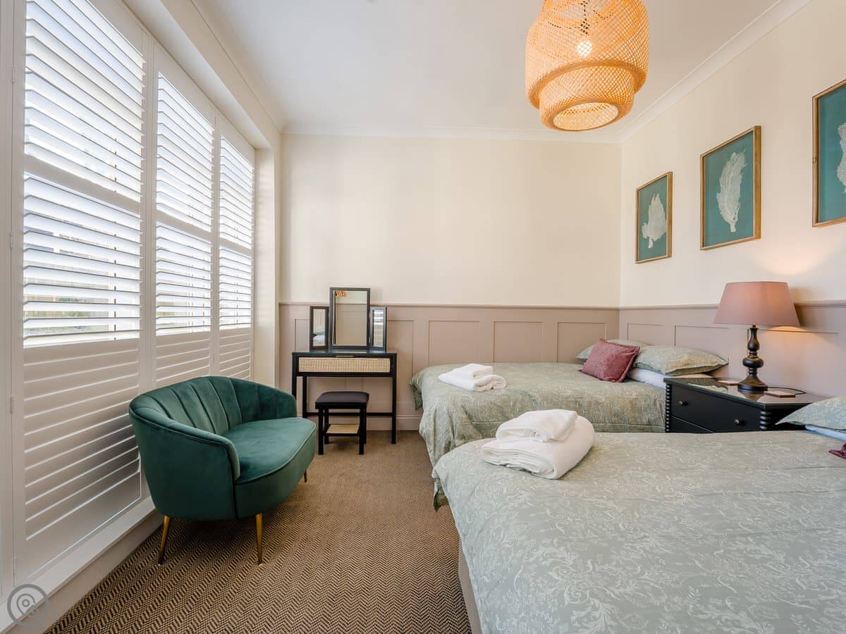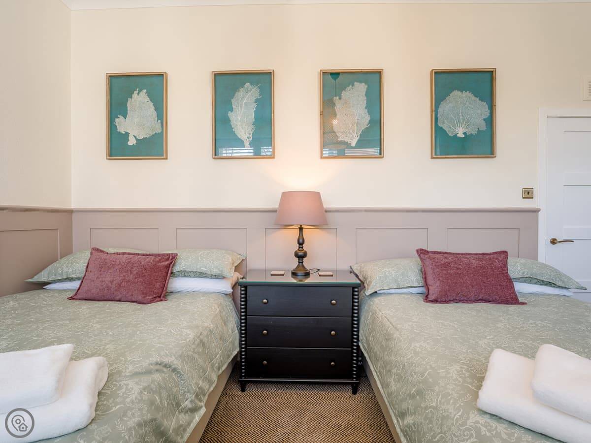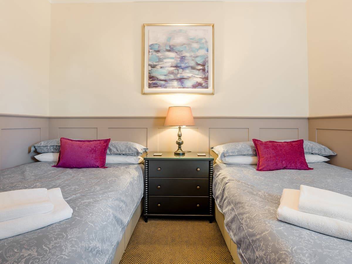 It sleeps four. There are two bedrooms, both doubles. They each have two double beds, which some people like for space. One has an ensuite and there’s a main bathroom as well, both with showers.