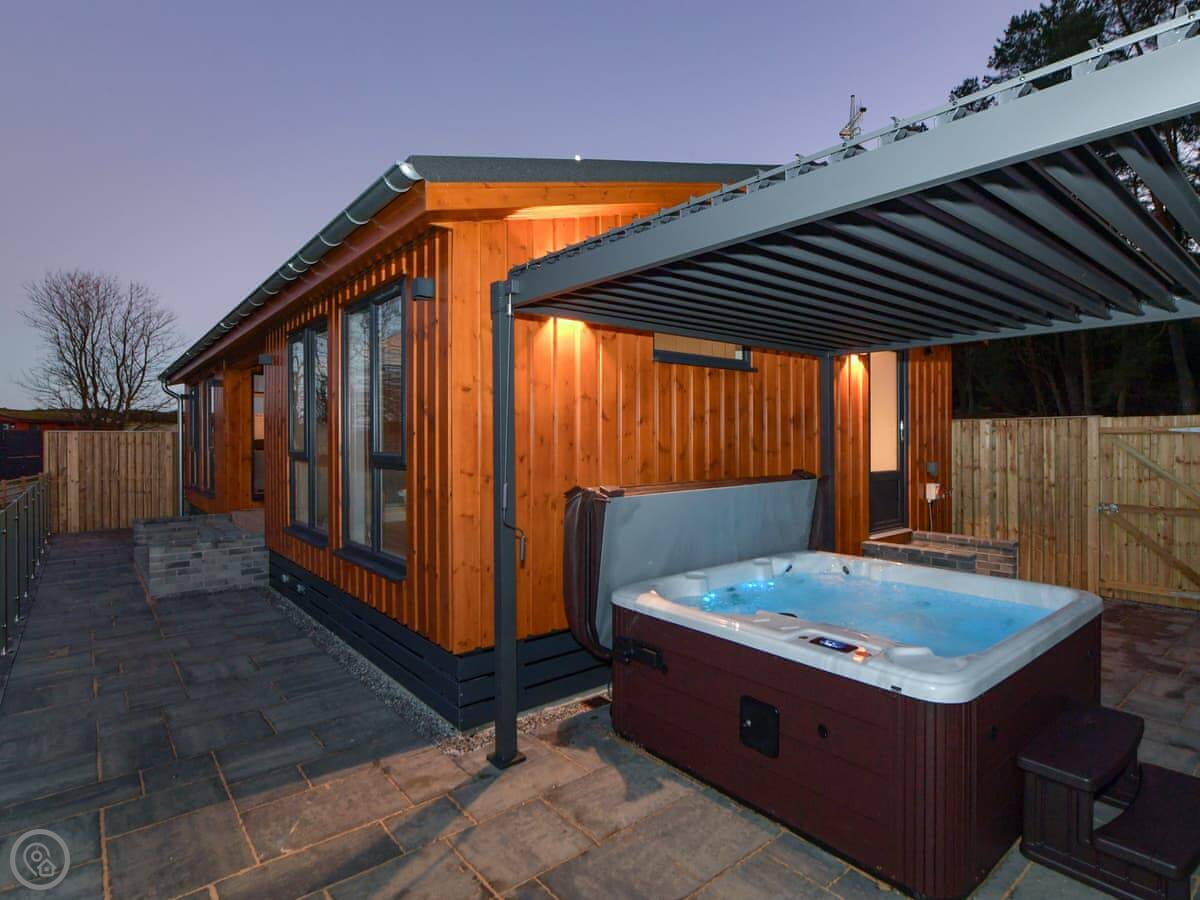 The bedroom is a decent size with an en-suite shower. There's also a free-standing bath in the room and a dressing area. Outside there's a private hot tub, a seating area with a pergola, and a BBQ.
