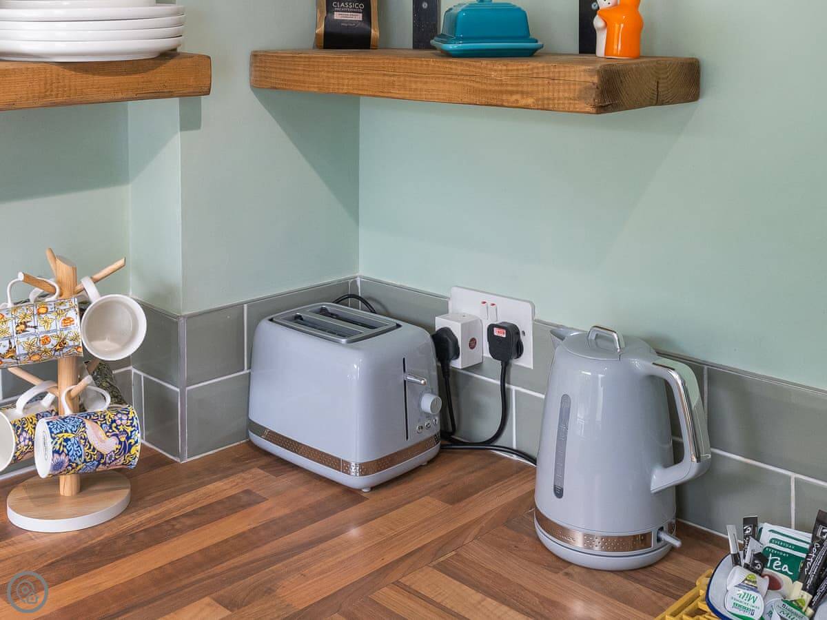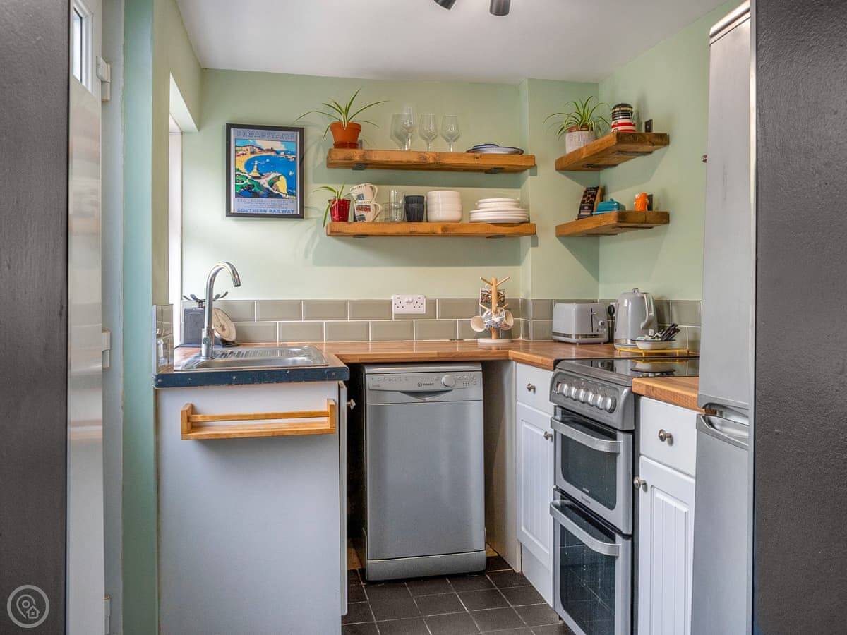 You've got one bathroom with a shower. The full rating is 4 Star. It's clean and well-kept. The kitchen has a dishwasher, and there's a washing machine if you need it. There's a small enclosed garden out the back with a patio and a BBQ.