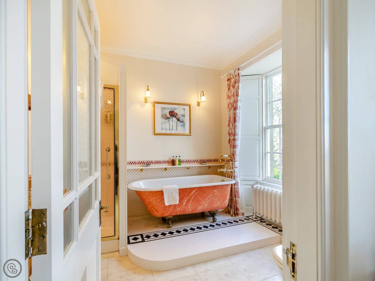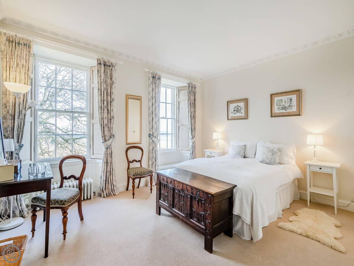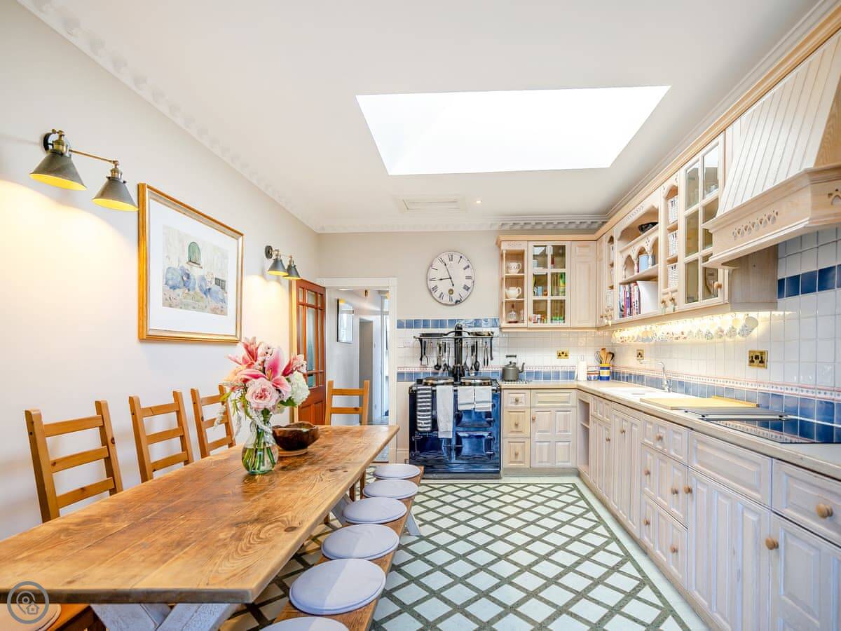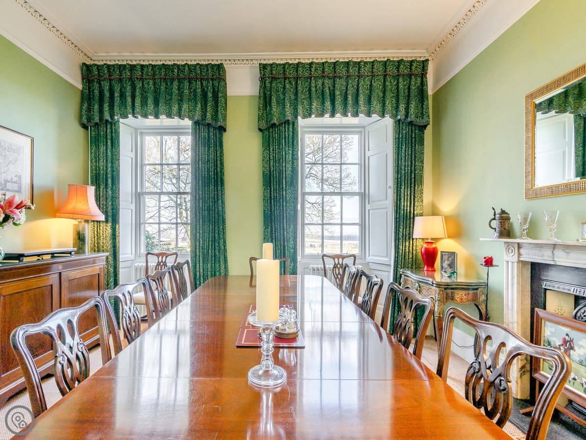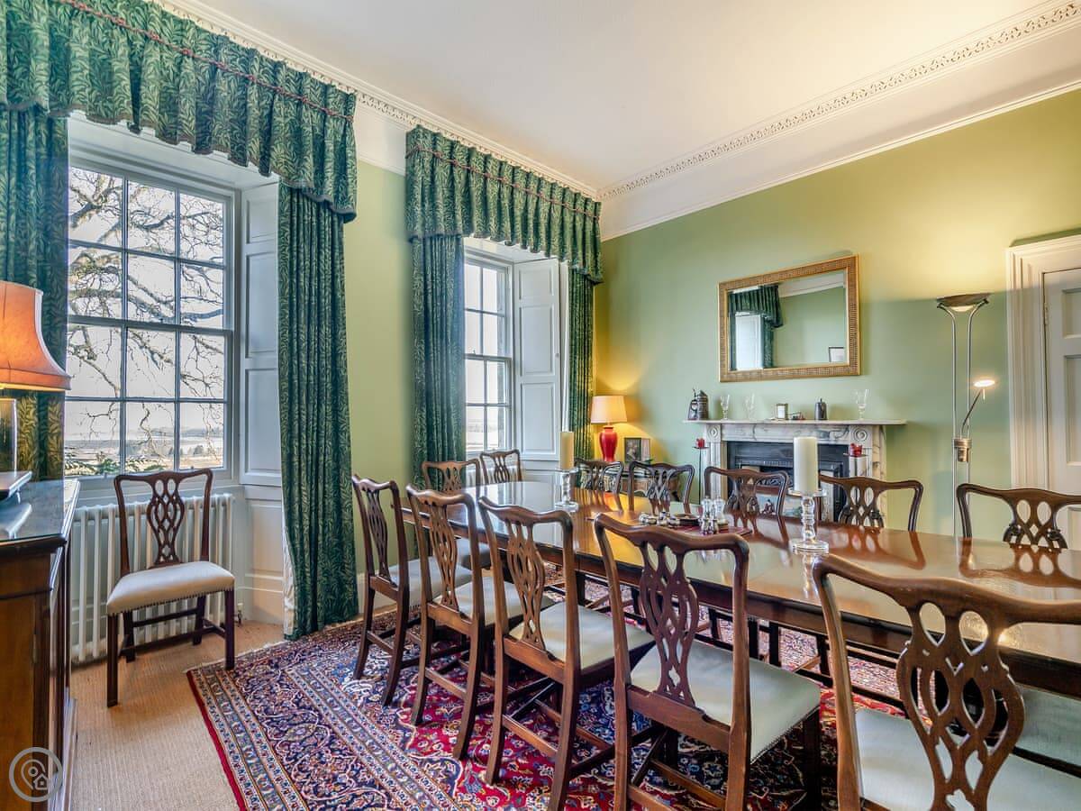 The master bedroom has a big roll-top bath in the en-suite. The main drawing room is Georgian, with high ceilings and an open fire. There's a dining room with a long table for fourteen. The kitchen has an Aga.