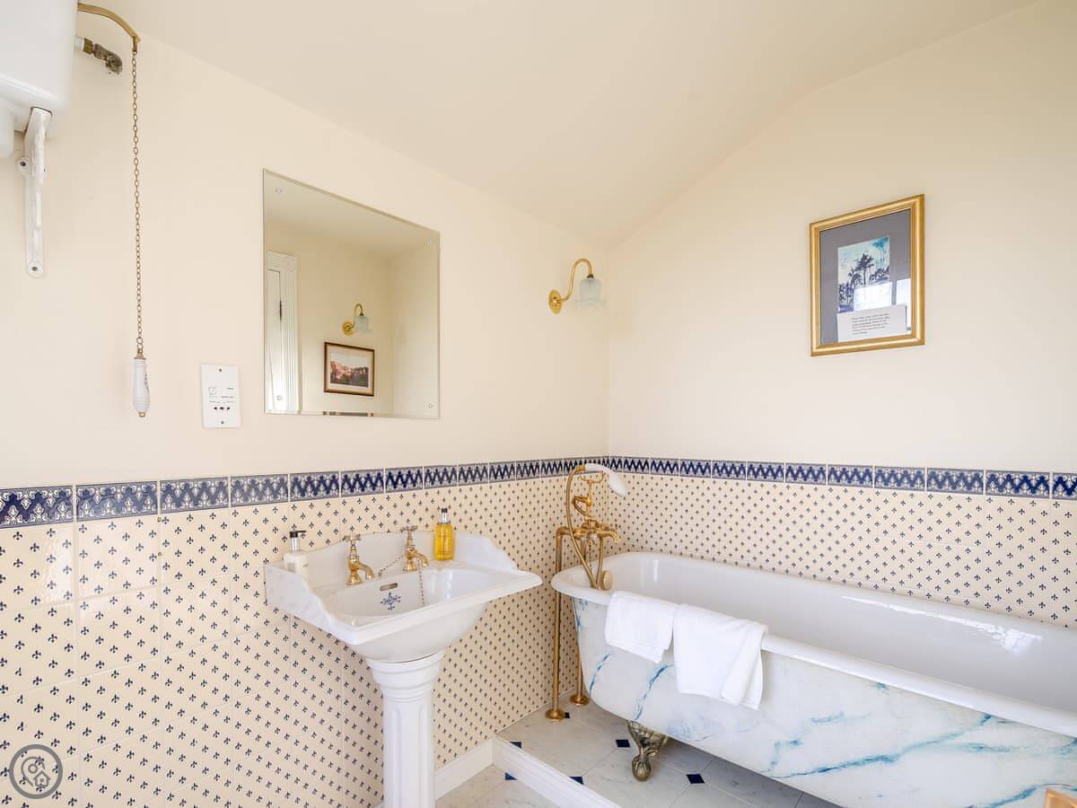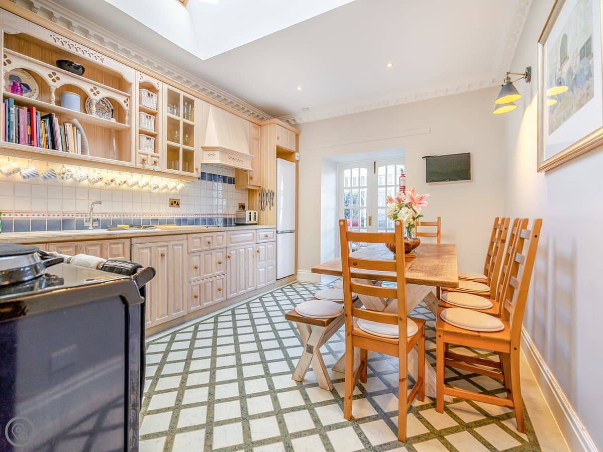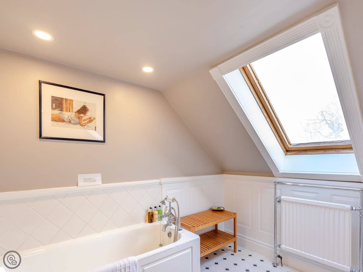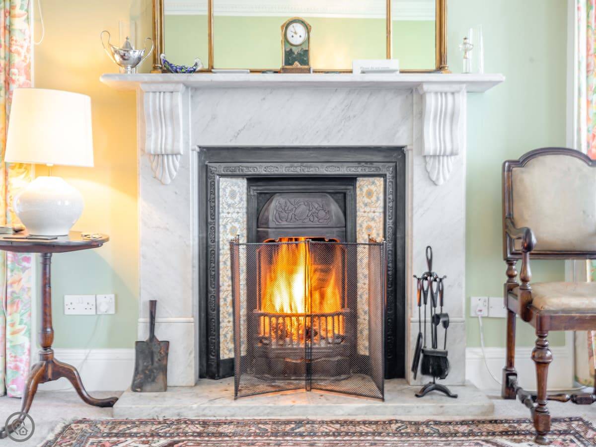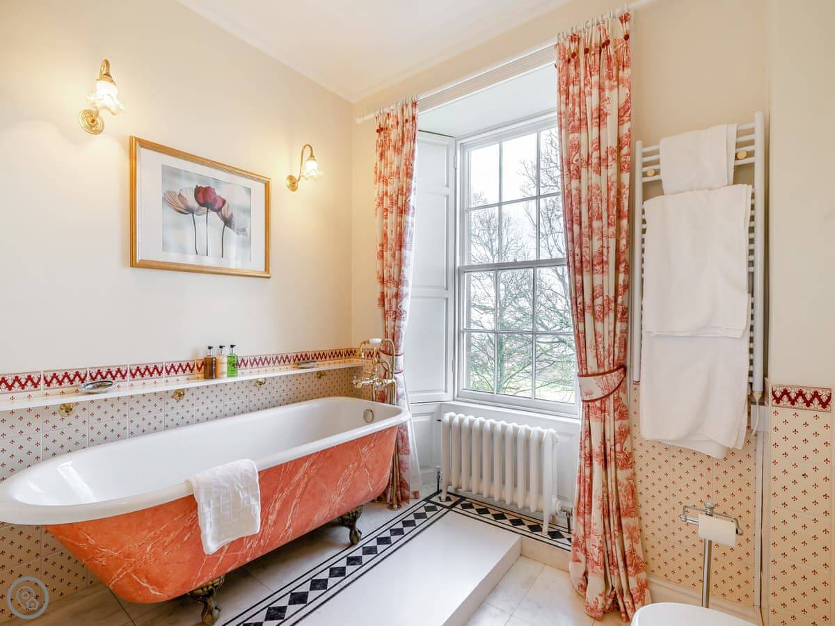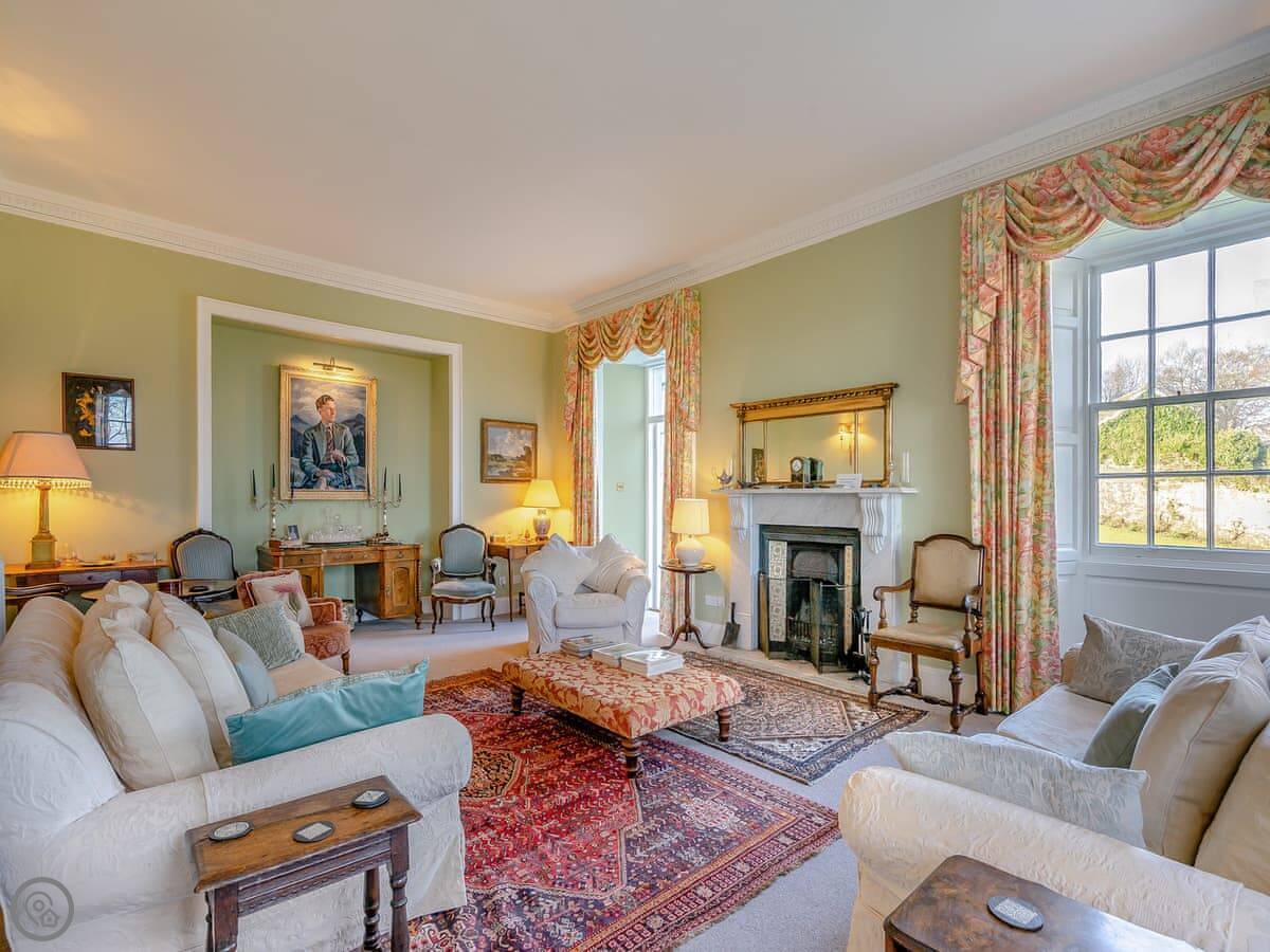 The master bedroom has a big roll-top bath in the en-suite. The main drawing room is Georgian, with high ceilings and an open fire. There's a dining room with a long table for fourteen. The kitchen has an Aga.