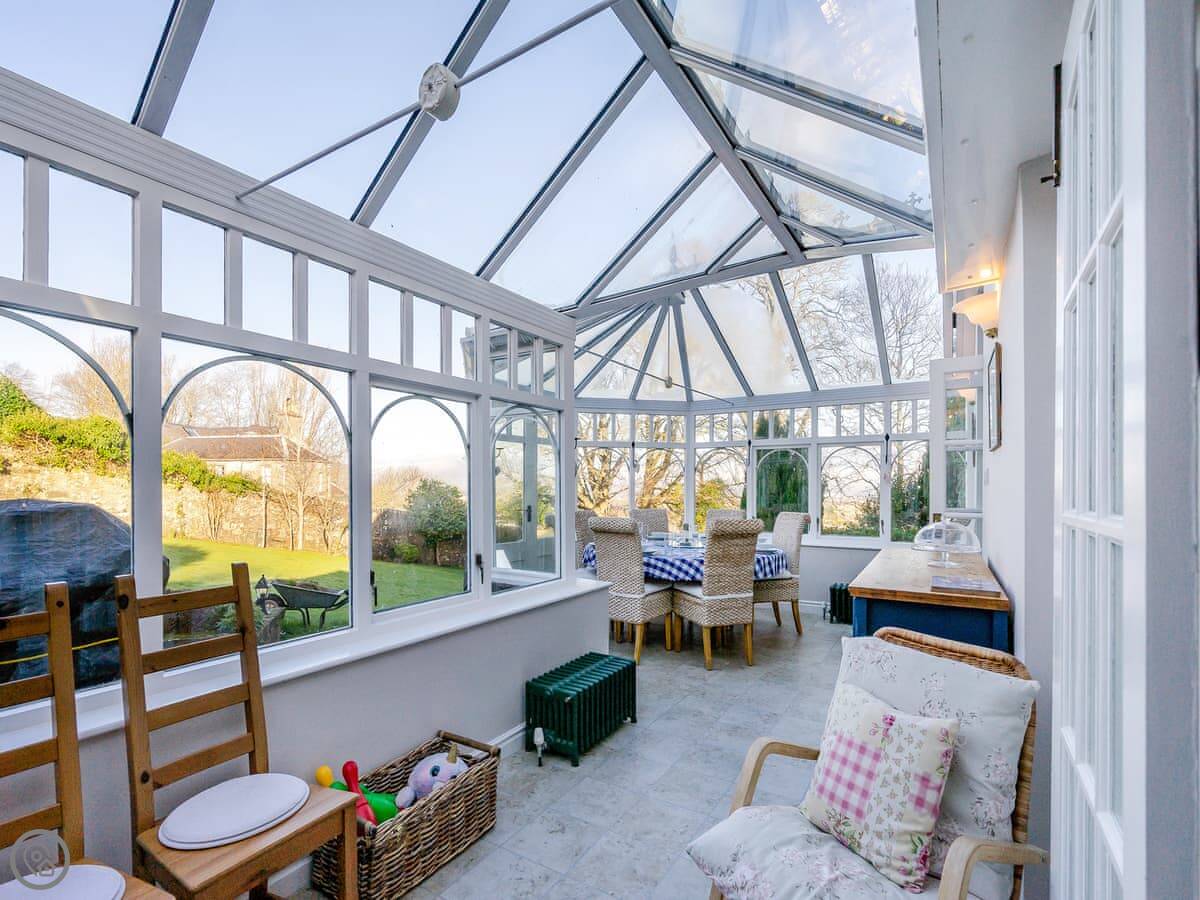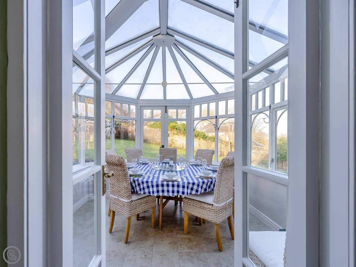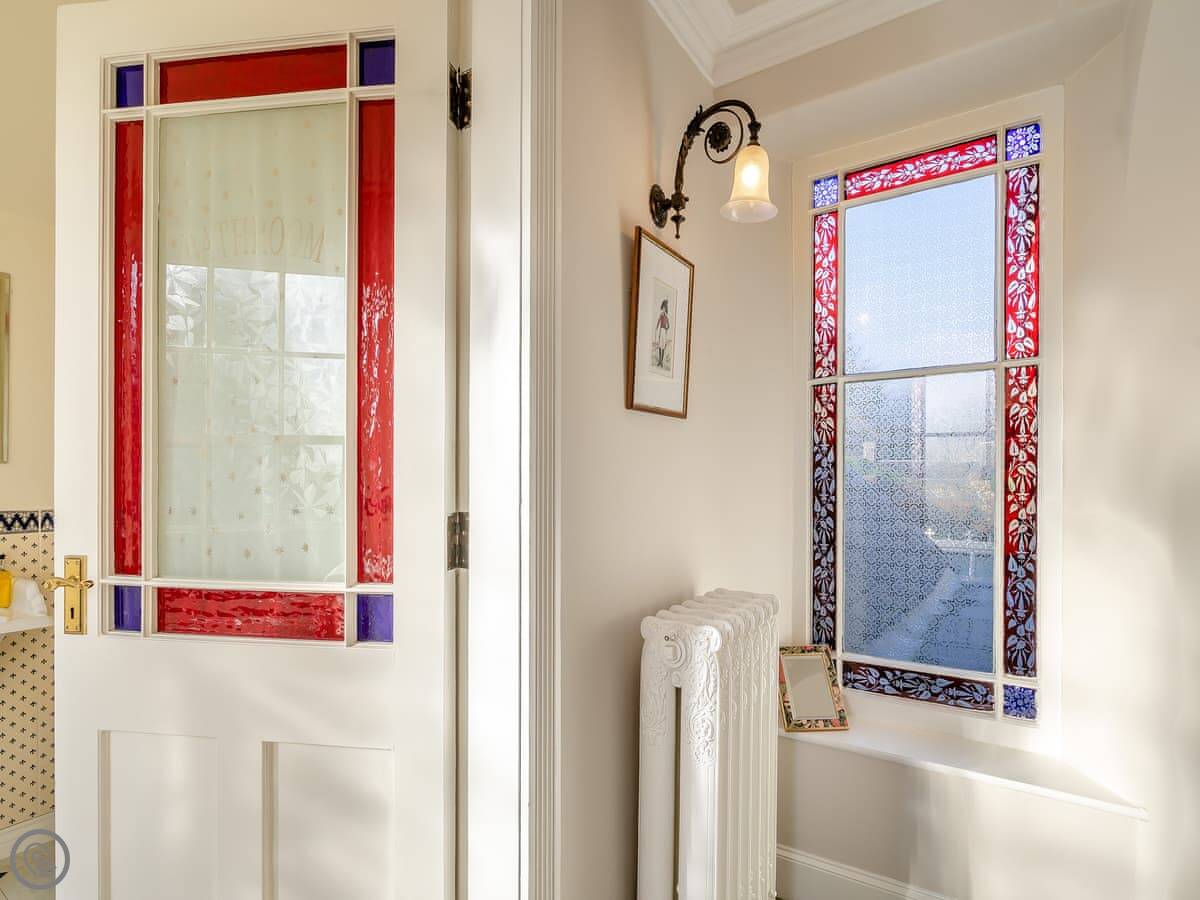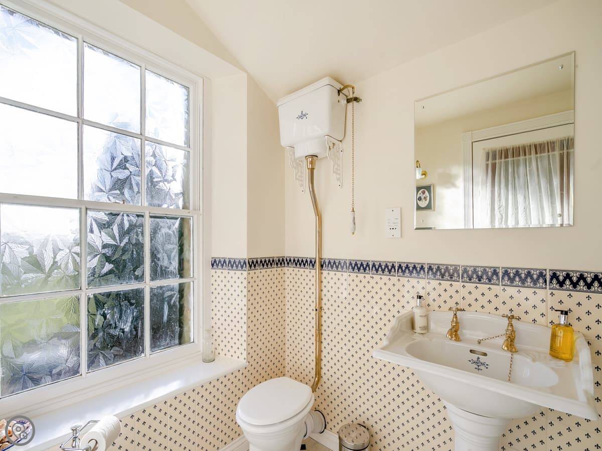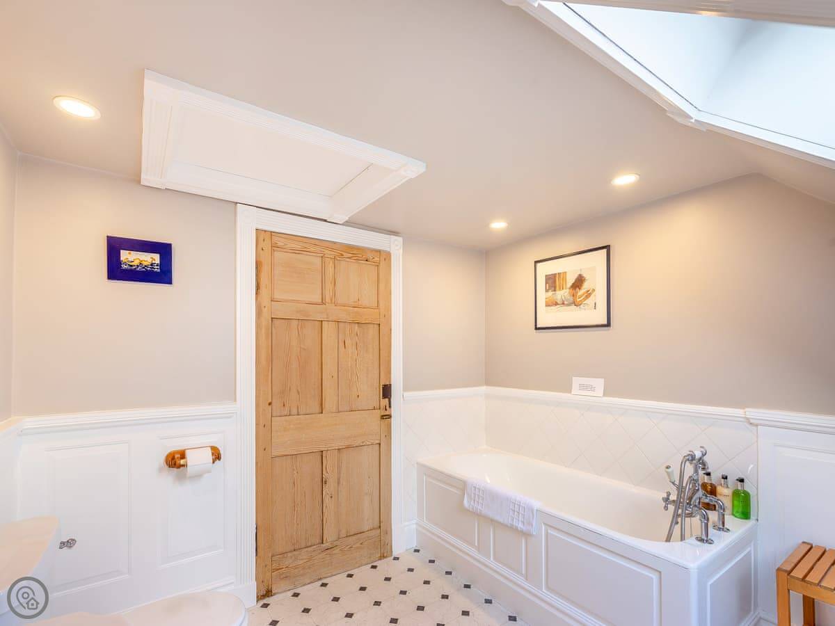 The master bedroom has a big roll-top bath in the en-suite. The main drawing room is Georgian, with high ceilings and an open fire. There's a dining room with a long table for fourteen. The kitchen has an Aga.