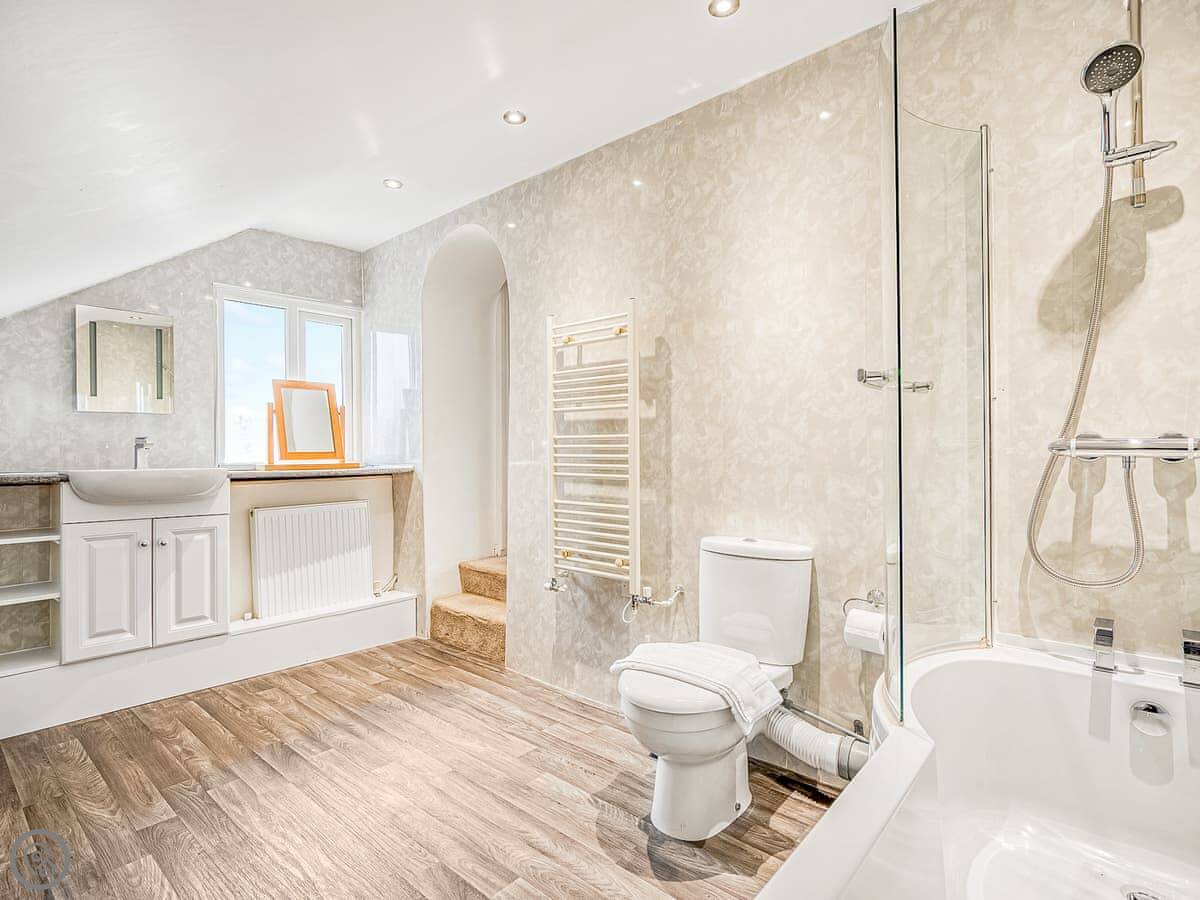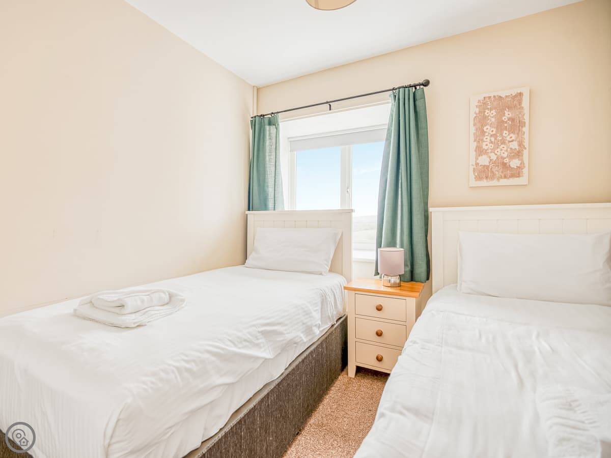 It sleeps ten. Five bedrooms, two bathrooms. It's got a 4 Star rating. It's spacious, not fancy. The main bedroom has a zip-and-link bed, so it can be a king or two singles. There's a log burner in one living room. You can buy logs at reception.