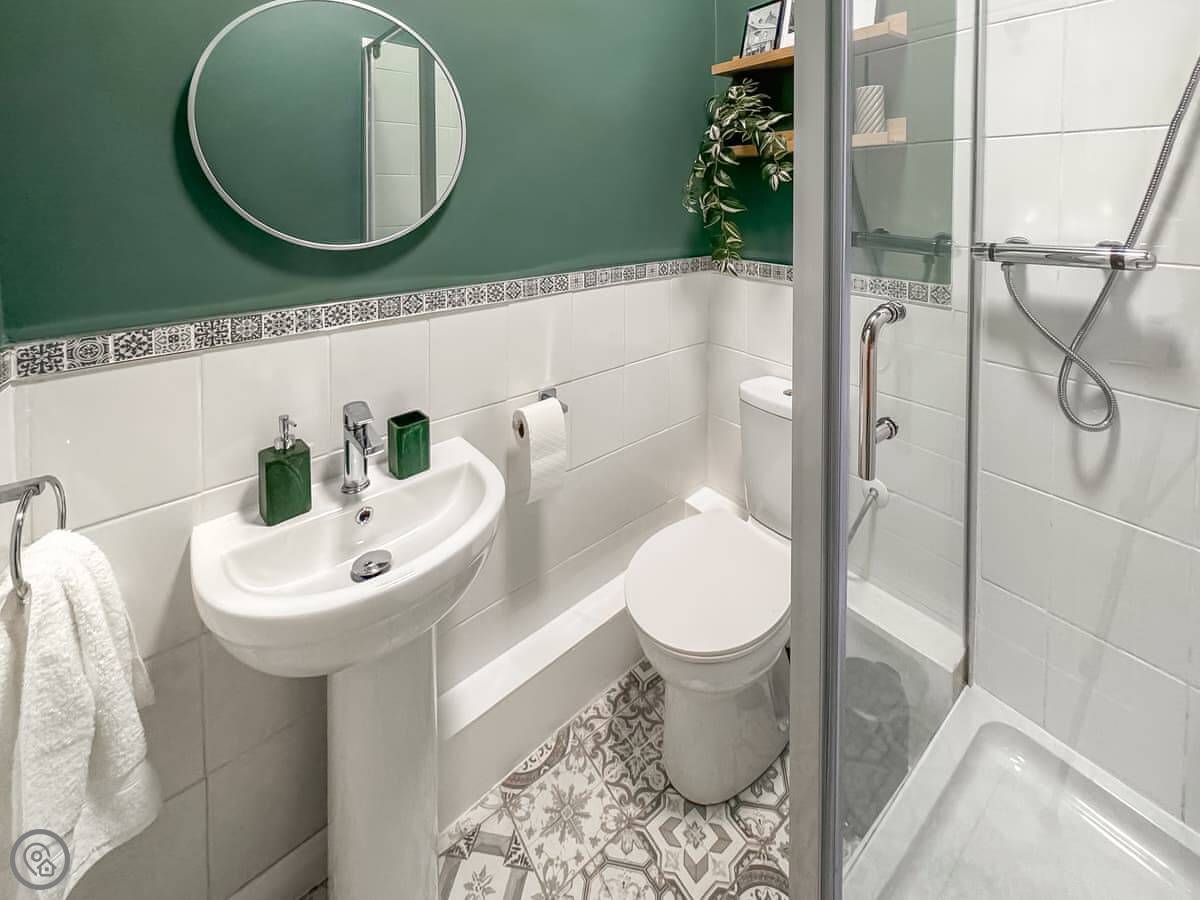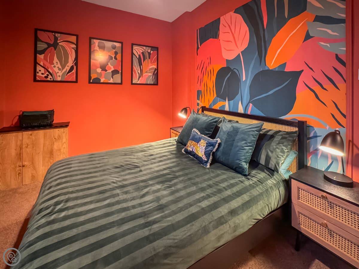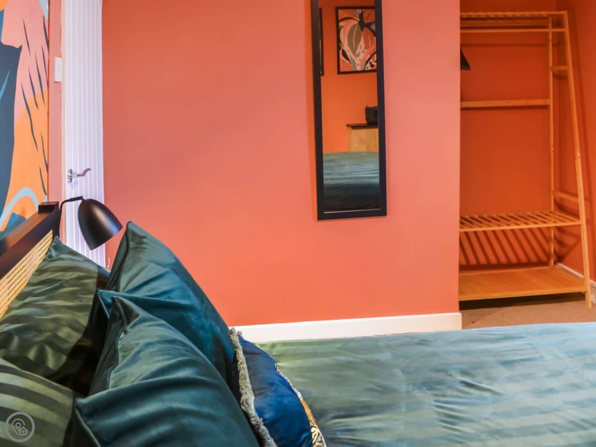 It's a simple place, decorated in greens and golds. There's a double bed in the bedroom and a sofa bed in the living room. The kitchen has everything you need and there's a light-up sign on the wall that the locals will recognise. The bathroom has a shower.