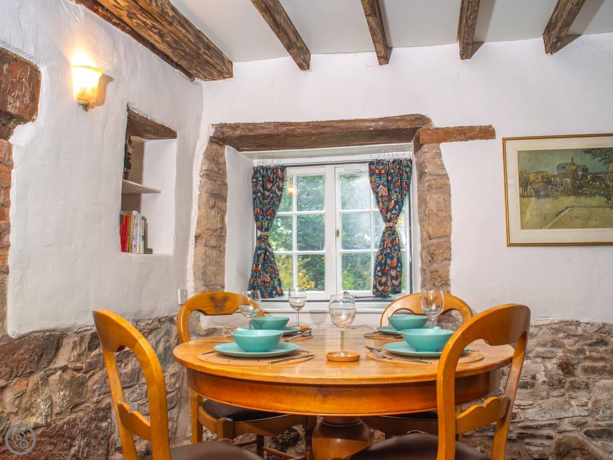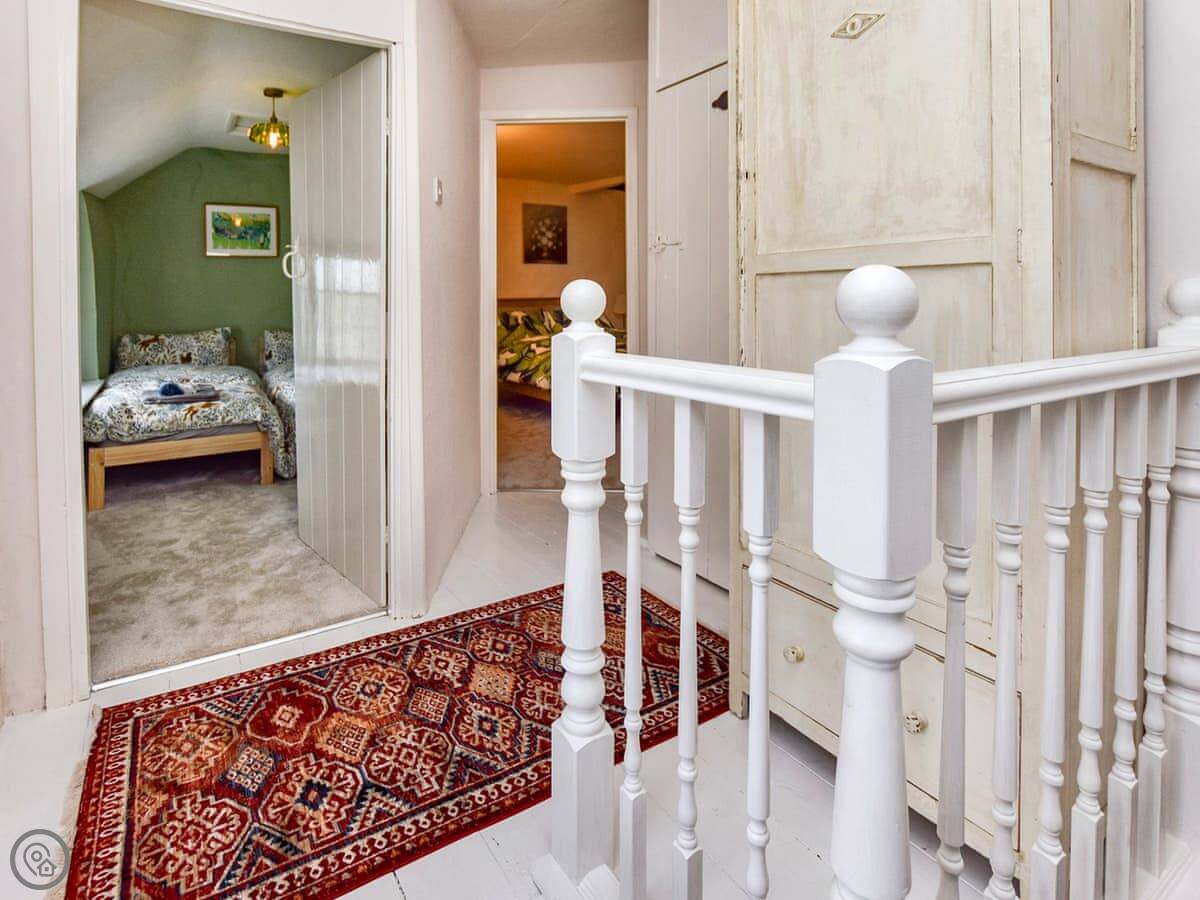 It sleeps four. Two bedrooms, one with a double bed and one with two singles. One bathroom with a shower cubicle. It's got a 4 Star rating, so it's comfortable and well looked after. The ceilings are low in places, which is normal for a place this old. Mind your head.