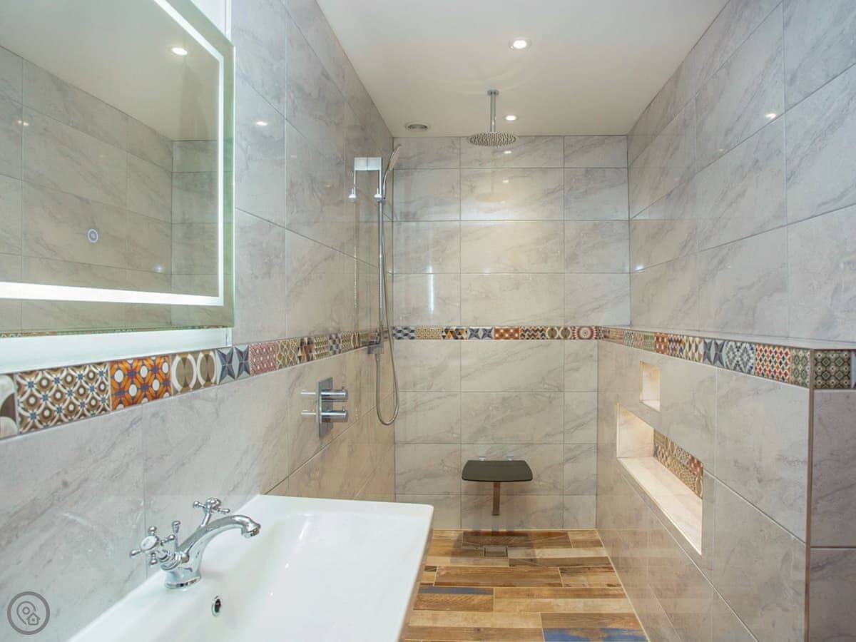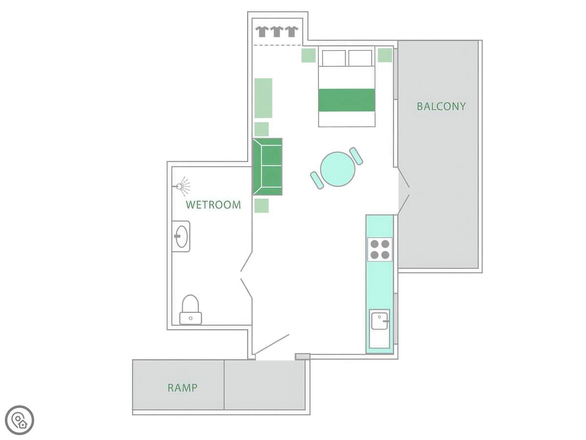The apartment sleeps two. One bedroom, one wet room shower. It's got a 4 Star rating. It's been designed for less able guests. The doorways are wide, the kitchen worktops are lower, and there are grab rails in the wet room. There's a shower seat too. Everything is on the ground floor.