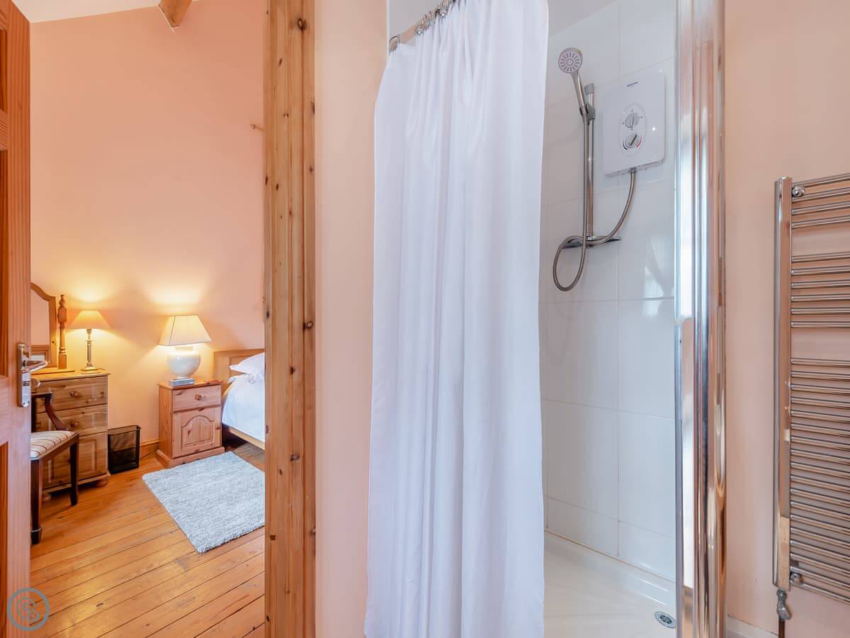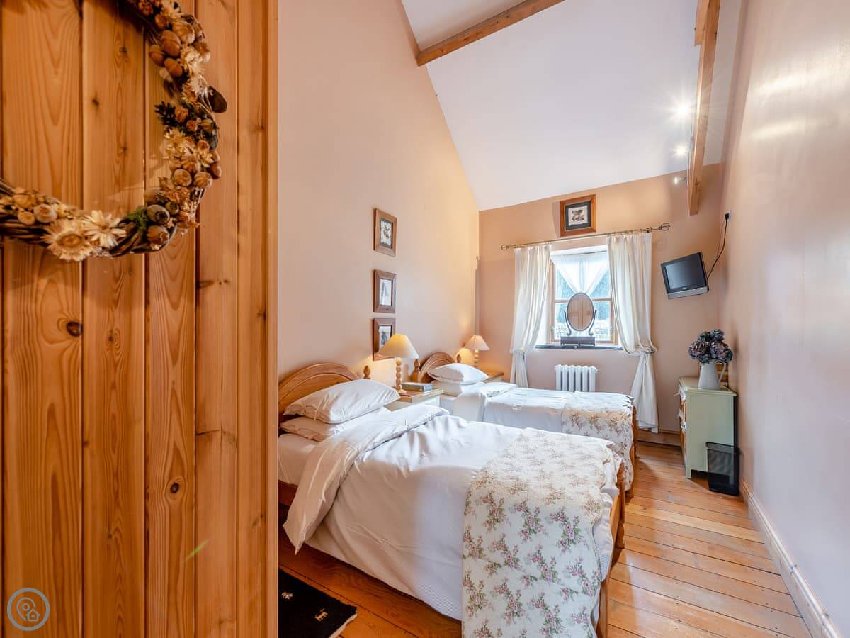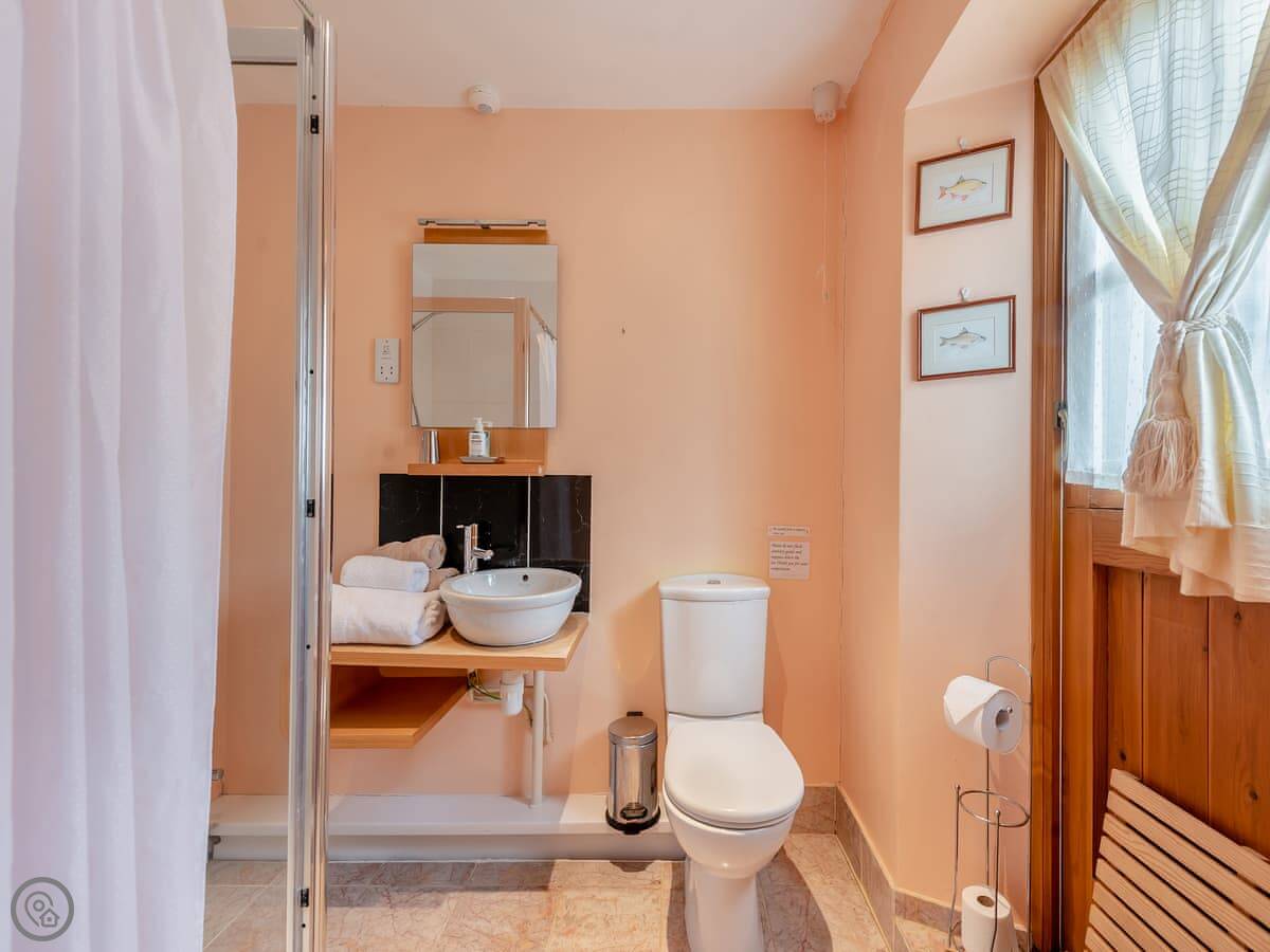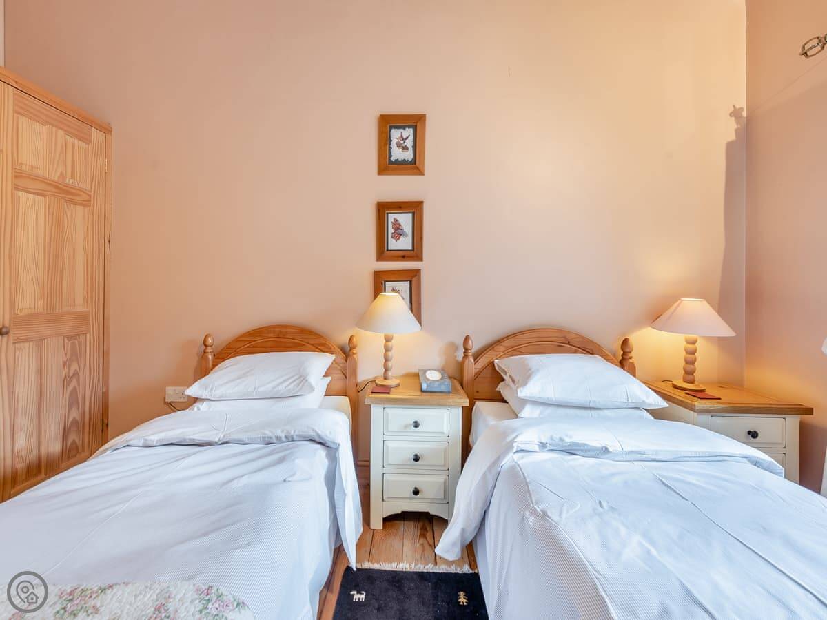 It sleeps five. Two bedrooms, two bathrooms. One bedroom is on the ground floor with twin beds. There’s a family bathroom down there with a bath and shower over it. The main bedroom is upstairs with a king-size bed and its own shower room.