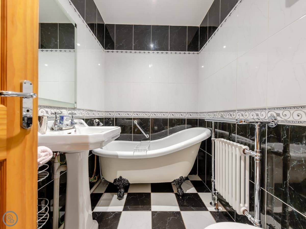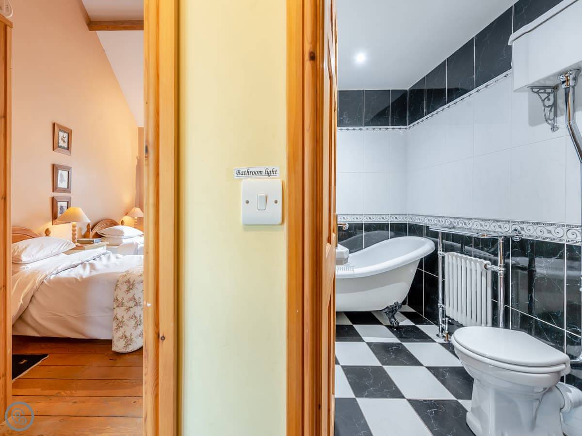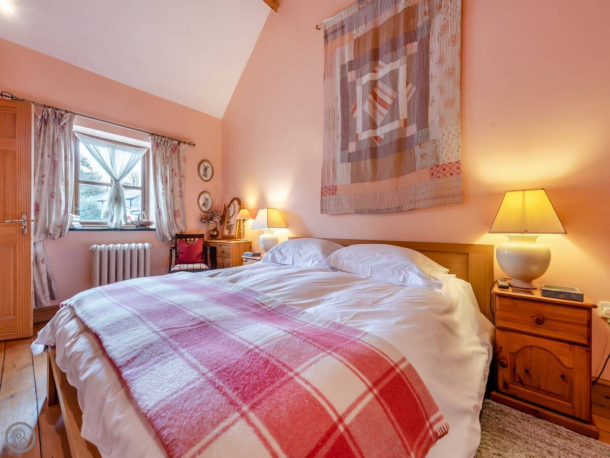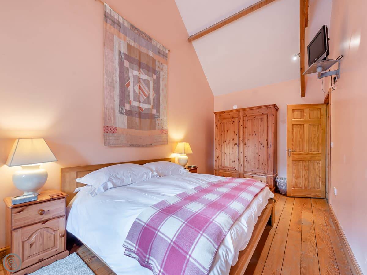 It sleeps five. Two bedrooms, two bathrooms. One bedroom is on the ground floor with twin beds. There’s a family bathroom down there with a bath and shower over it. The main bedroom is upstairs with a king-size bed and its own shower room.