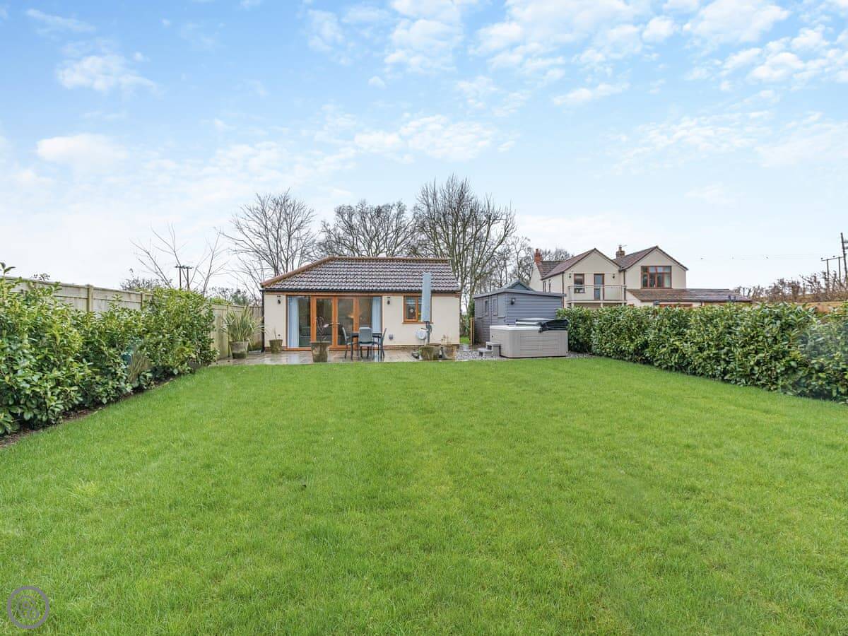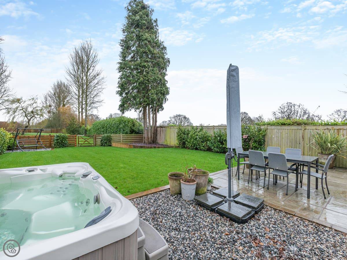 The main living space is all open plan. Big doors lead out onto the lawn. The garden is enclosed and has a hot tub.