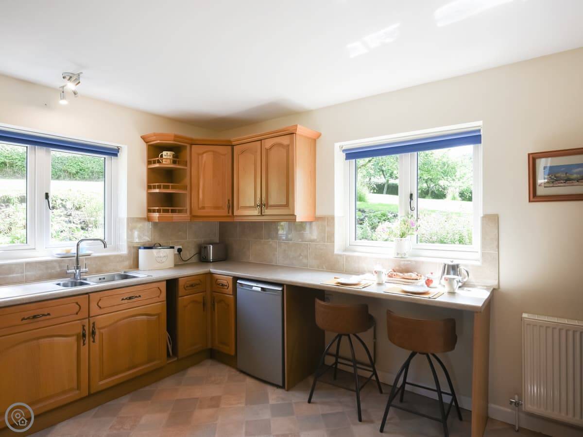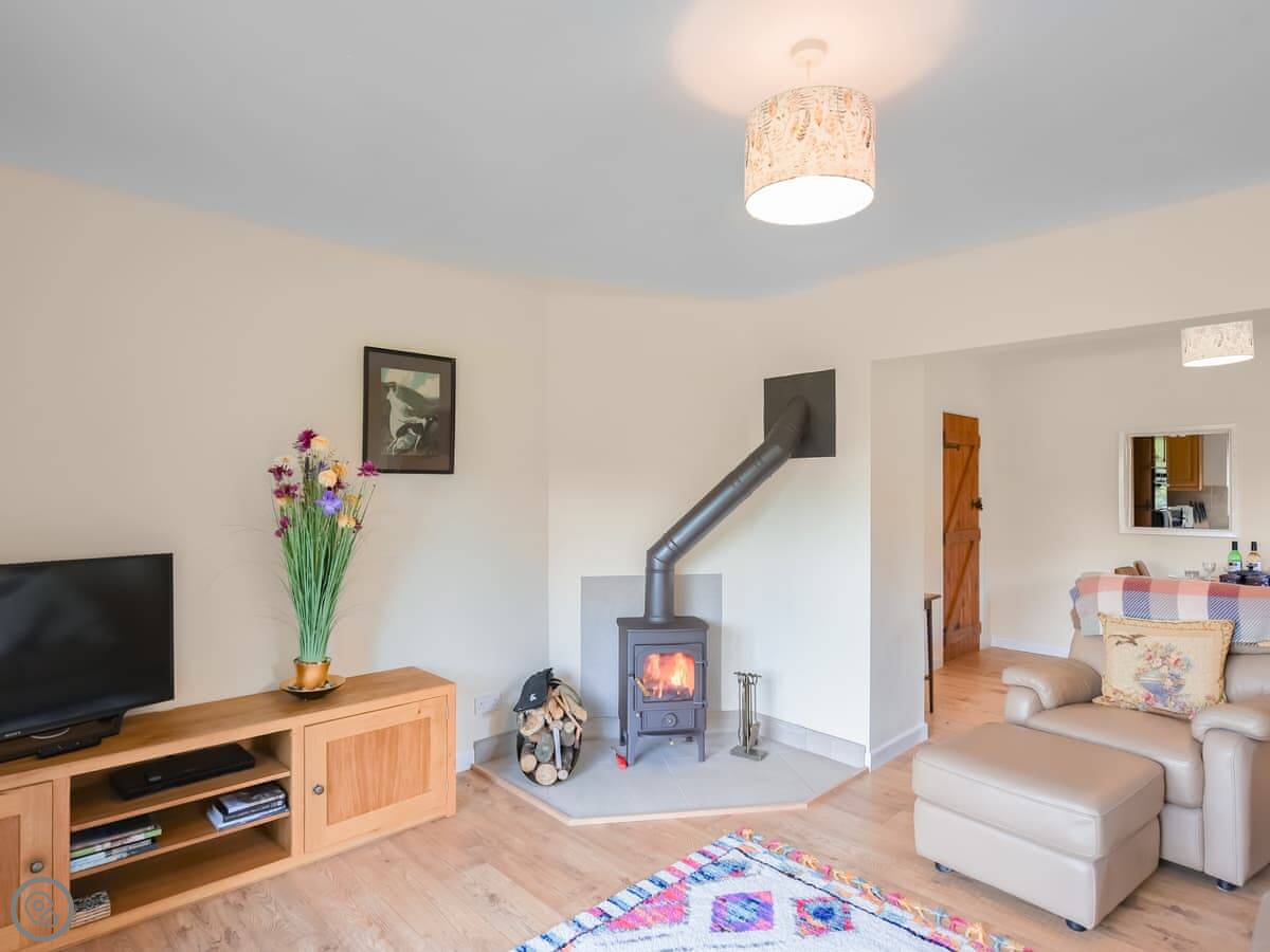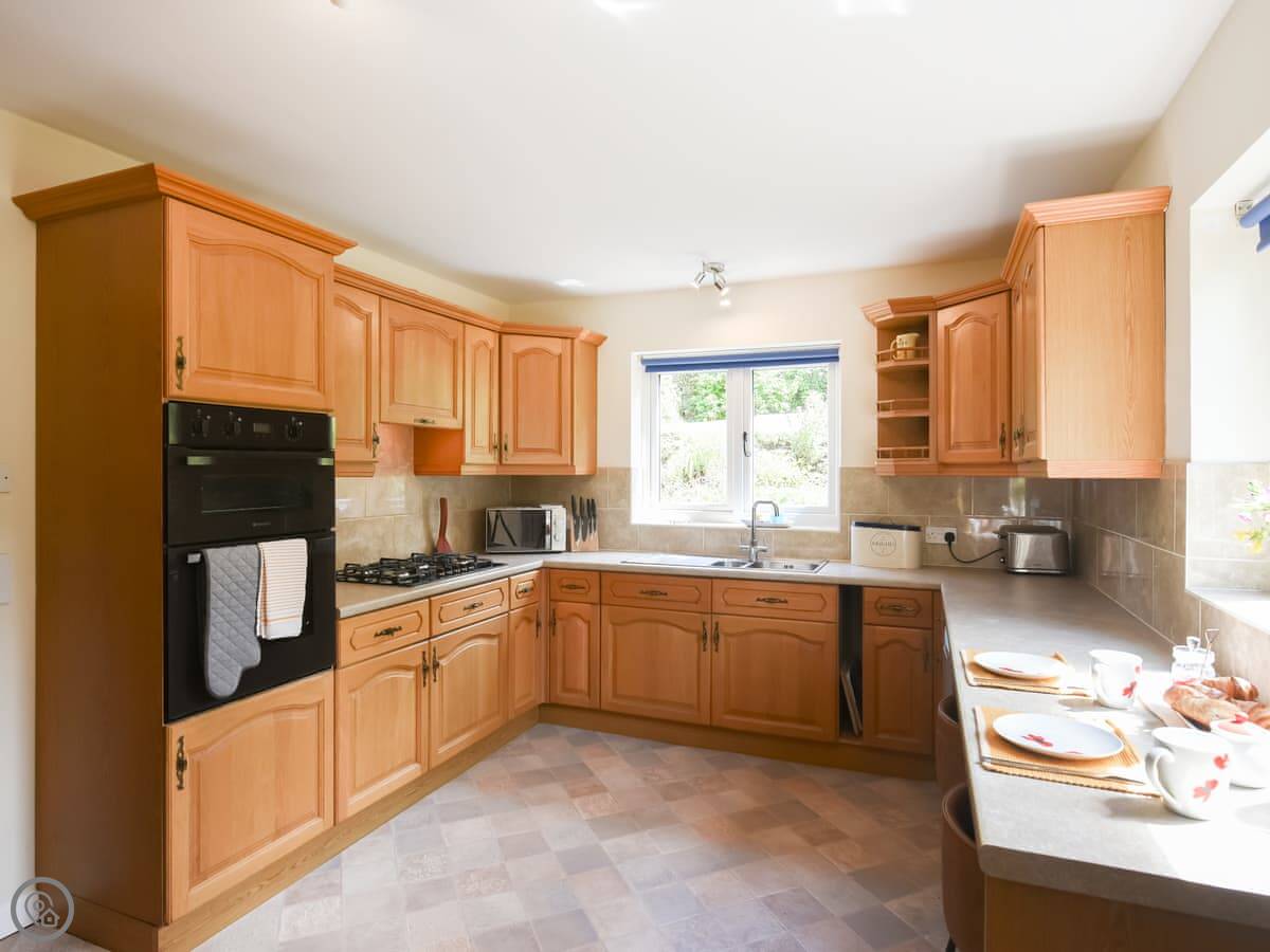 Inside, it's open plan downstairs. The kitchen's big, with a large hob and double oven. There's a sitting area with a log burner, and a sofa. We supply a basket of logs to get you started. There's a utility room with the washing machine and a downstairs loo.