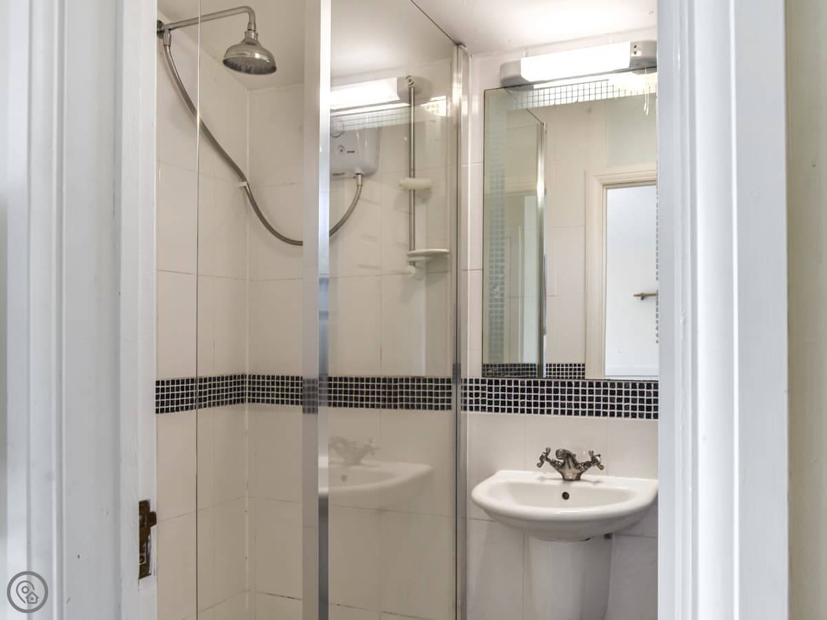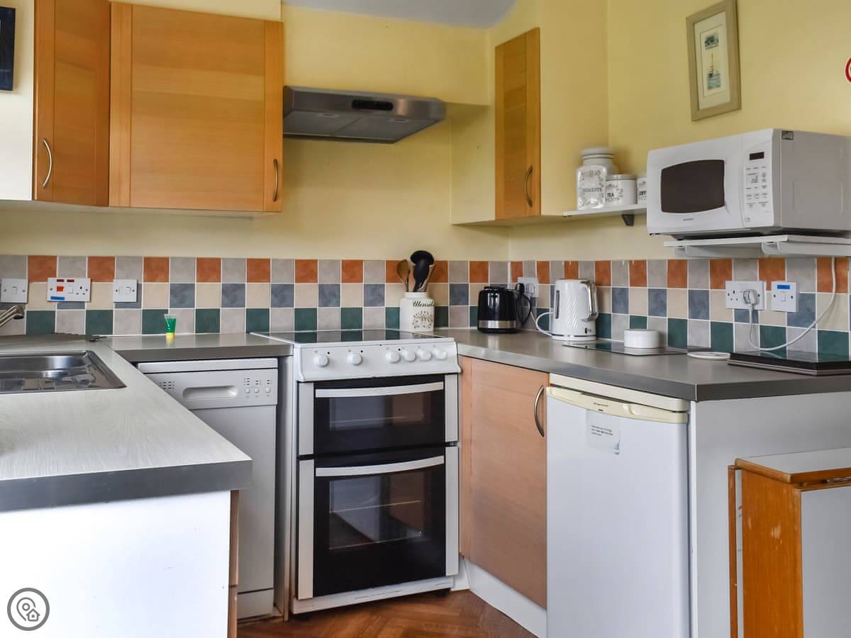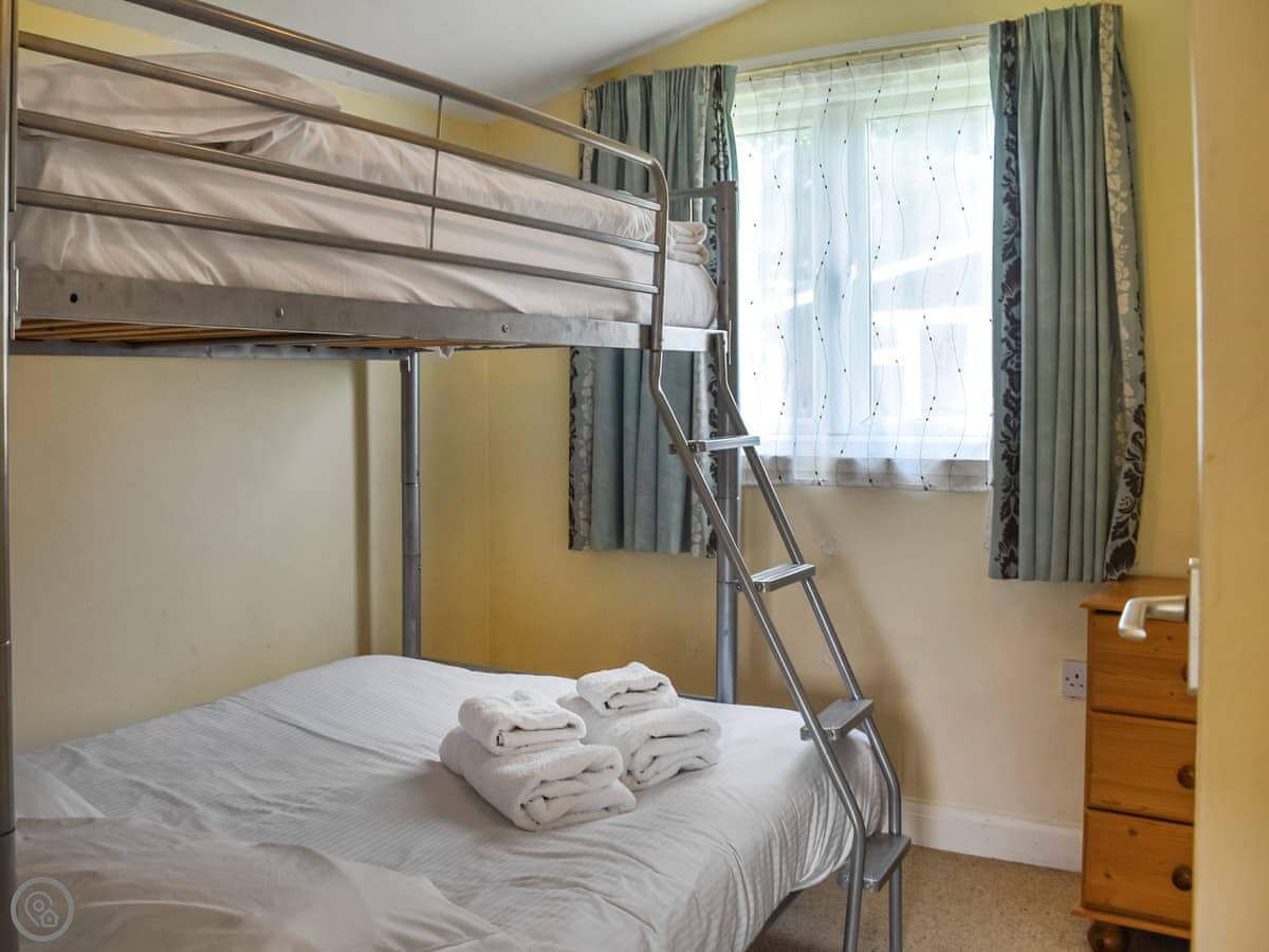 You've got one bedroom with bunk beds, the bottom bunk is a double. The other room is a standard double. The bathroom has a decent sized shower. The living space is all open plan, with a kitchen at one end. There's a washing machine and a dishwasher.