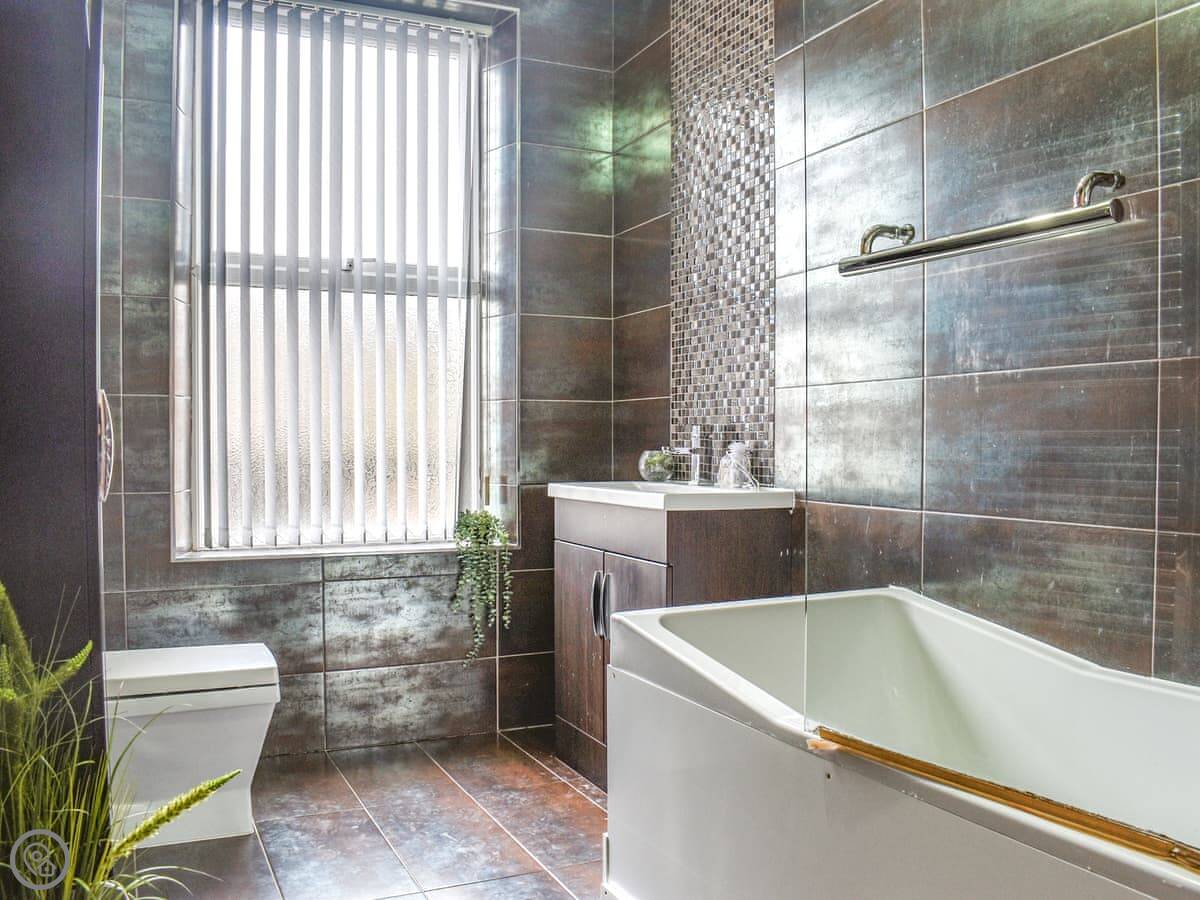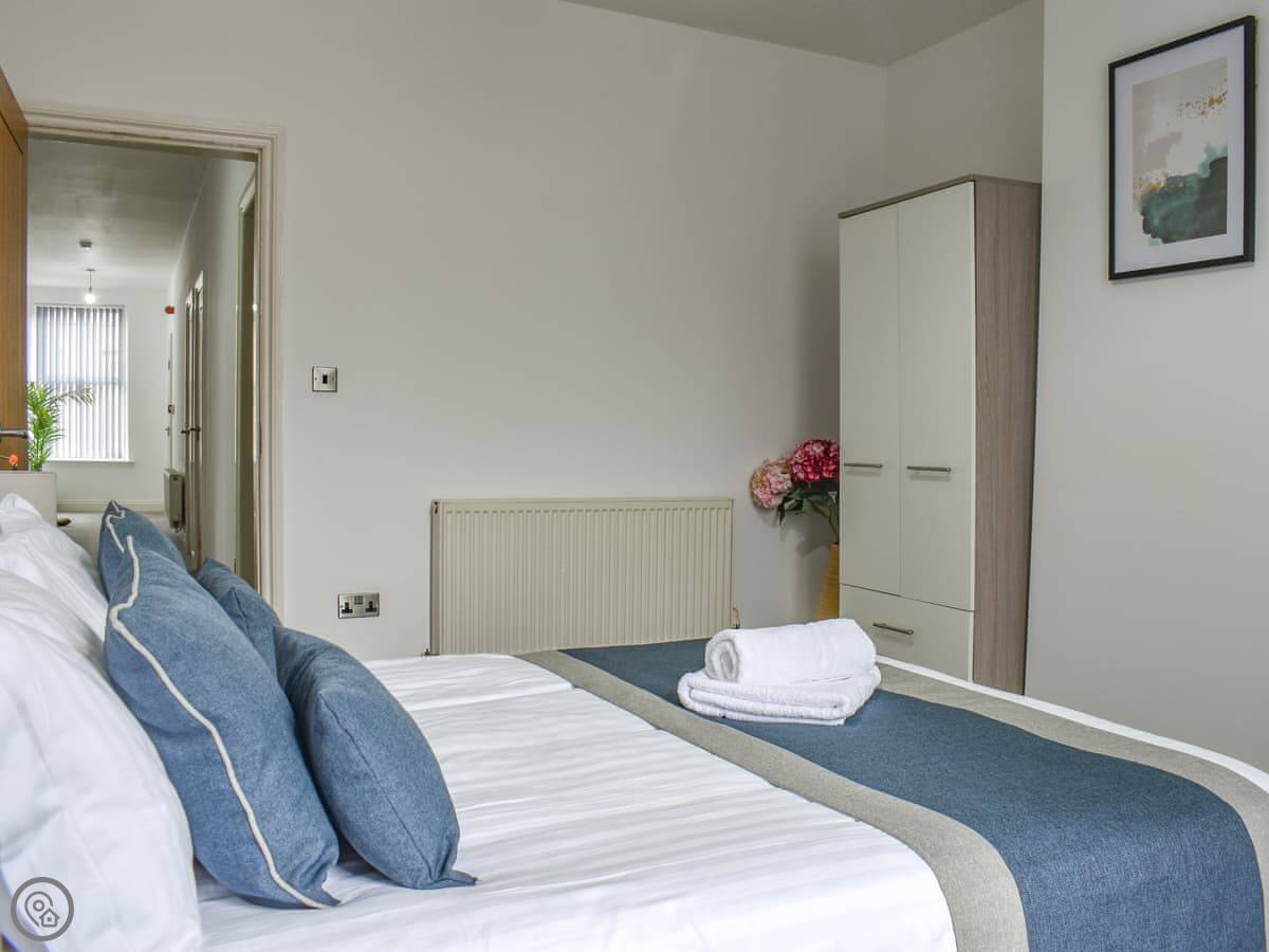 It sleeps six in three bedrooms. They're all doubles. The third bedroom is a bit smaller than the other two. There's one bathroom with a bath and shower, and a separate toilet. It's a 4 Star place, so it's comfortable and has what you need. Everything is straightforward.
