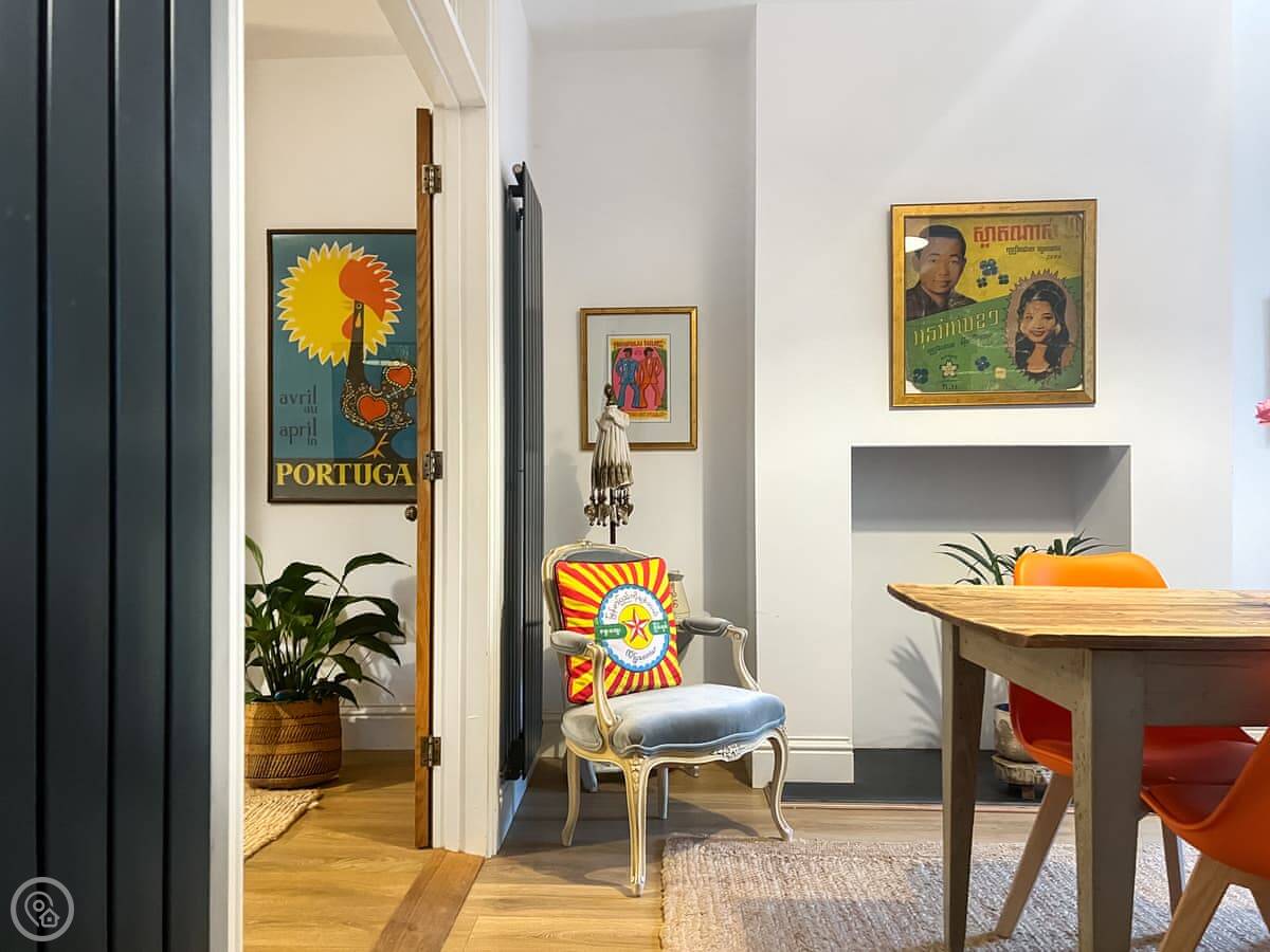 The layout is simple. Downstairs is a living room, a dining room, and a kitchen that has what you need. Upstairs are the two bedrooms and one bathroom. The bathroom has both a shower cubicle and a bath. Outside the back is a small, enclosed courtyard. It's private and gets the sun in the morning.