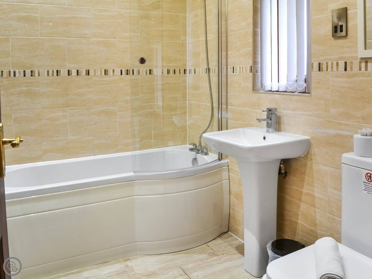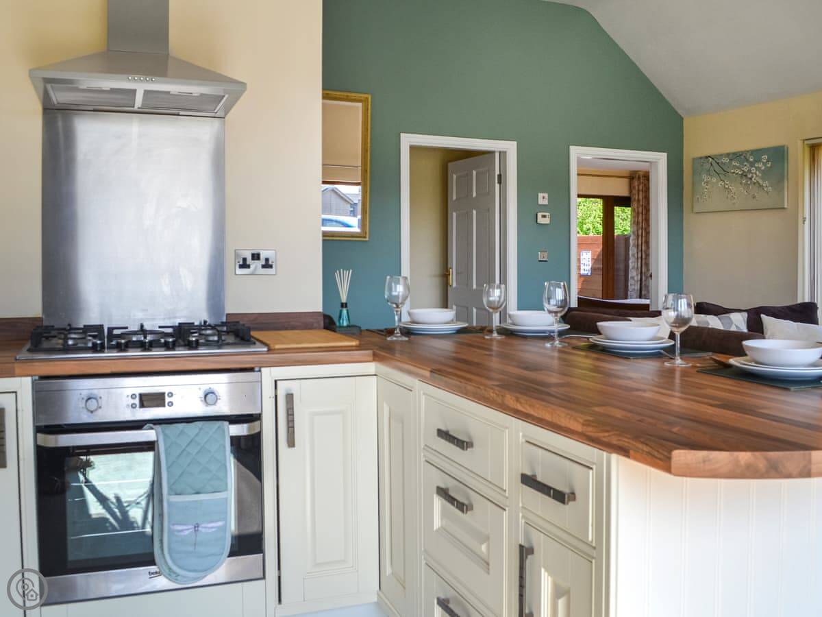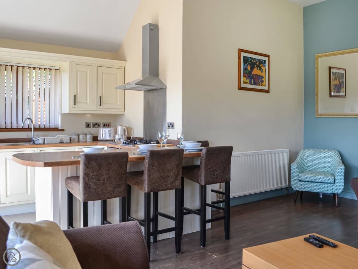 It's got a 4 Star rating. It's modern and comfortable. The living area is open plan with big windows. There's a Smart TV and an electric fire. The kitchen has a breakfast bar that seats four. A washing machine is in there too.