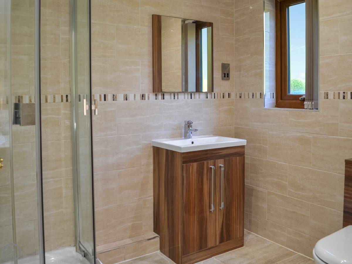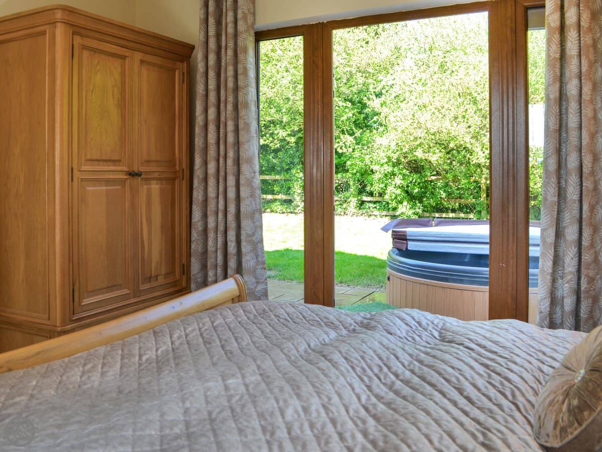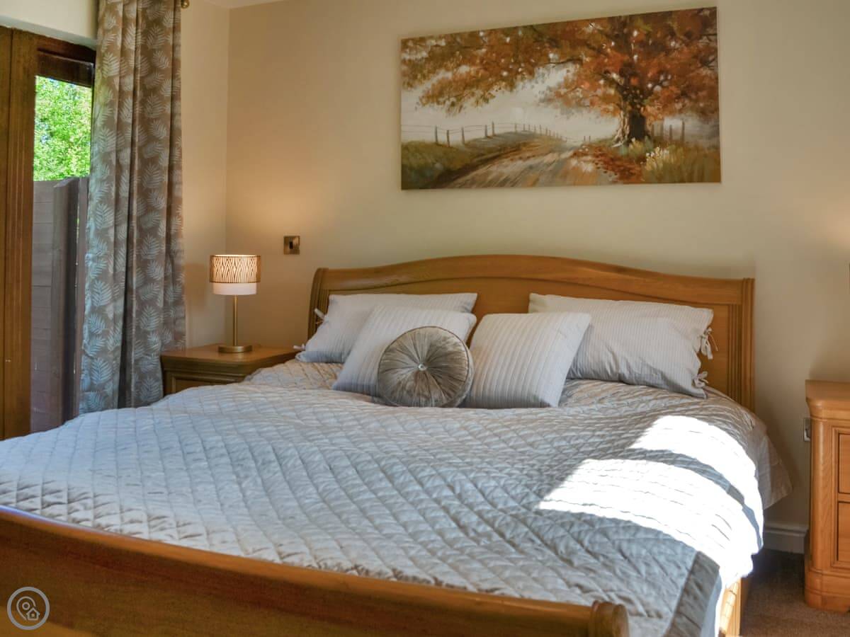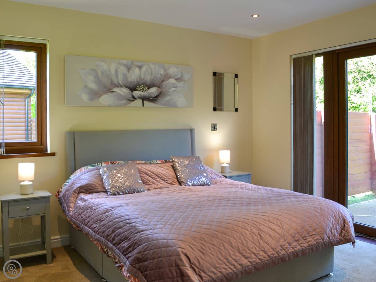 The lodge sleeps four. Two bedrooms, two bathrooms. Both bedrooms have doors straight out to the garden. One has a super kingsize bed, the other a kingsize. The bathrooms are ensuite, so one each, which is handy. One has a bath, the other a shower.