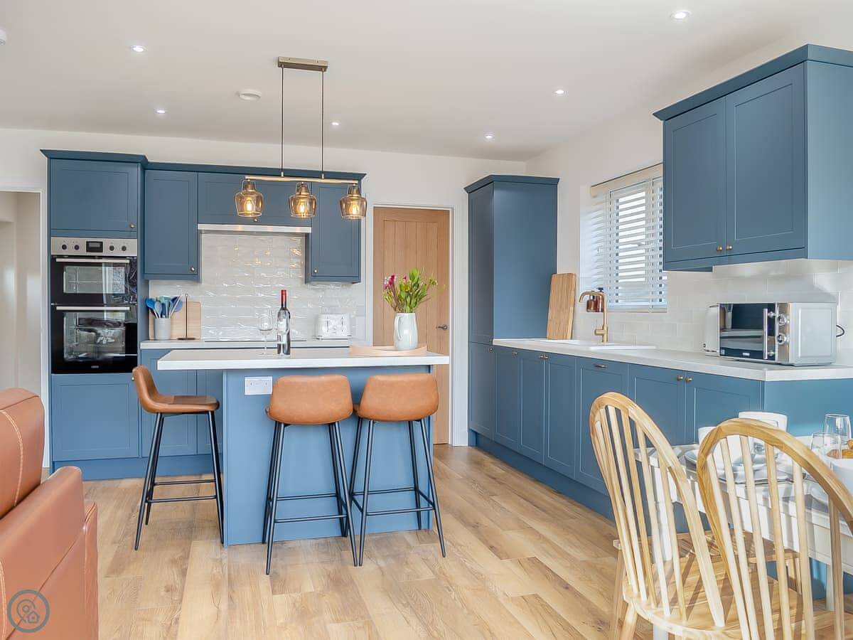 The beach is about a five minute walk away. It's sandy and usually quiet. The house itself was newly furnished in 2025. The main living area is open plan, with a wood burner. There's a table big enough for everyone to eat together.