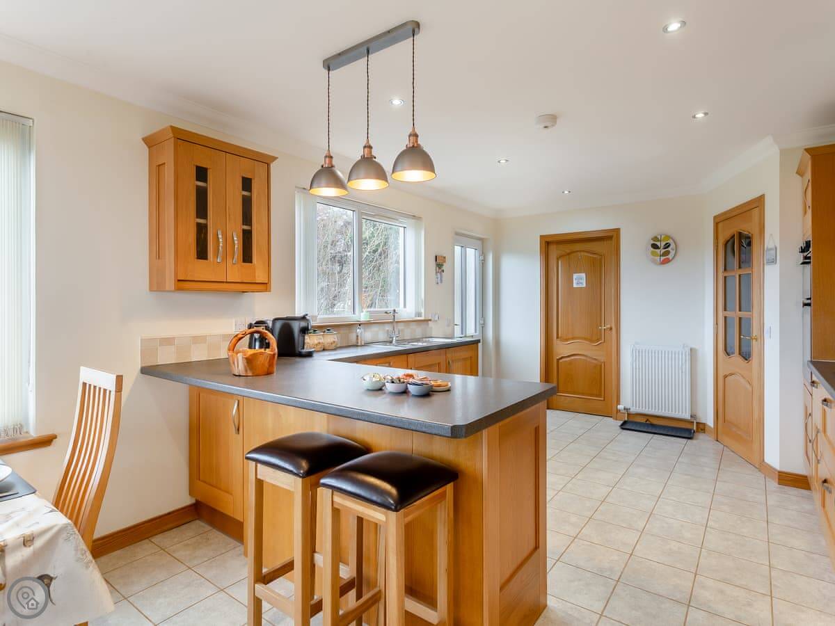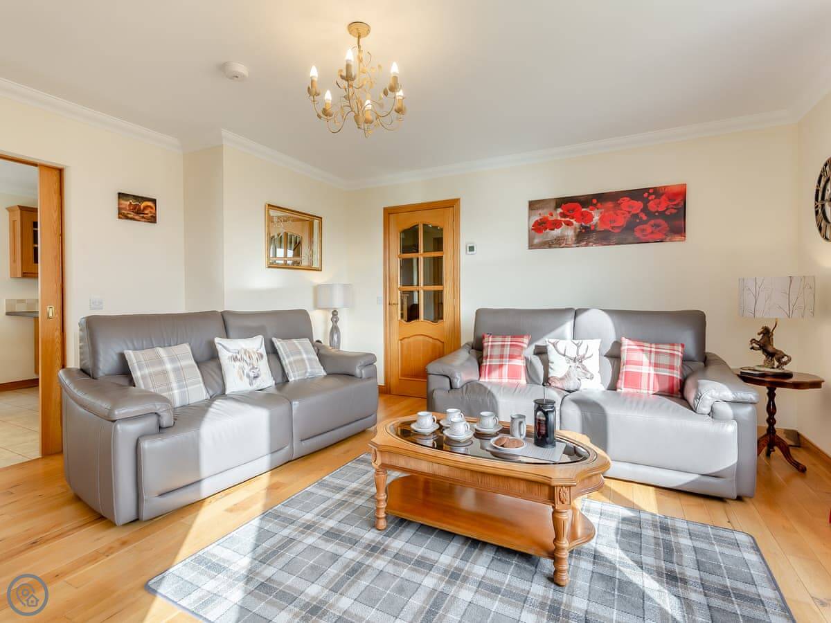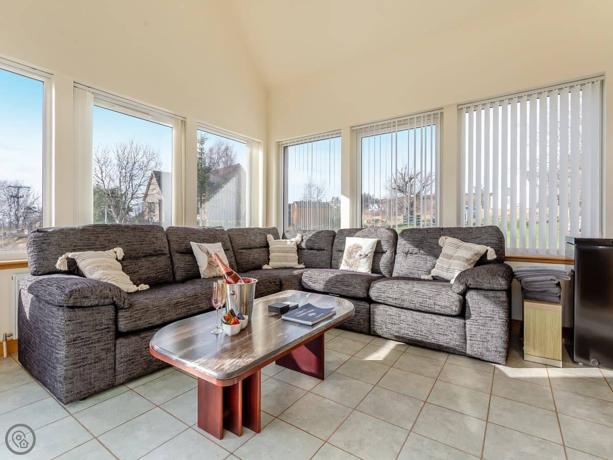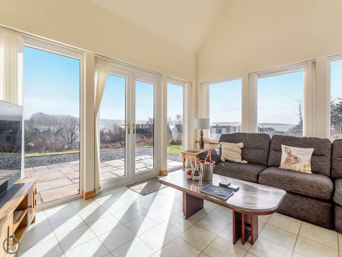 The place sleeps seven. Four bedrooms, three bathrooms. It's got a 5 Star rating, which means it's well kitted out and in good order. There's an open fire in the lounge, and the sunroom is the spot to be. The views from there are the main thing, really.