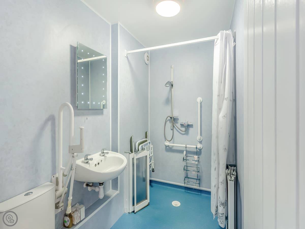It's a two-bedroom place that sleeps four. One bathroom with a walk-in shower. It's got a 4 Star rating, which means it's well-equipped and in good condition. It's also set up for wheelchair access, with grab rails and level access from the parking space.