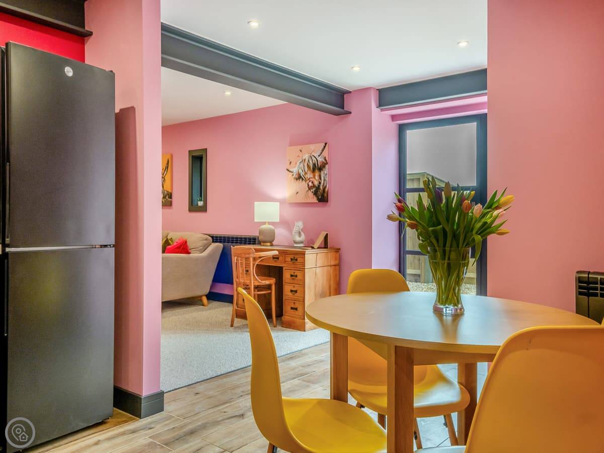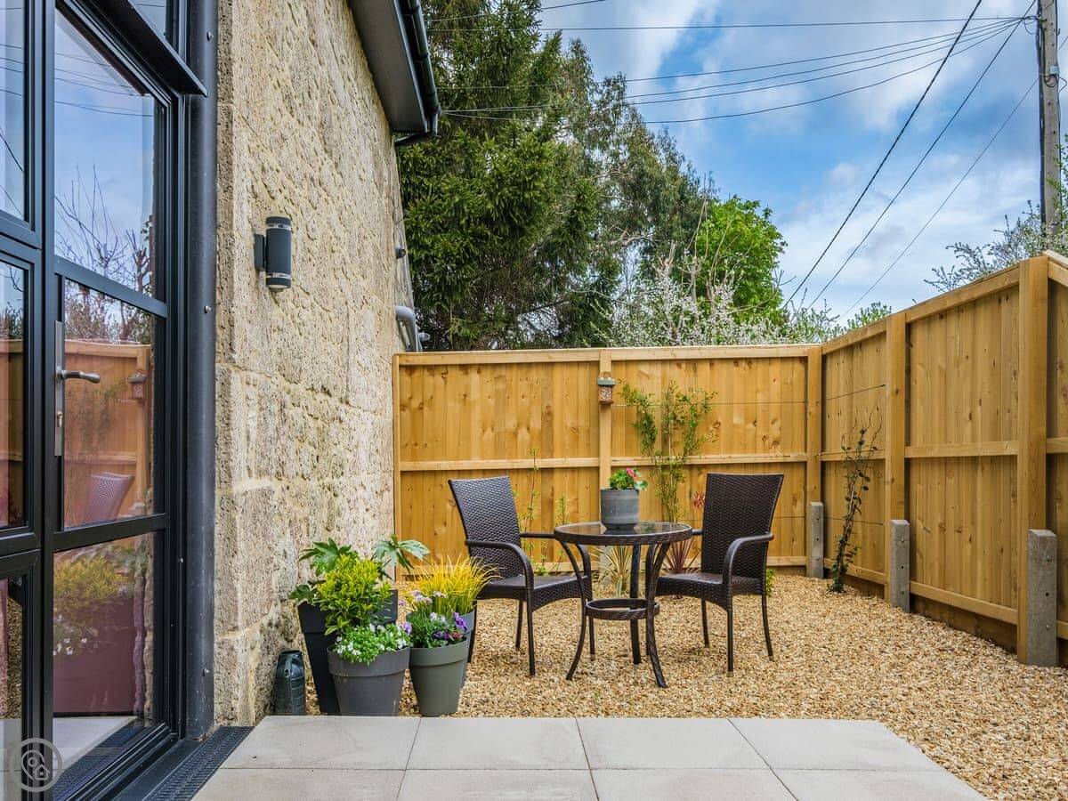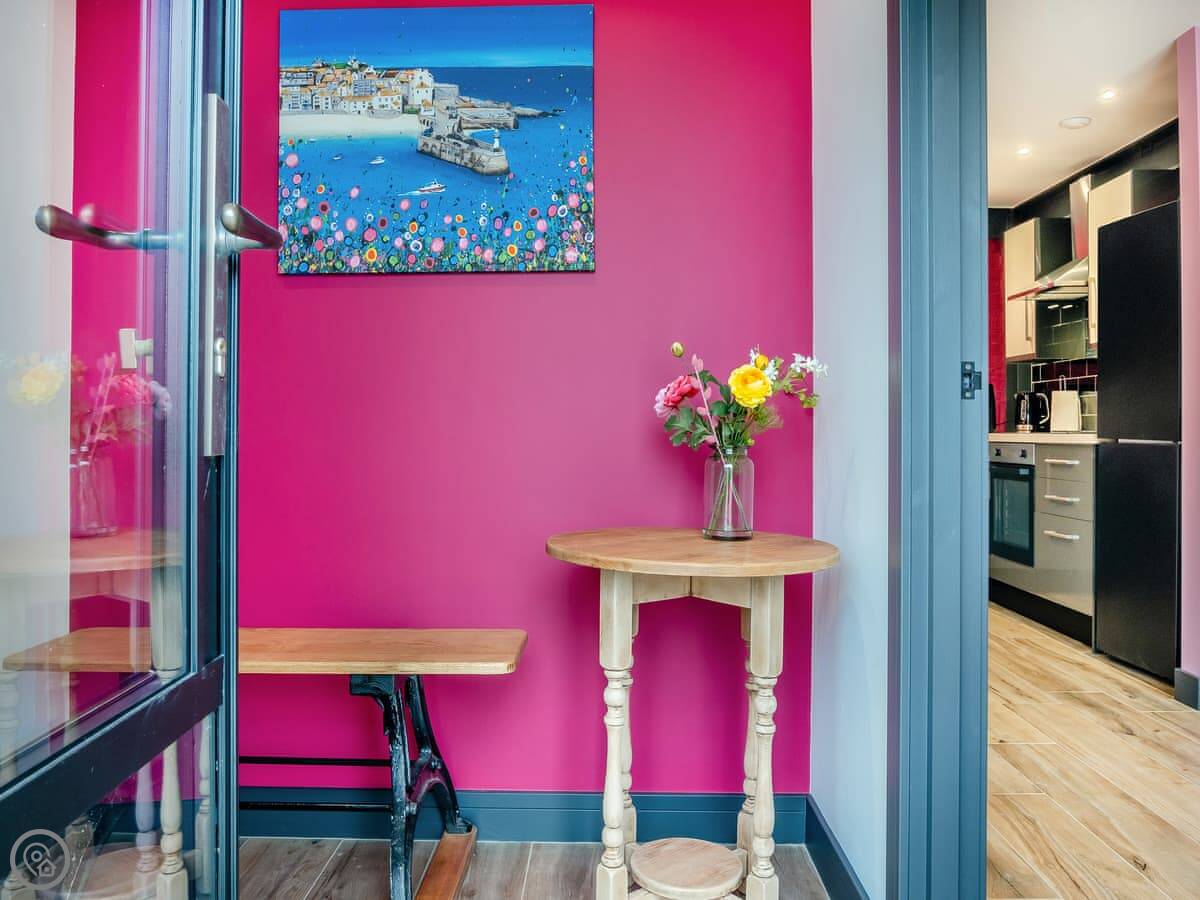 The Hideaway is an apartment attached to the Chessell Pottery Cafe near Shalcombe. It's ground floor, so no steps to worry about. The cafe courtyard is right outside.
