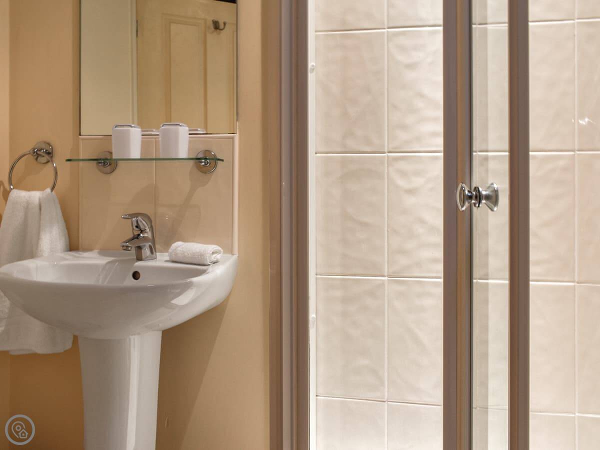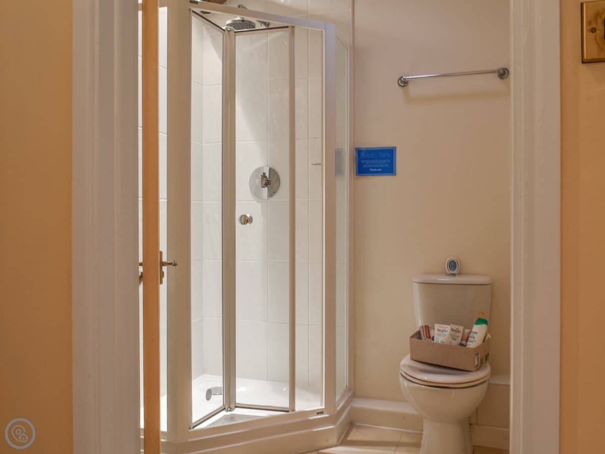 The bedroom has a Velux window in the roof. The shower is a good size. The walls inside are the original stone, which looks nice.