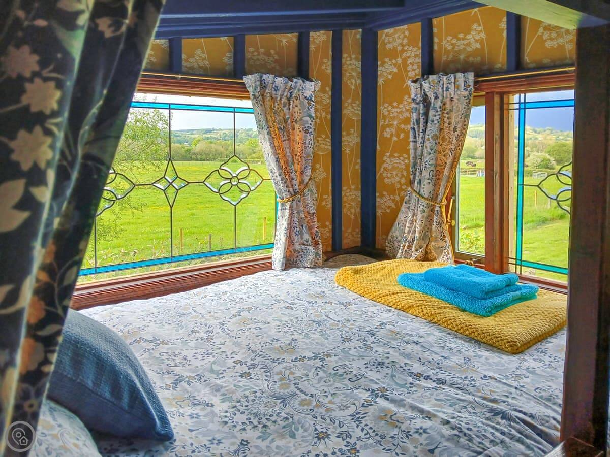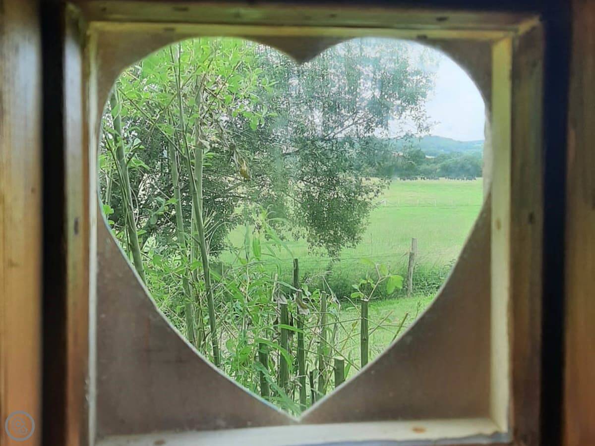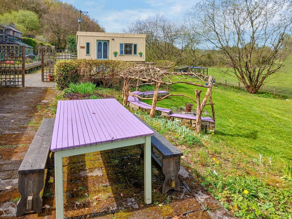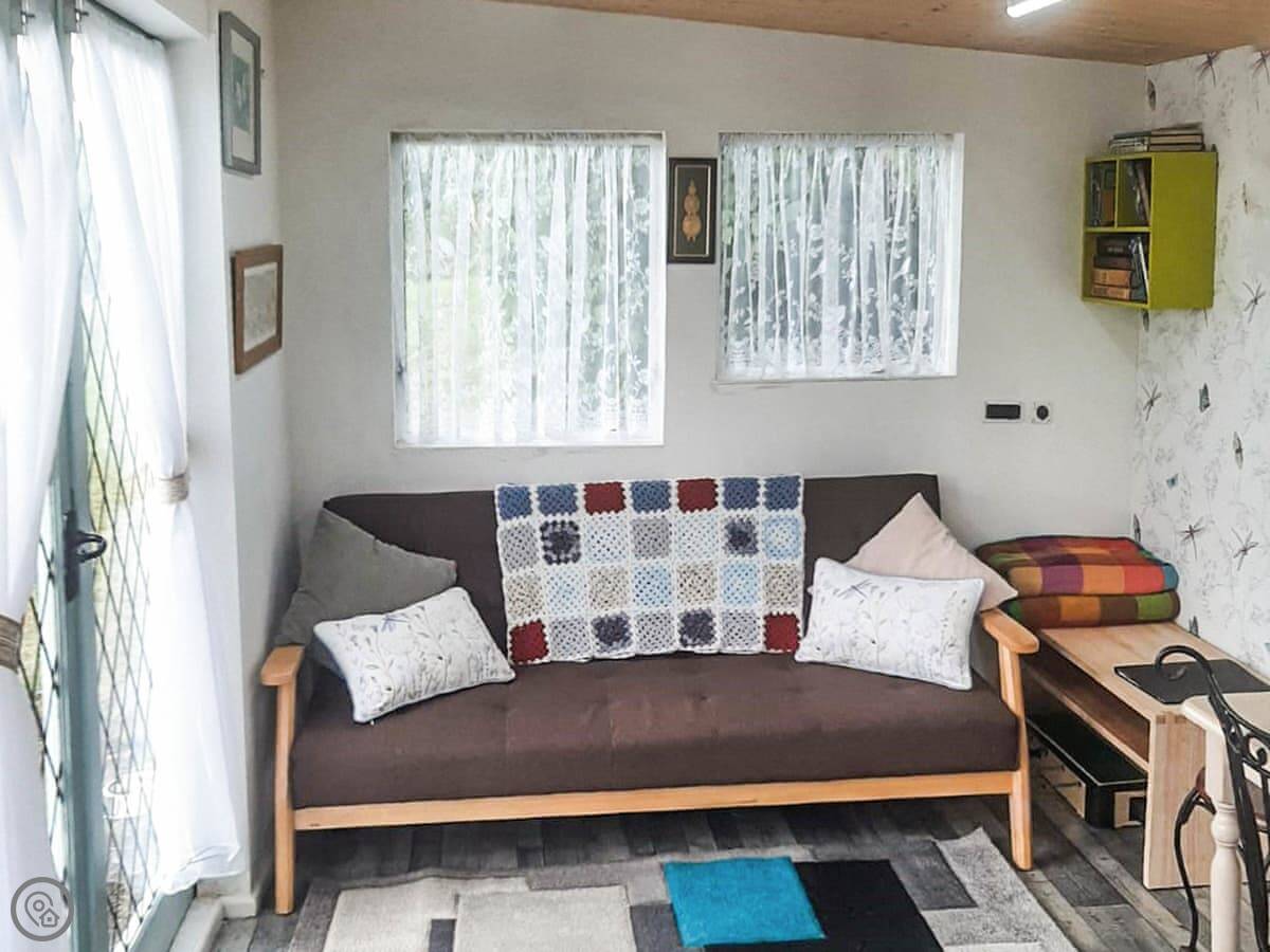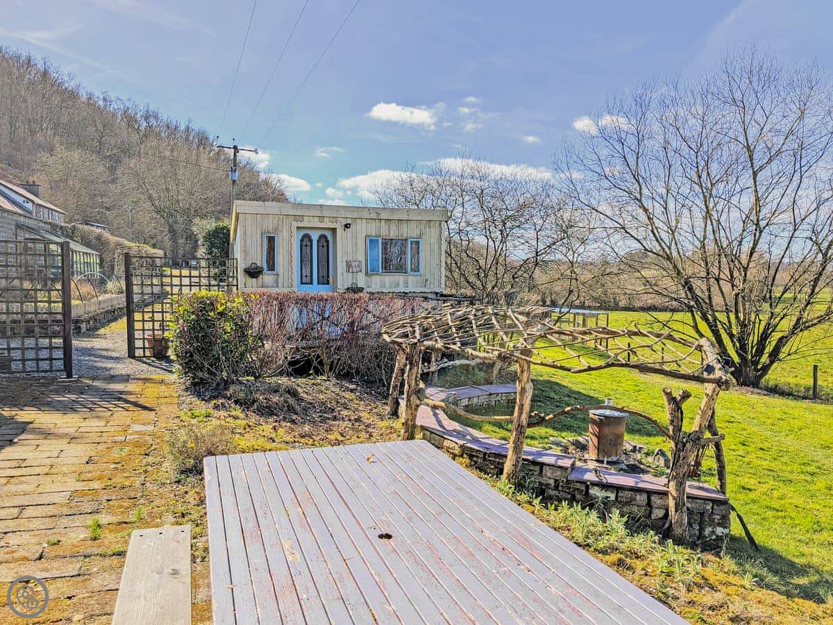 It's properly off-grid. There's solar power for lights and to heat the water for the shower. The shower and toilet are in separate huts just outside. It’s all very simple and back-to-basics. There’s a gas cooker, and a wood burner for heat. The bedroom is in a separate little hut from the main living space. You've got over an acre of ground to yourselves.