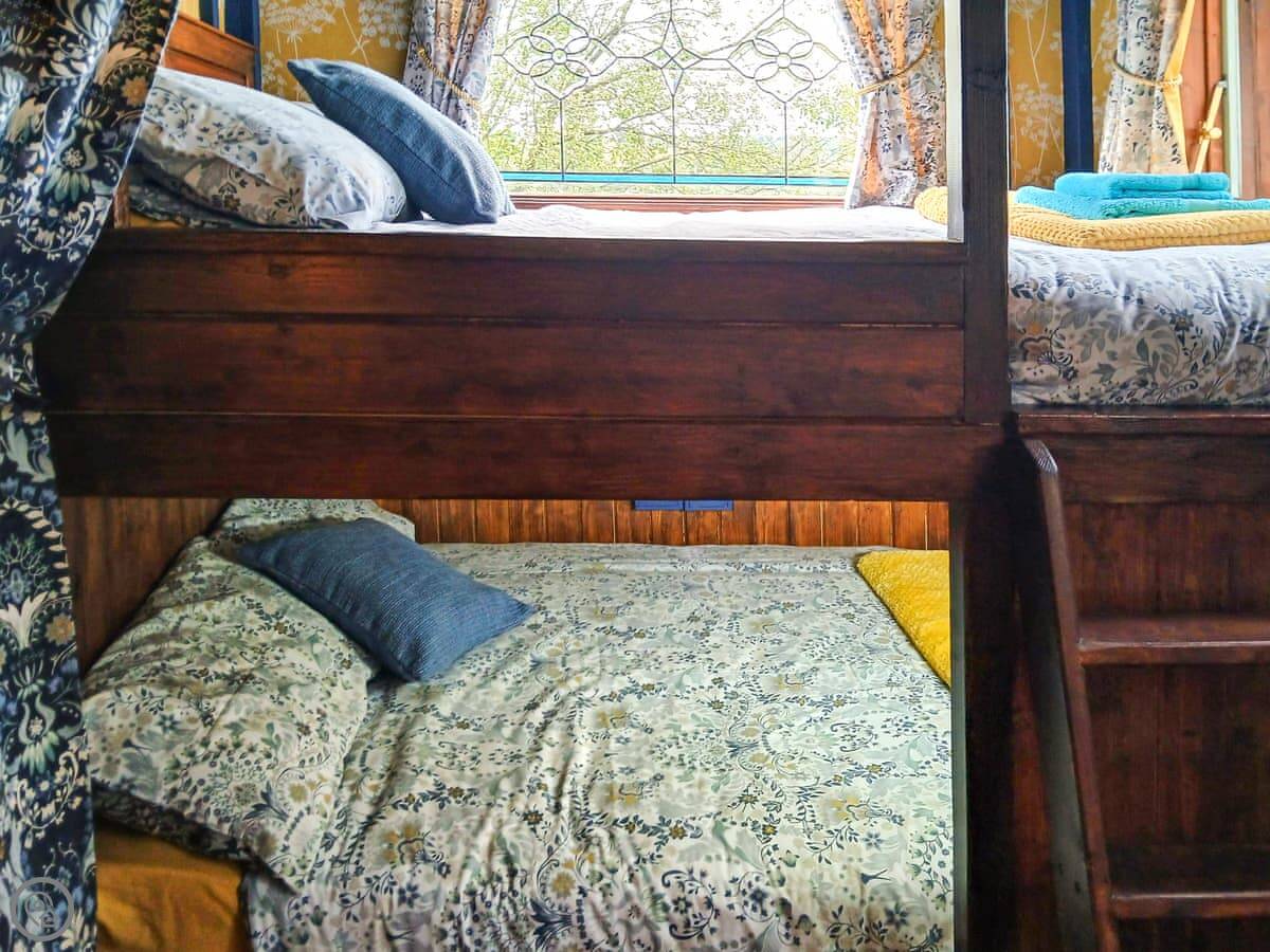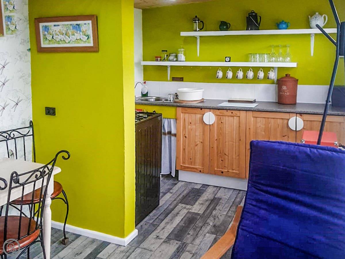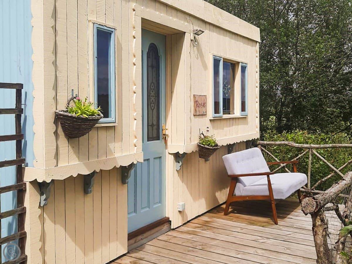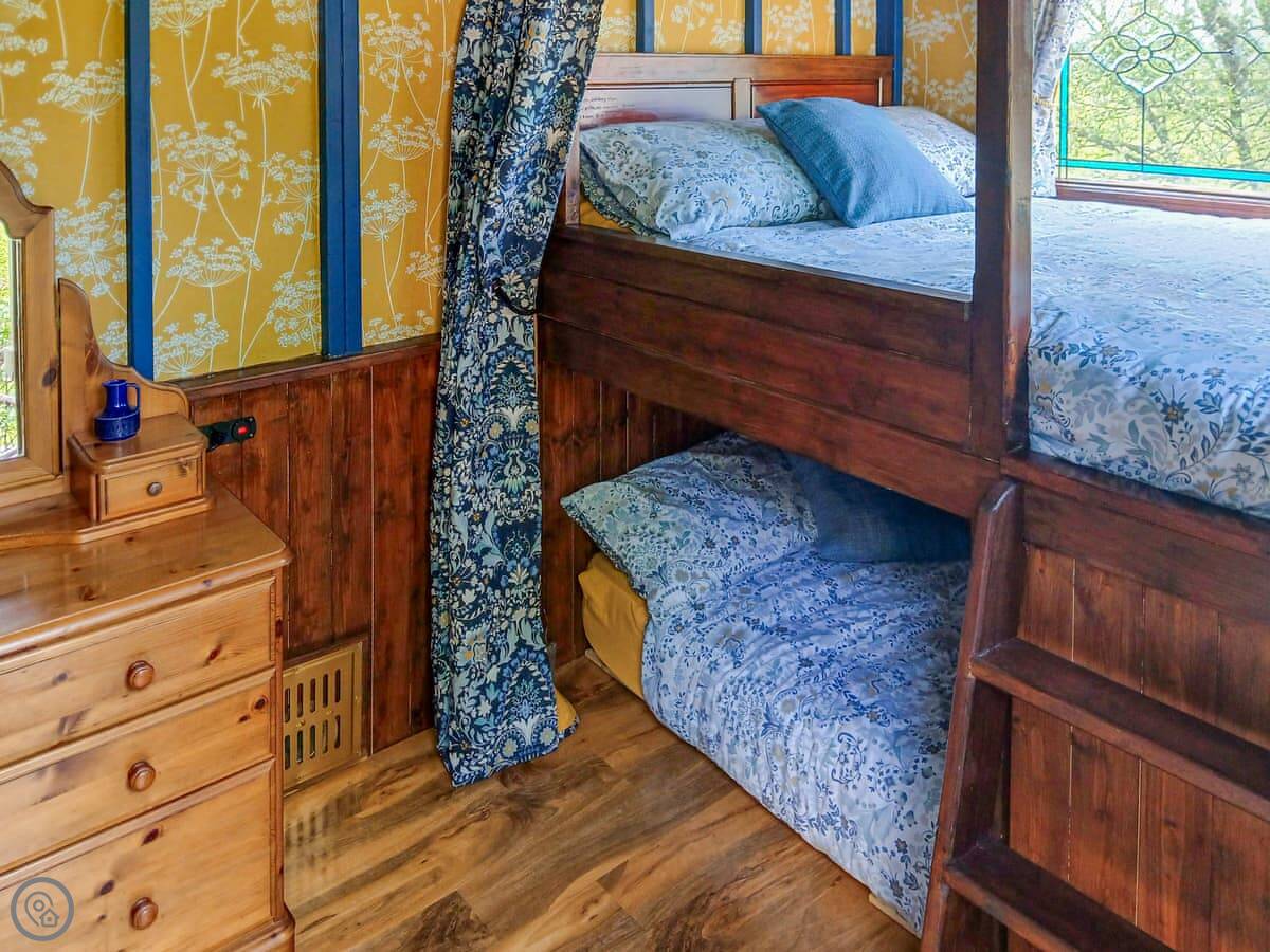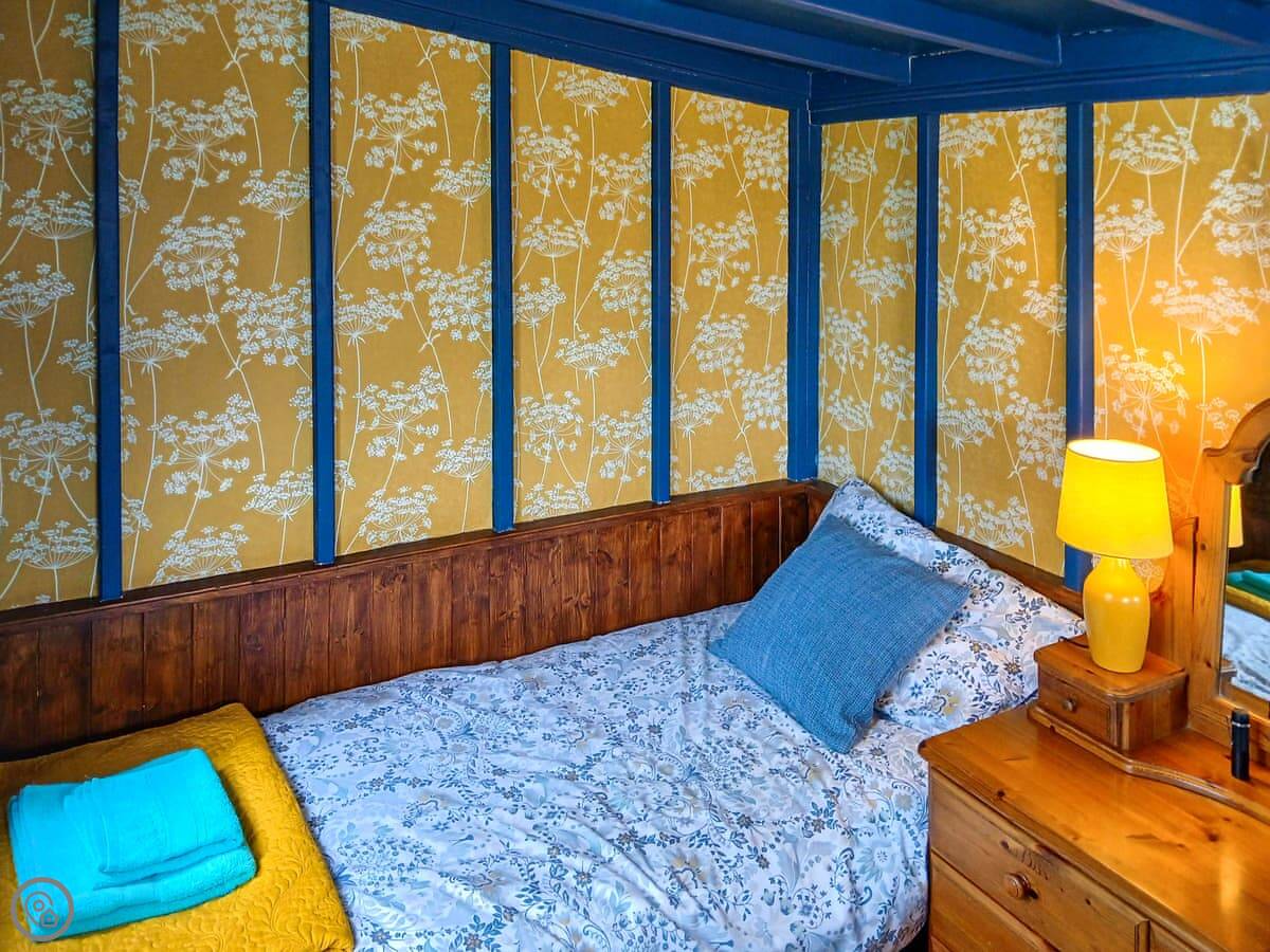 This is Rosie. It’s a self-contained little place near Pencarreg, up in the hills of Carmarthenshire. The details say sleeps five, but it's in one bedroom with bunk beds. It's really for two adults and up to three kids. It's detached, so no neighbours right on top of you.