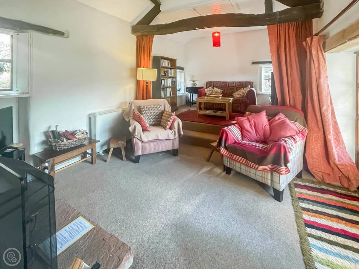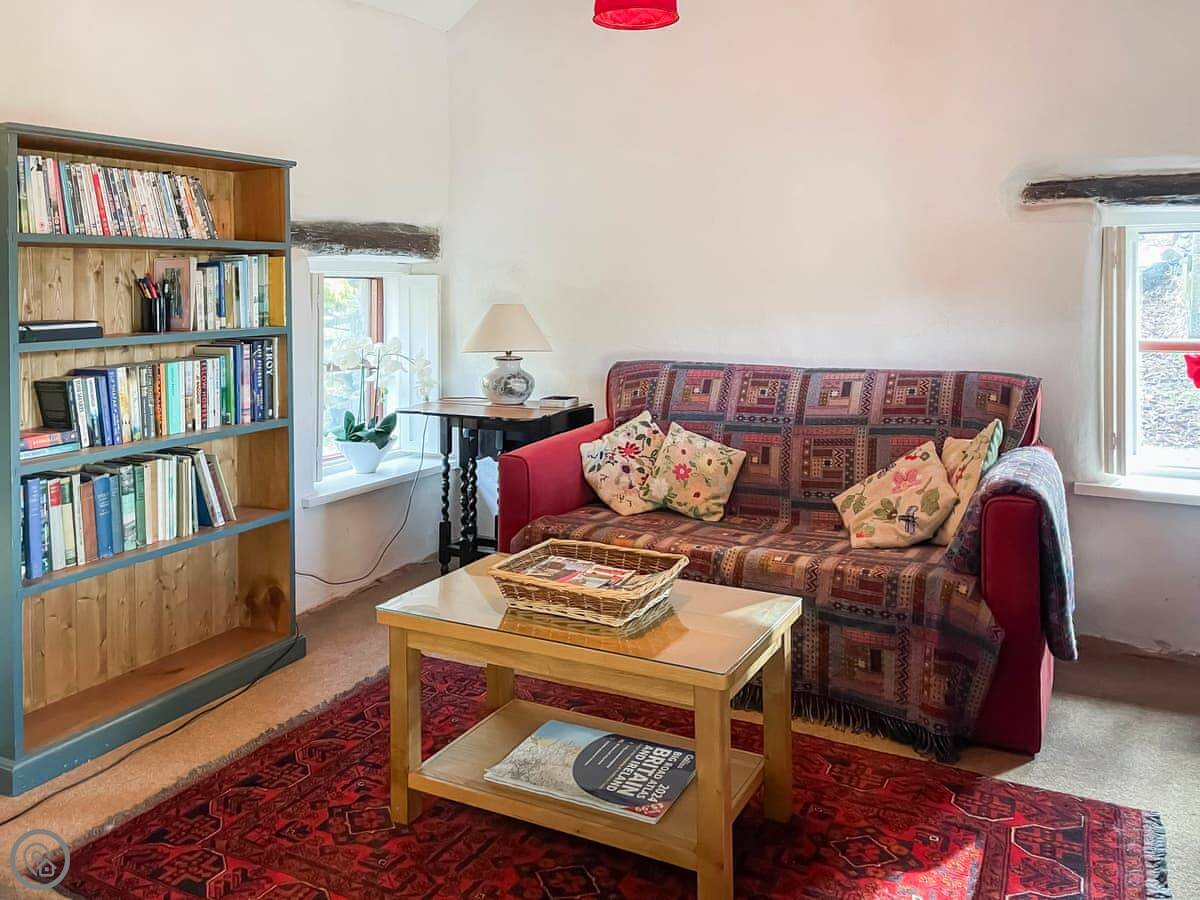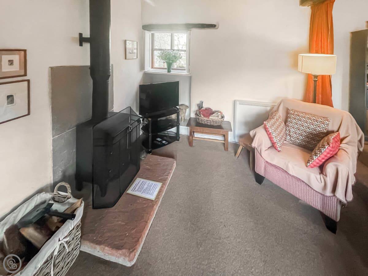 The main room has a wood-burning stove. The low windows on one side used to be doors for the animals. There's a raised sofa area you can curtain off if you want.