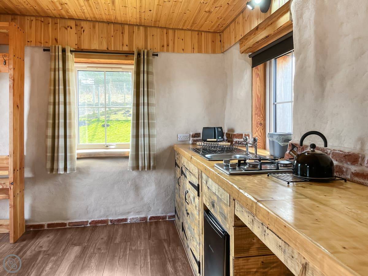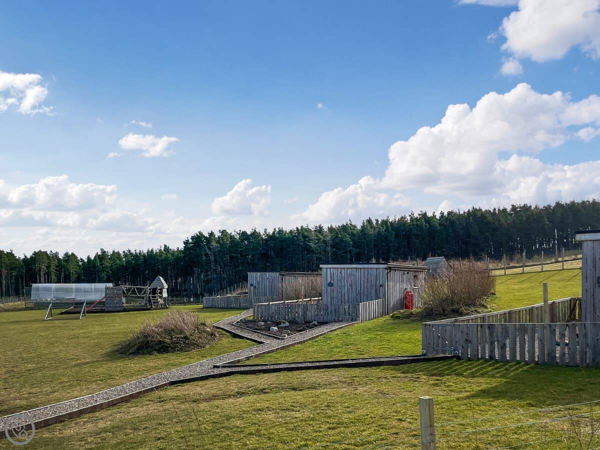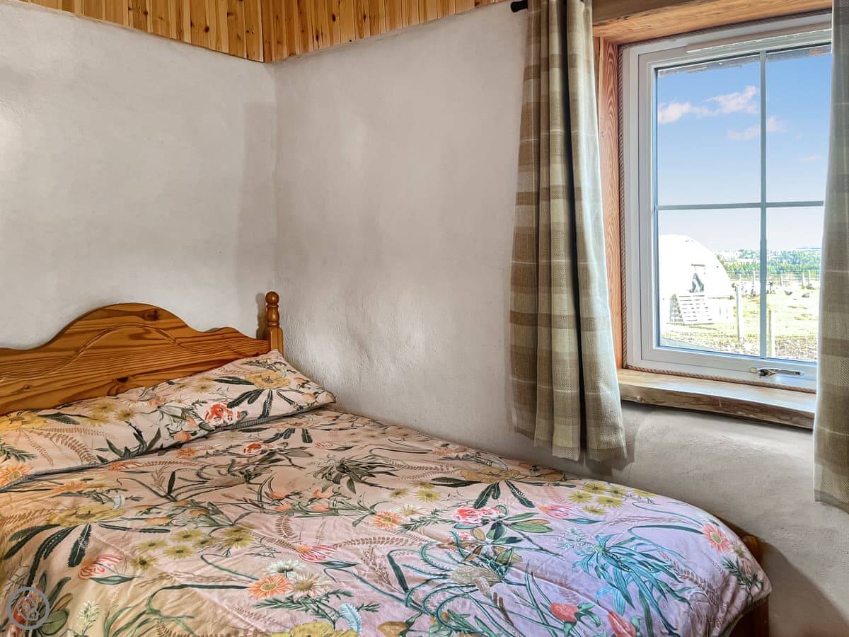 It's called Willow Bale Cabin. It’s on our farm near Dallas, which is in Aberdeenshire, north east Scotland. It’s a detached cabin made from straw bales, which keeps it warm. You’re on a working farm, so you’ll see animals. We’ve got sheep, goats, pigs, some wallabies, and water buffalo. The chickens wander about.