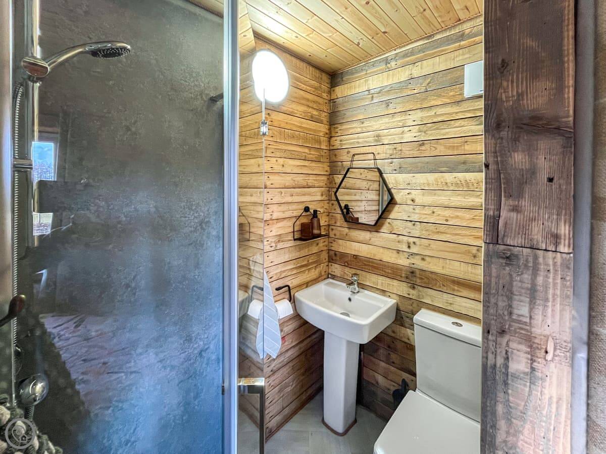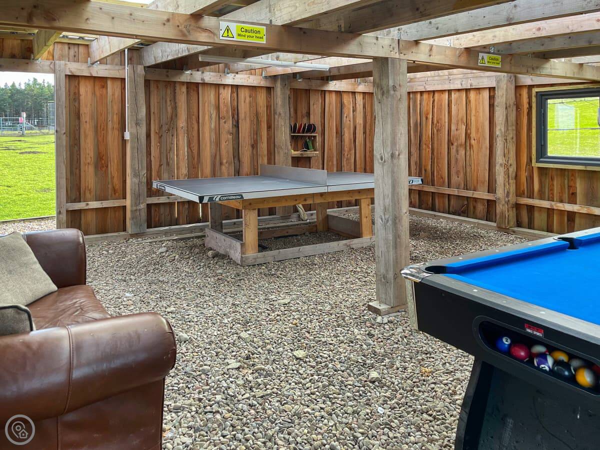 The cabin has a 4 Star rating. It’s got a TV and WiFi. There’s a fire pit outside and we provide the logs. Bedding and towels are included. We’ve got a small play park and a games room in an old shed for if the weather turns.