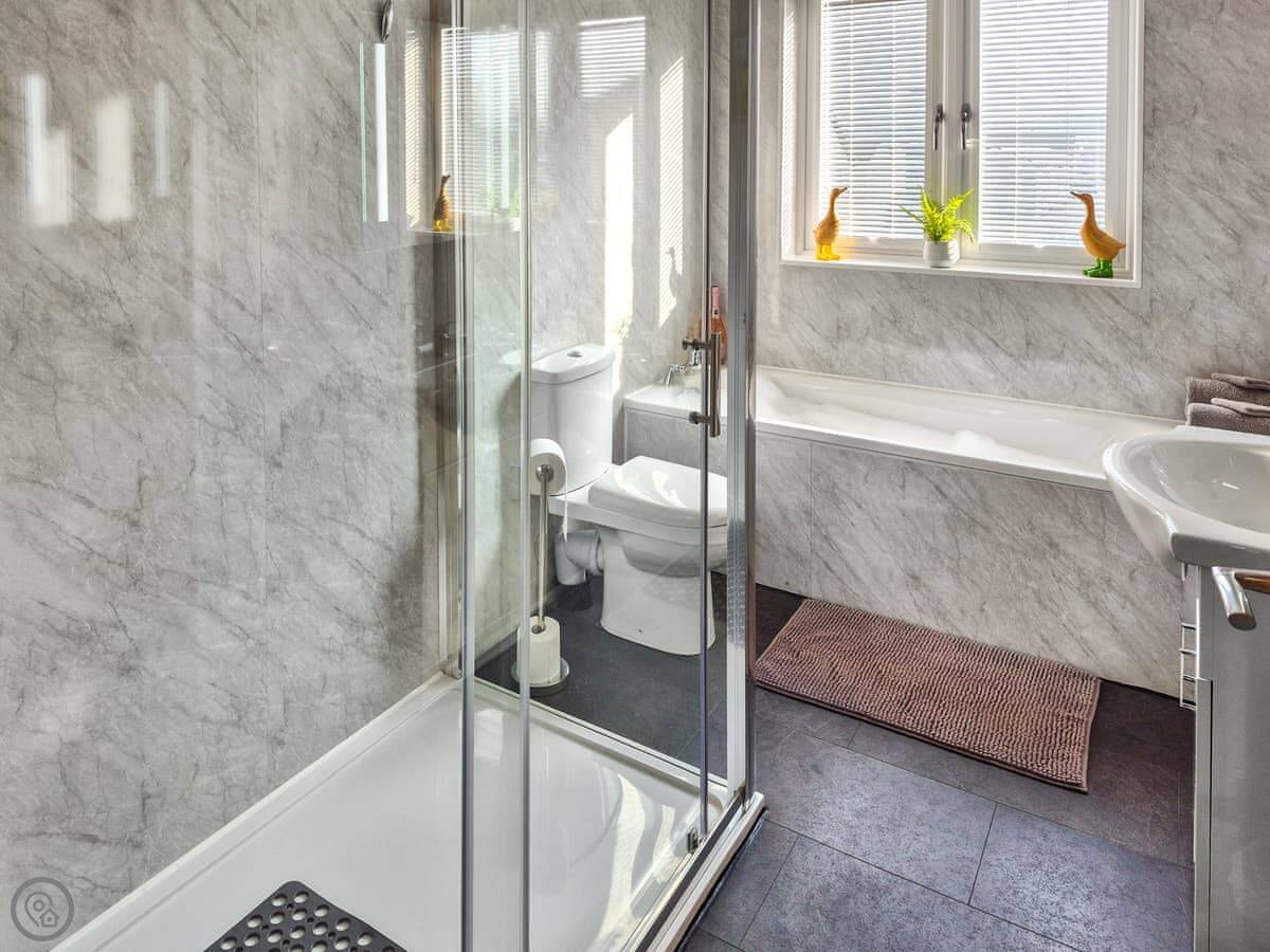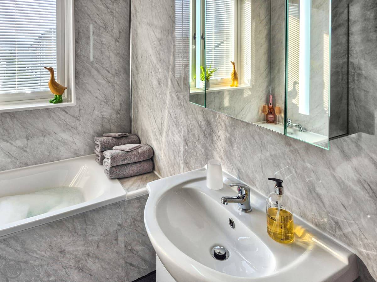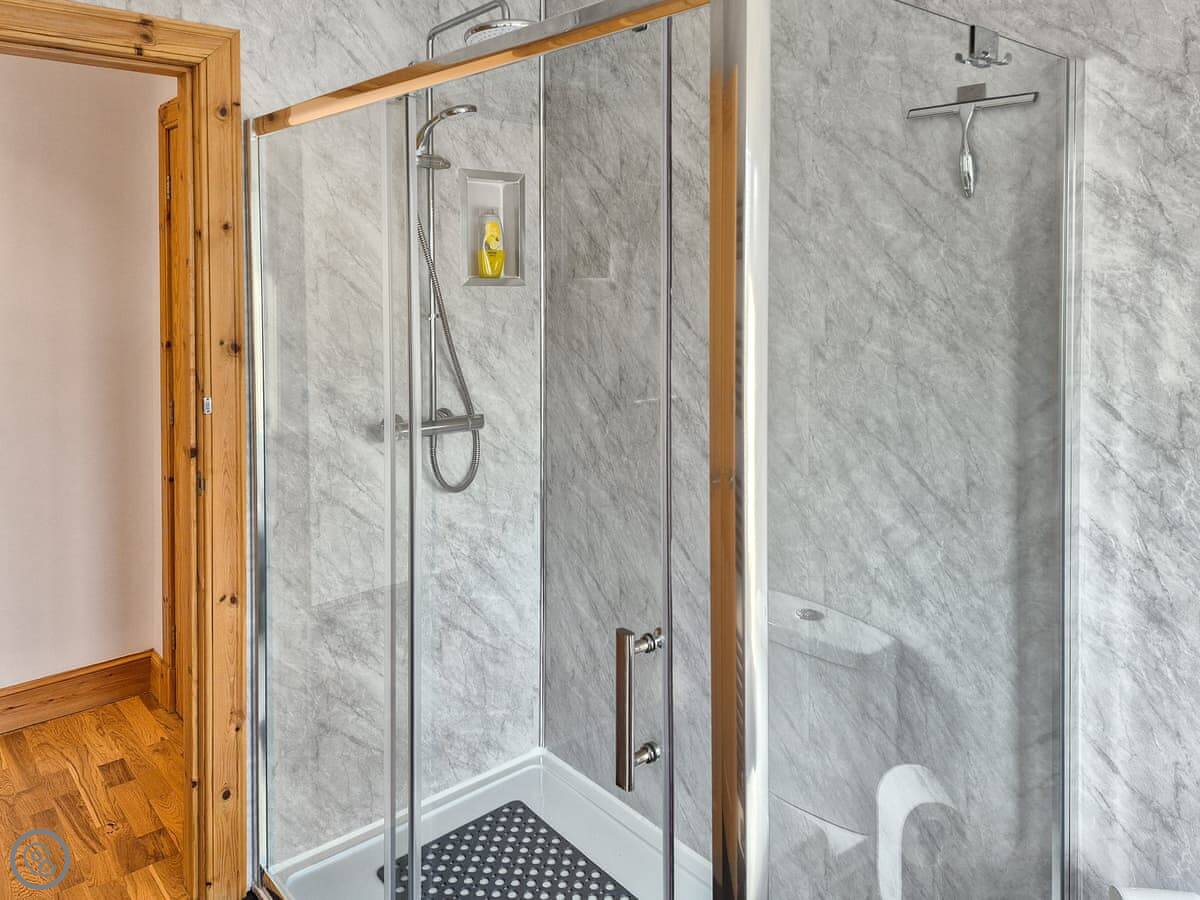 It's got a 4 Star rating. That means it's a good standard. It's well finished. There's a wood burner in the living room, with a stone fireplace around it. The kitchen has a dishwasher. The bedroom is a kingsize. The bathroom has a shower and a bath.