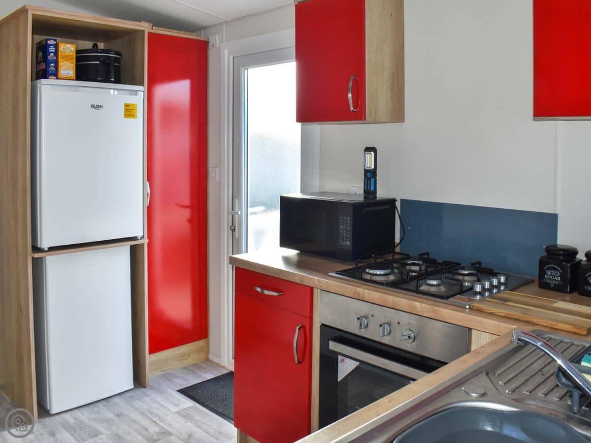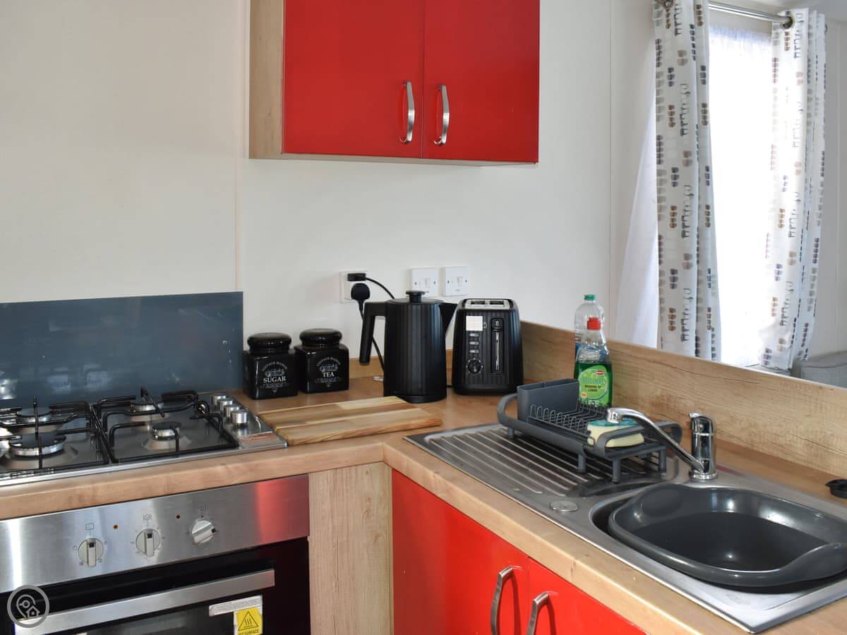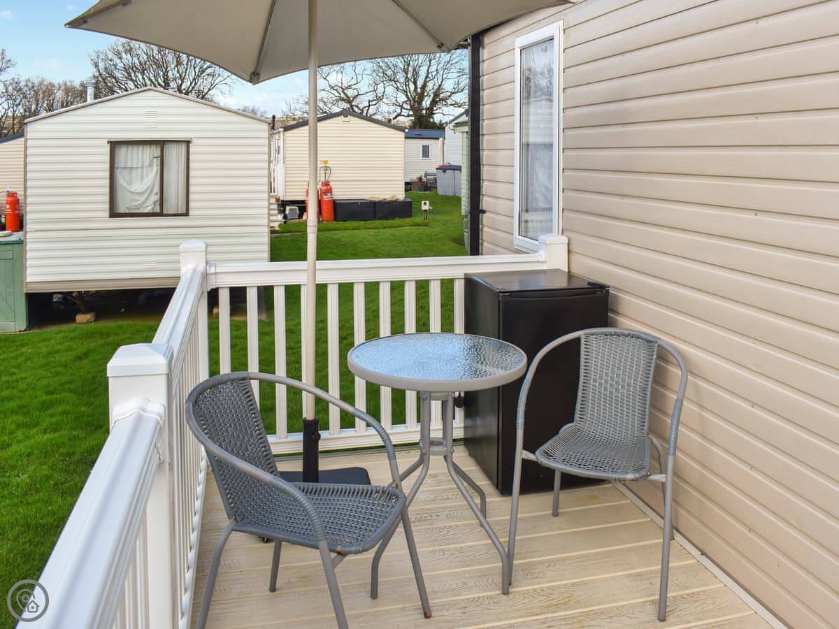 It sleeps four, with two bedrooms and one bathroom. It's a 3 Star place, so it's comfortable and tidy but not luxurious. The lounge, kitchen and dining area are all open plan. The kitchen has what you need for holiday meals. There's a proper decking area outside with a table and chairs.