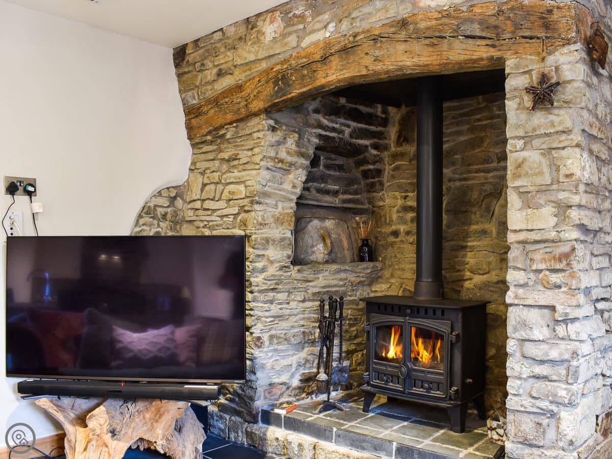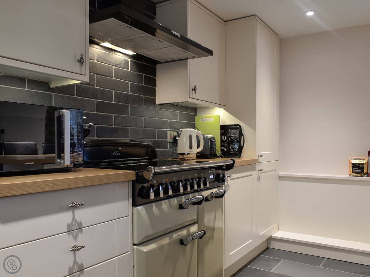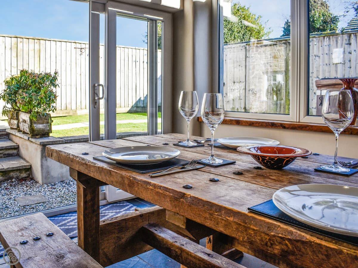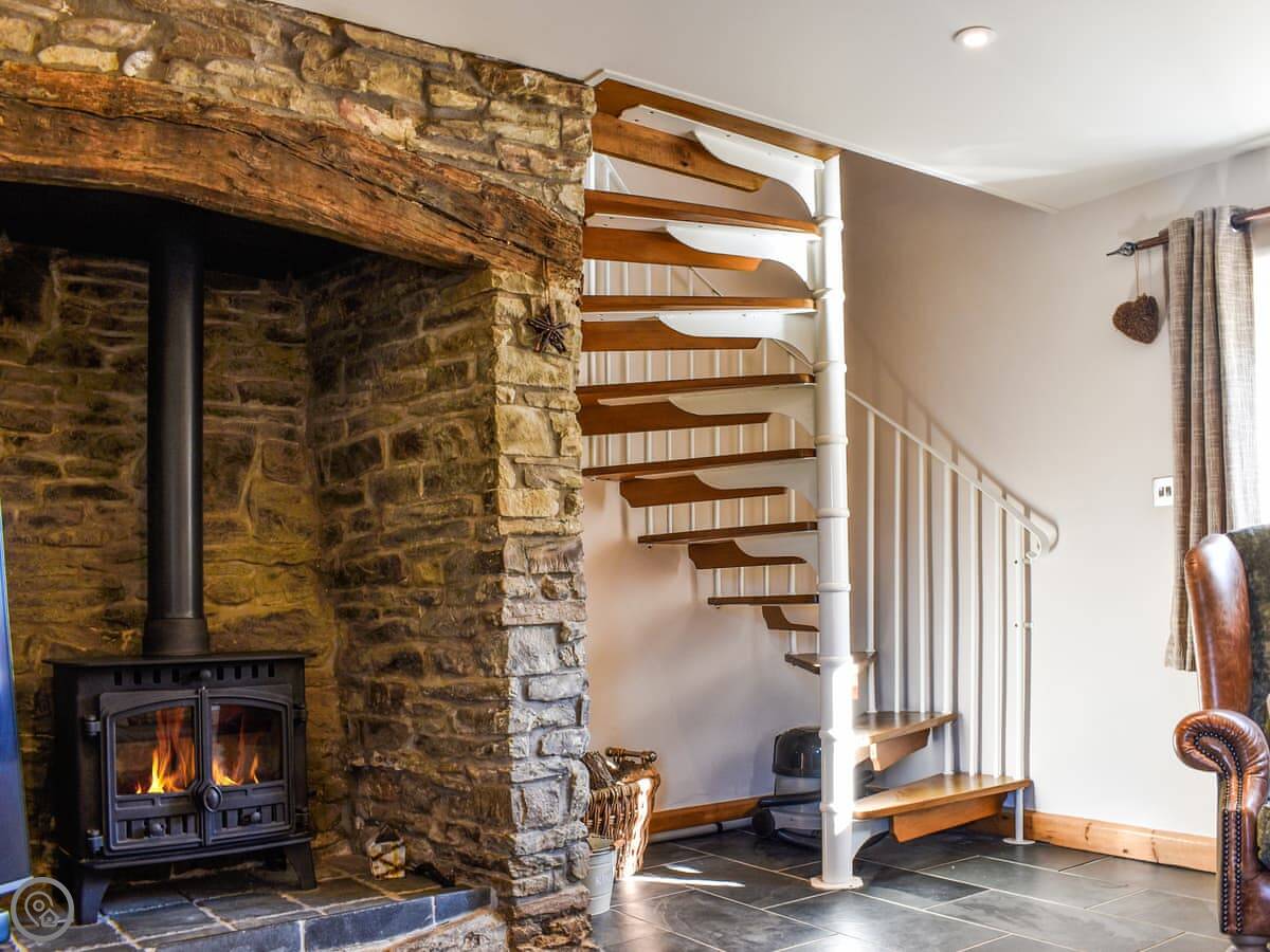 Downstairs is all open plan. There's a wood burner in the living room, which is good for cooler evenings. The kitchen has a dishwasher and washing machine. Patio doors open out to an enclosed garden with a table and chairs.