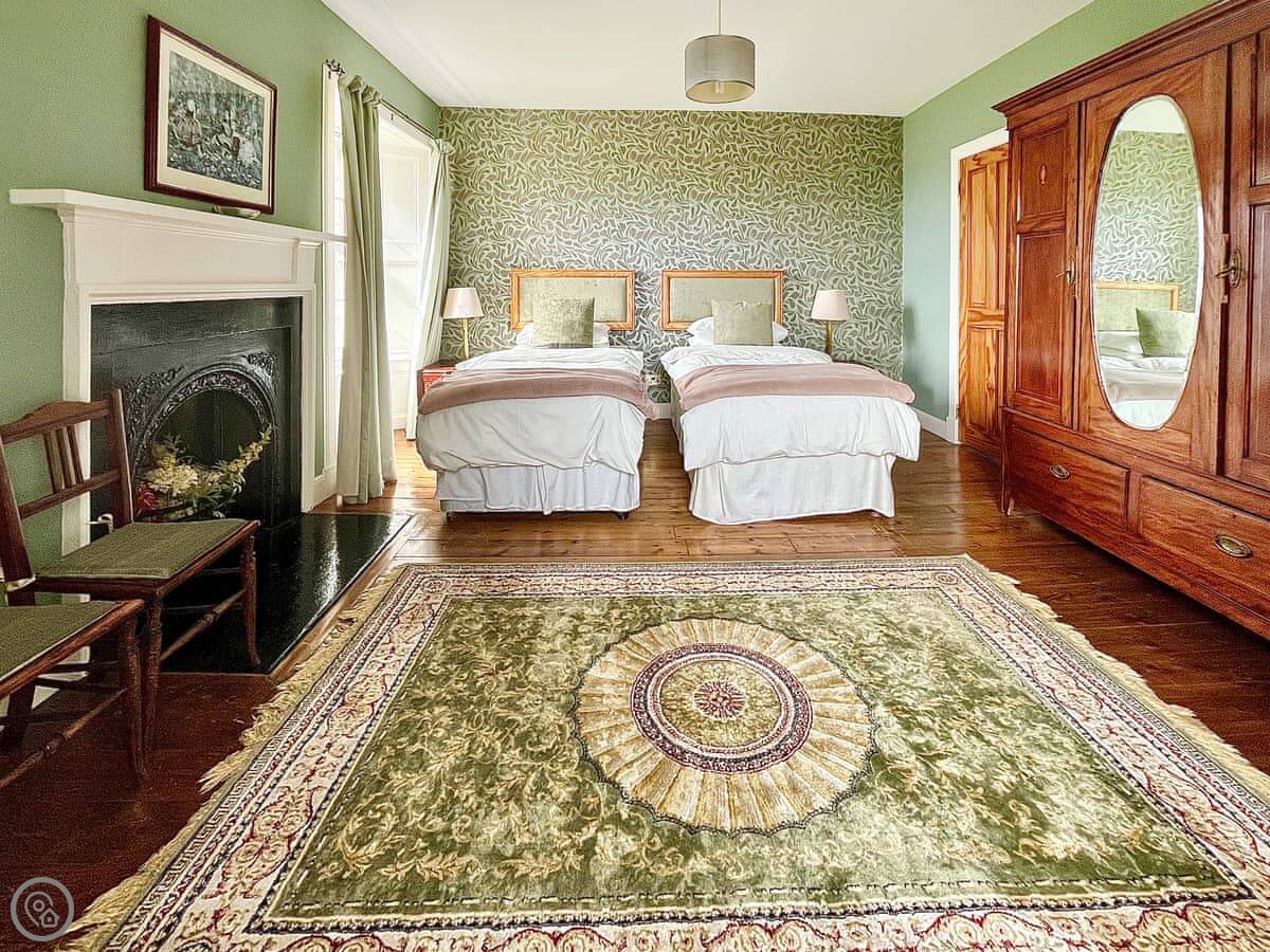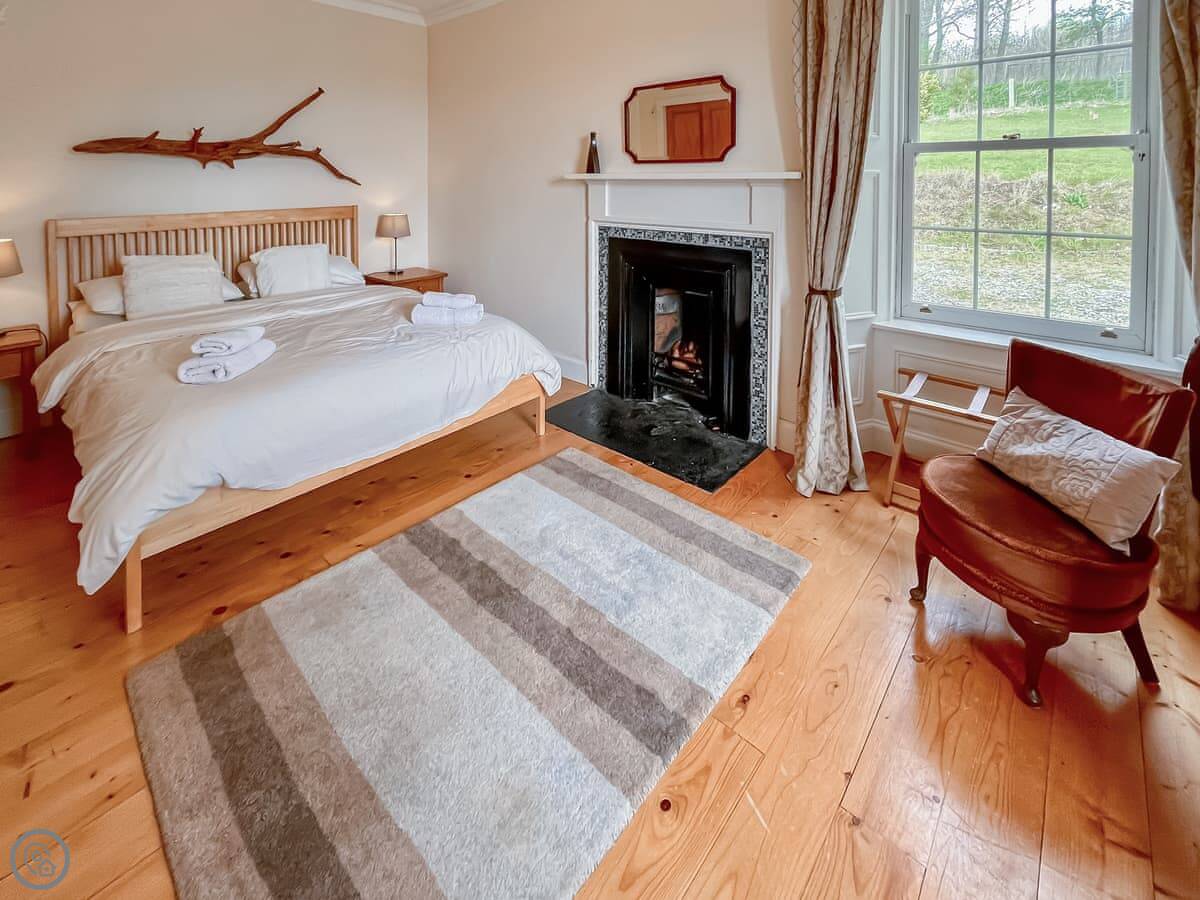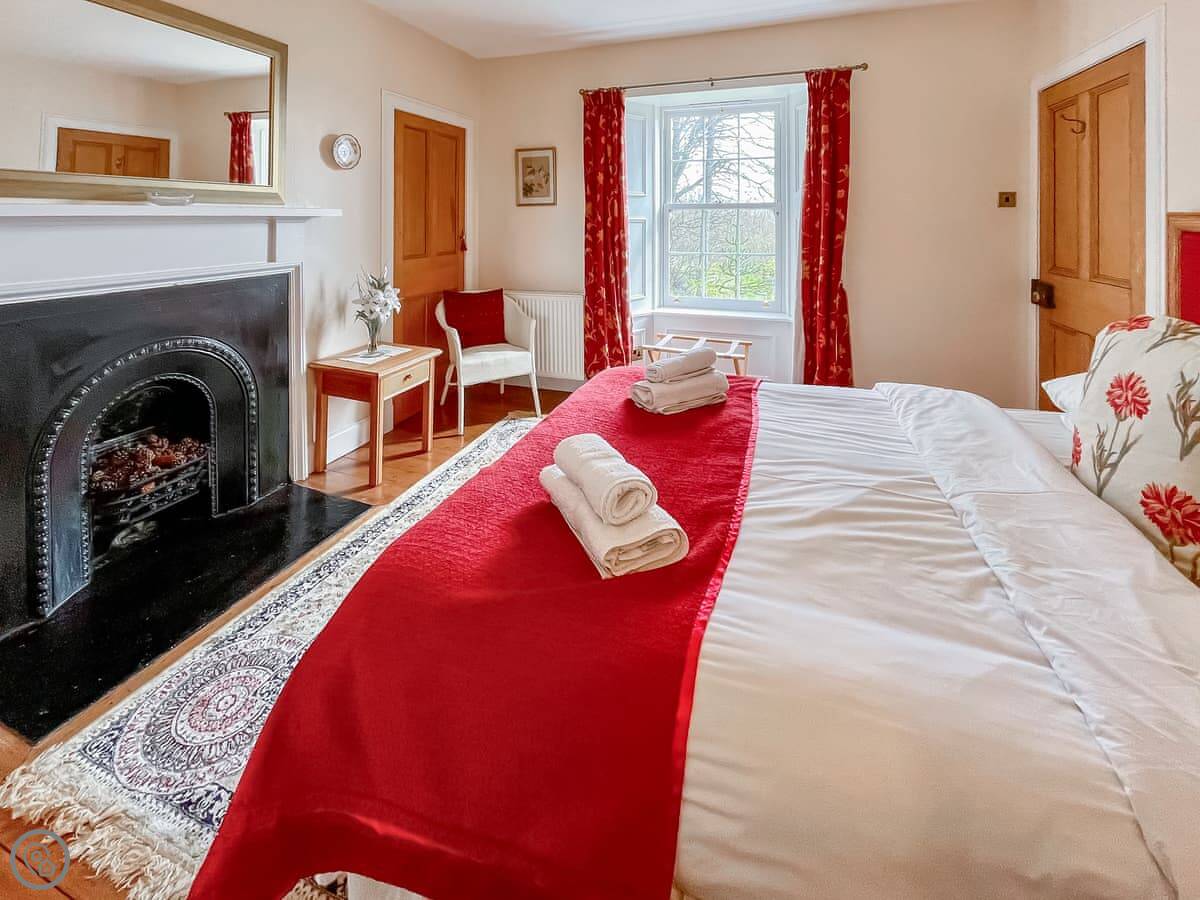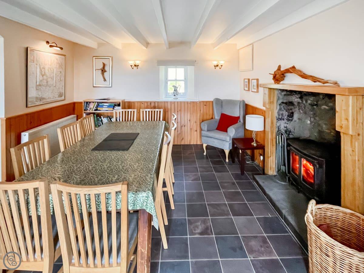 The house sleeps ten. Five bedrooms, four bathrooms, two are en-suite. It's a 4 Star, so it's comfortable and well-equipped. The place has old flagstone floors in the hall and original fireplaces. There are two wood burners, one in the lounge and one in the dining room. They're nice to have on in the evening.