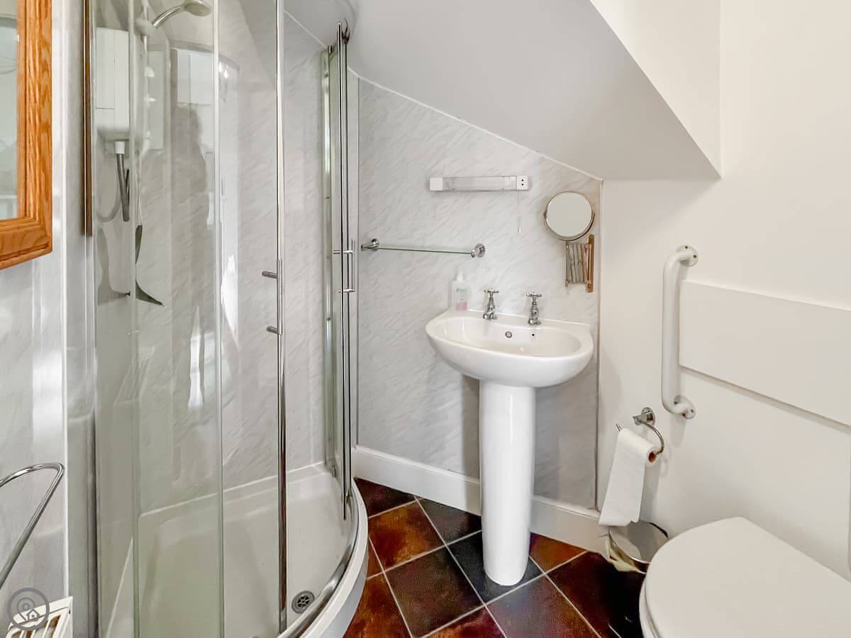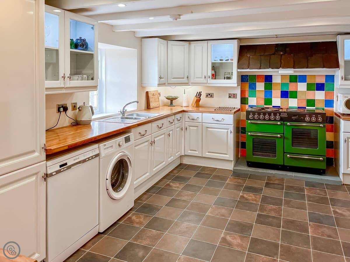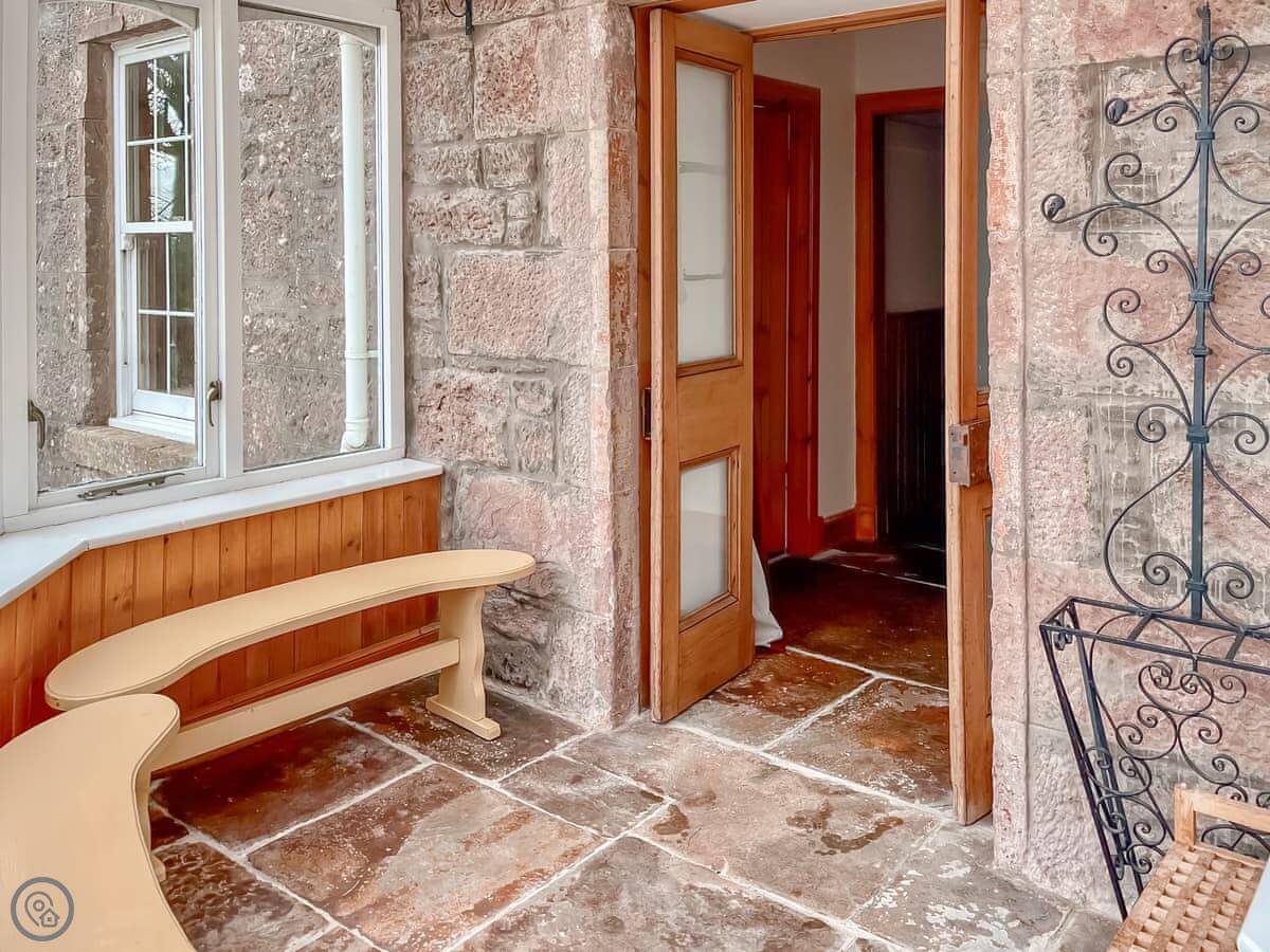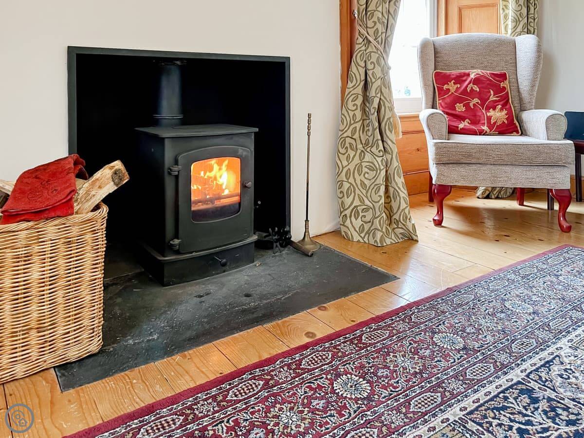 The house sleeps ten. Five bedrooms, four bathrooms, two are en-suite. It's a 4 Star, so it's comfortable and well-equipped. The place has old flagstone floors in the hall and original fireplaces. There are two wood burners, one in the lounge and one in the dining room. They're nice to have on in the evening.