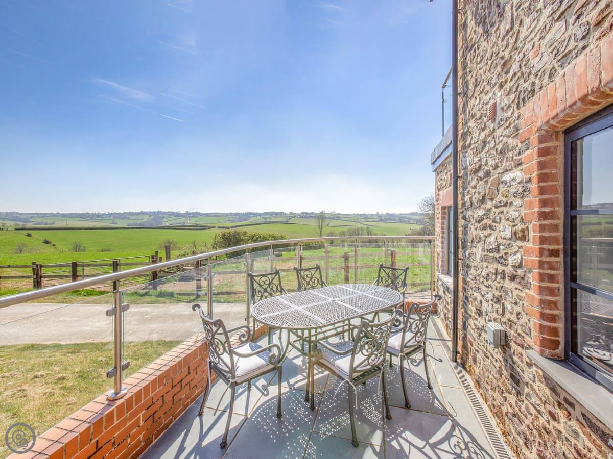 All three bedrooms are on the ground floor and each has its own bathroom. That's handy. The living space is upstairs: a kitchen and a big open-plan room with doors out to a balcony. The view from there is just fields. It's good.