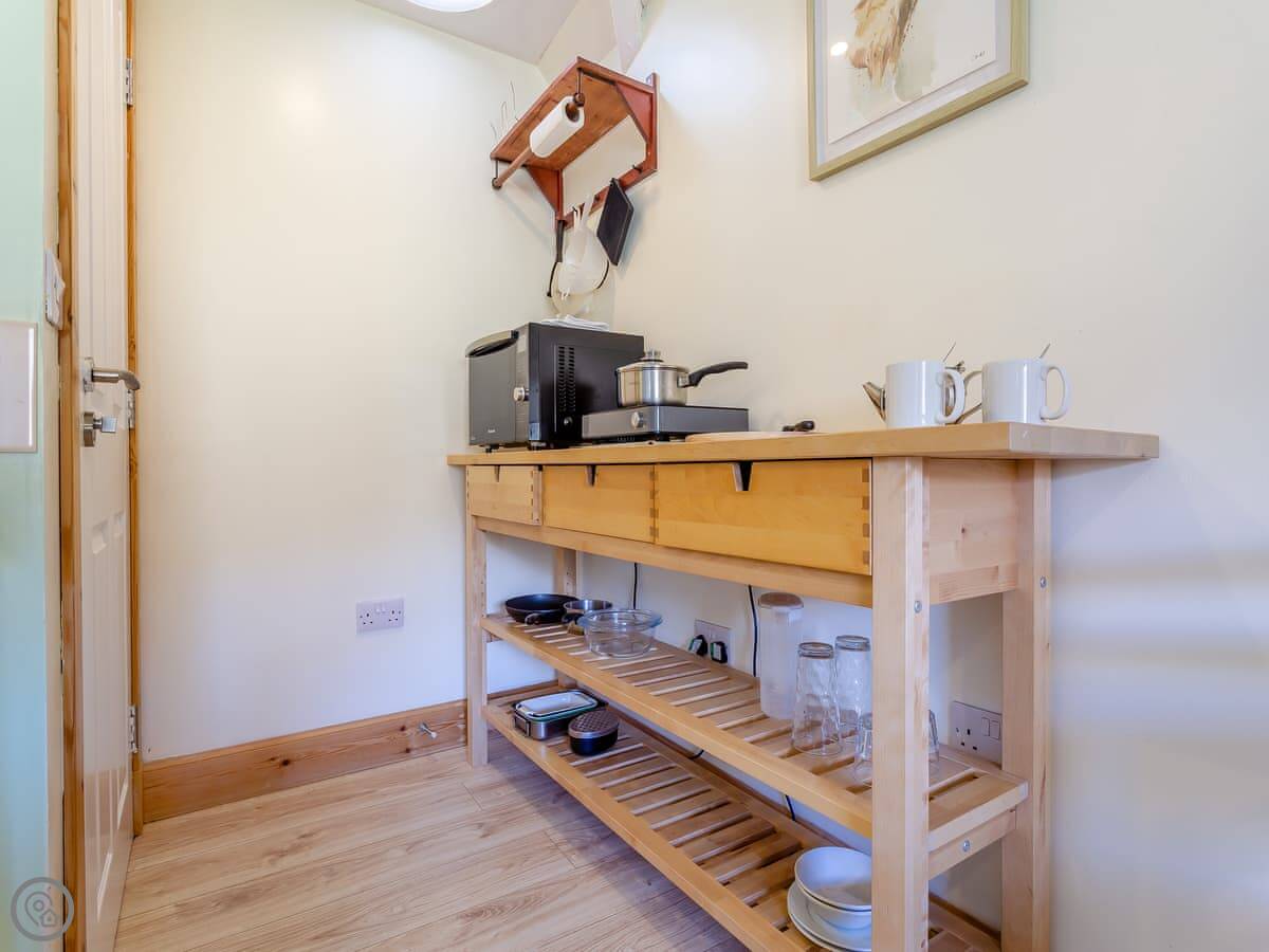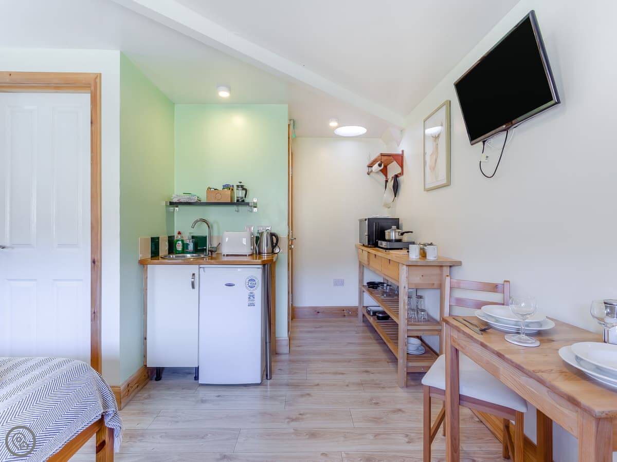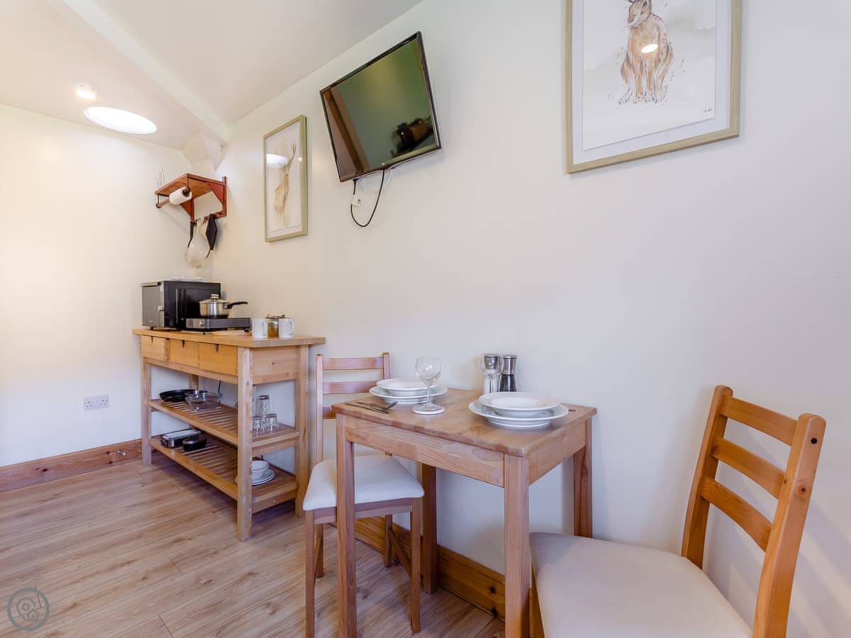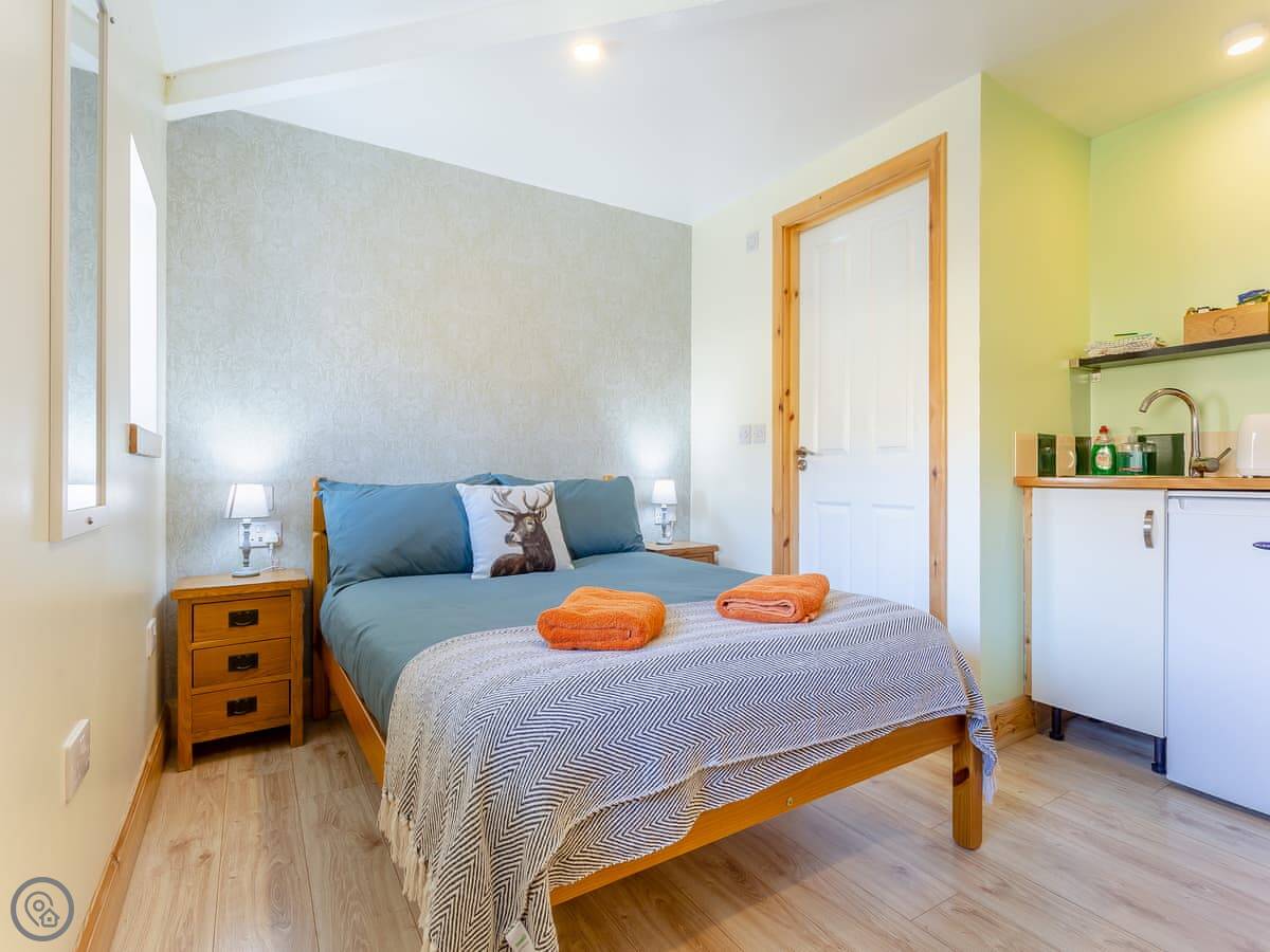 The layout is open-plan. There's a bed, a small sofa and chairs, a kitchenette with a table, and a shower room. It's got heating, WiFi, and a TV. Bedding and towels are included, and we can provide a cot. One well-behaved dog is welcome.