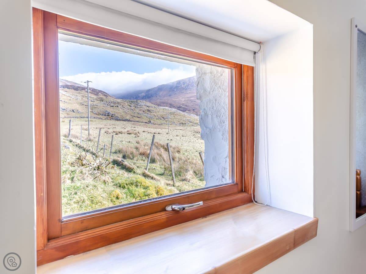 You'll see red deer in the garden, often in the morning. We also get golden eagles overhead occasionally. The view from the window is of the mountains and Loch Assynt.