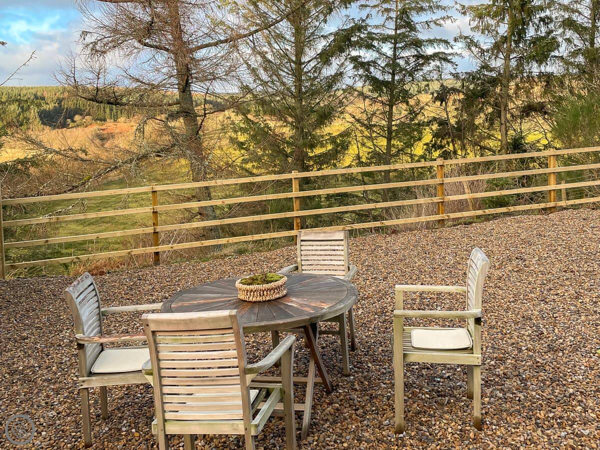 The main thing here is the location. It's very quiet. The patio looks out towards Kielder Dam. Because there's hardly any light pollution, the night sky is incredible. You can just sit outside and see everything. It's a proper Dark Sky area.
