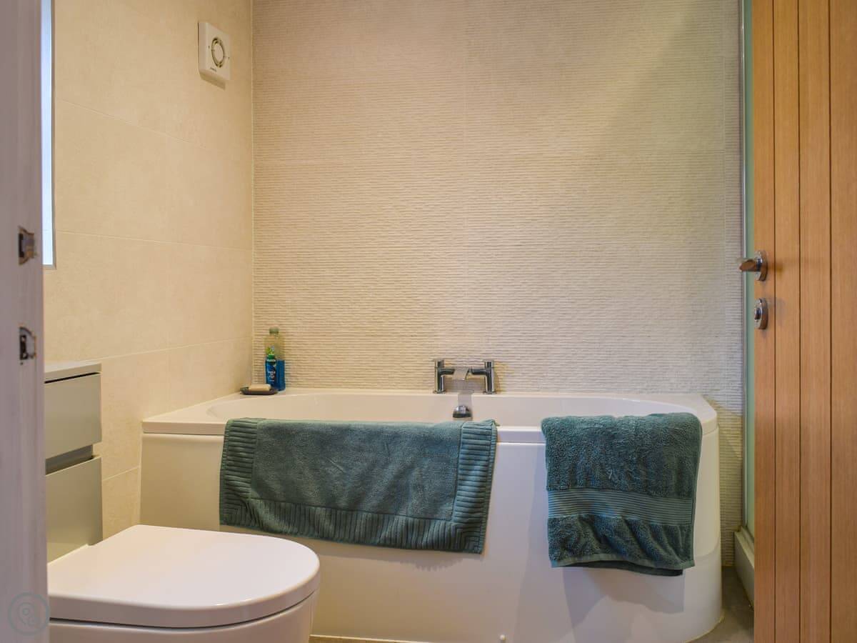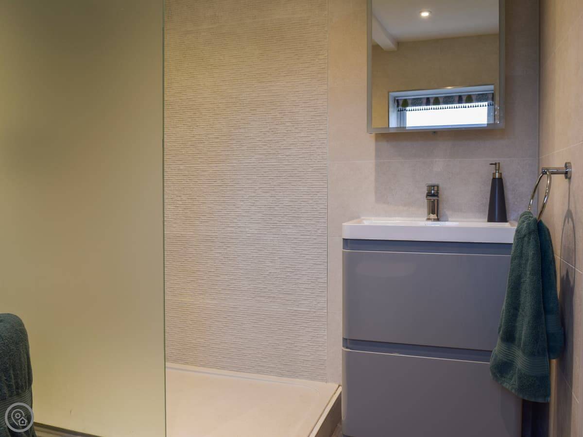 It's a single-floor place for two people. One bedroom, one bathroom. The bathroom has both a bath and a separate shower, which is handy. The main room is open plan, with the kitchen and living space together. There’s an electric stove that looks like a wood burner, it gives off a good heat. The French doors open onto the garden.