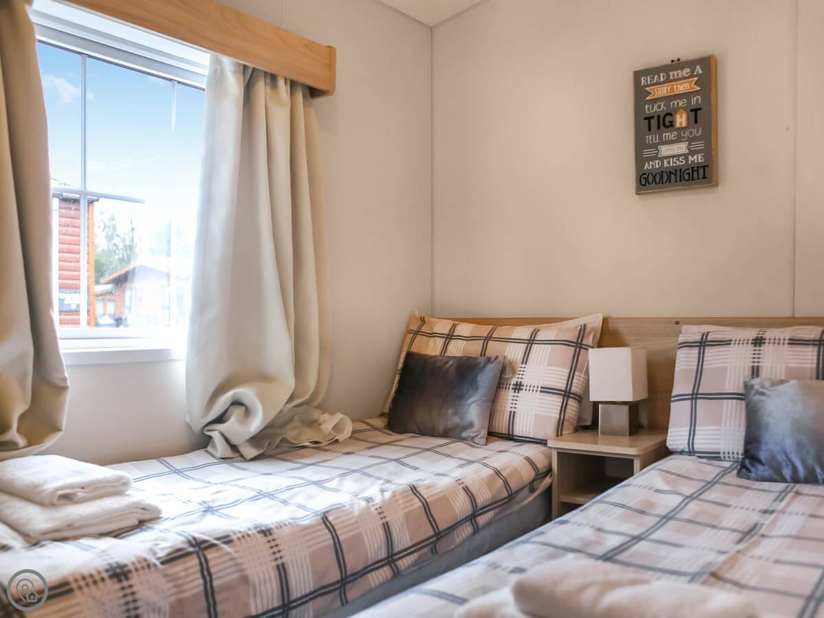 It sleeps four. There are two bedrooms. One is a twin with its own small toilet, and the other is a double. They share the main bathroom which has a shower. It's got a 3 Star rating, so it's comfortable and clean, but don't expect anything luxurious.