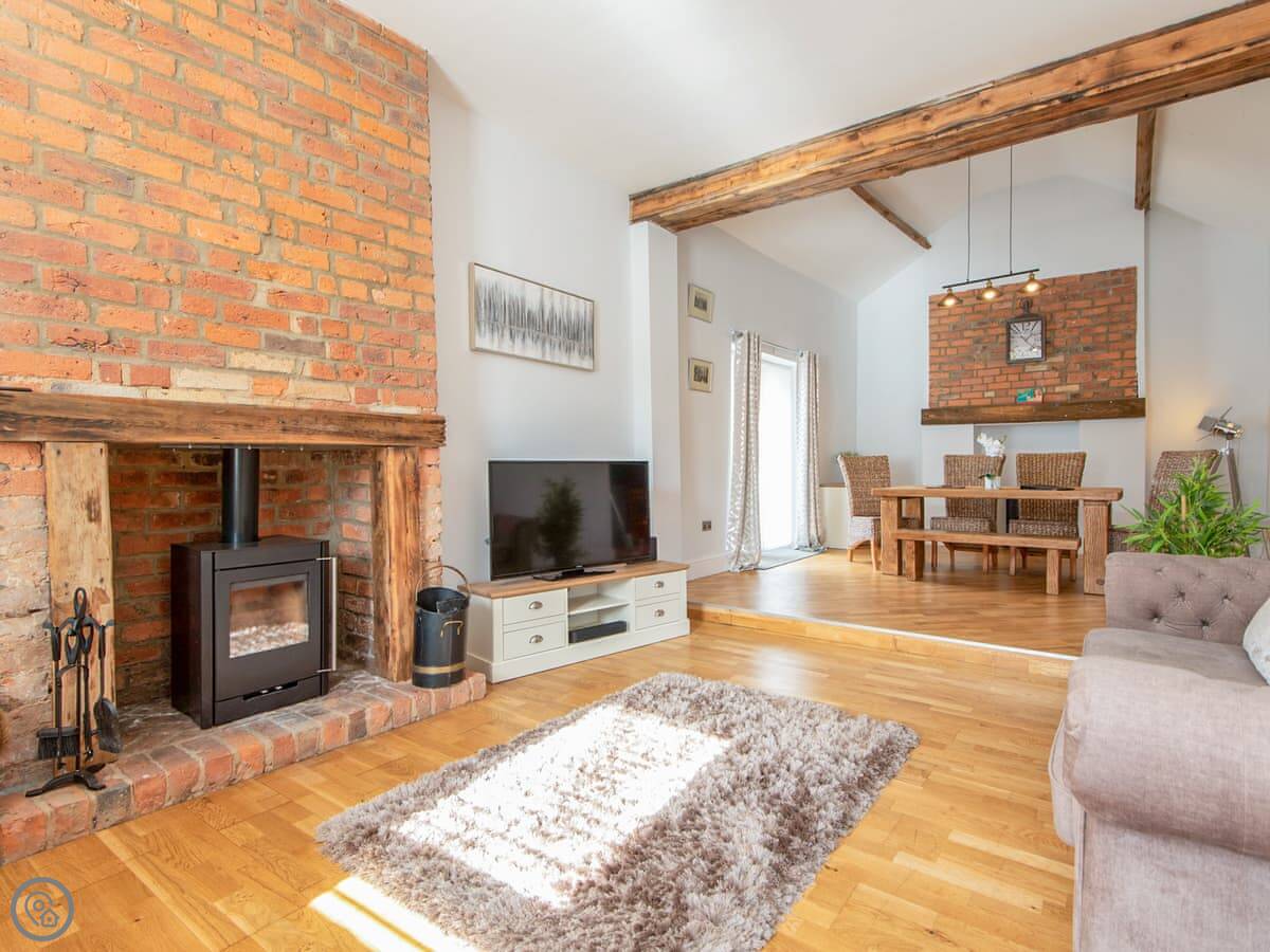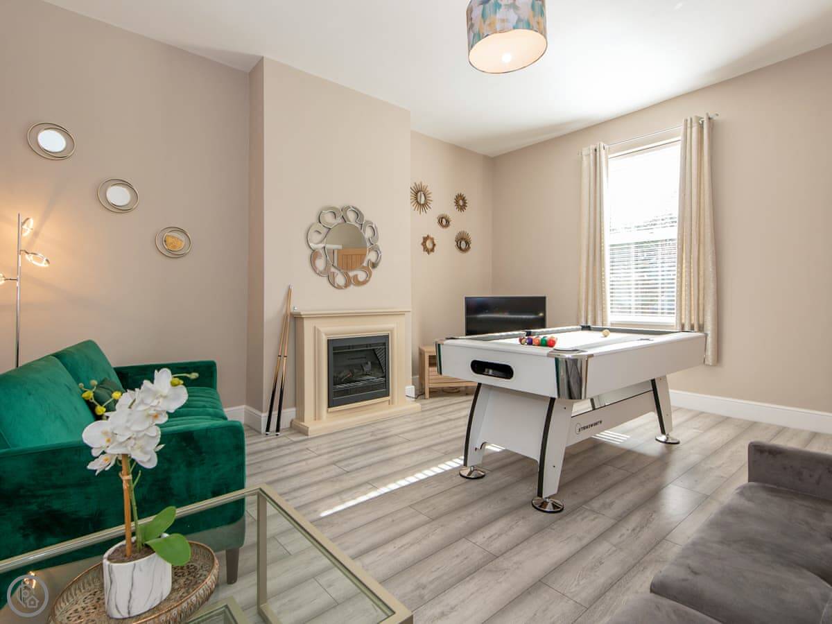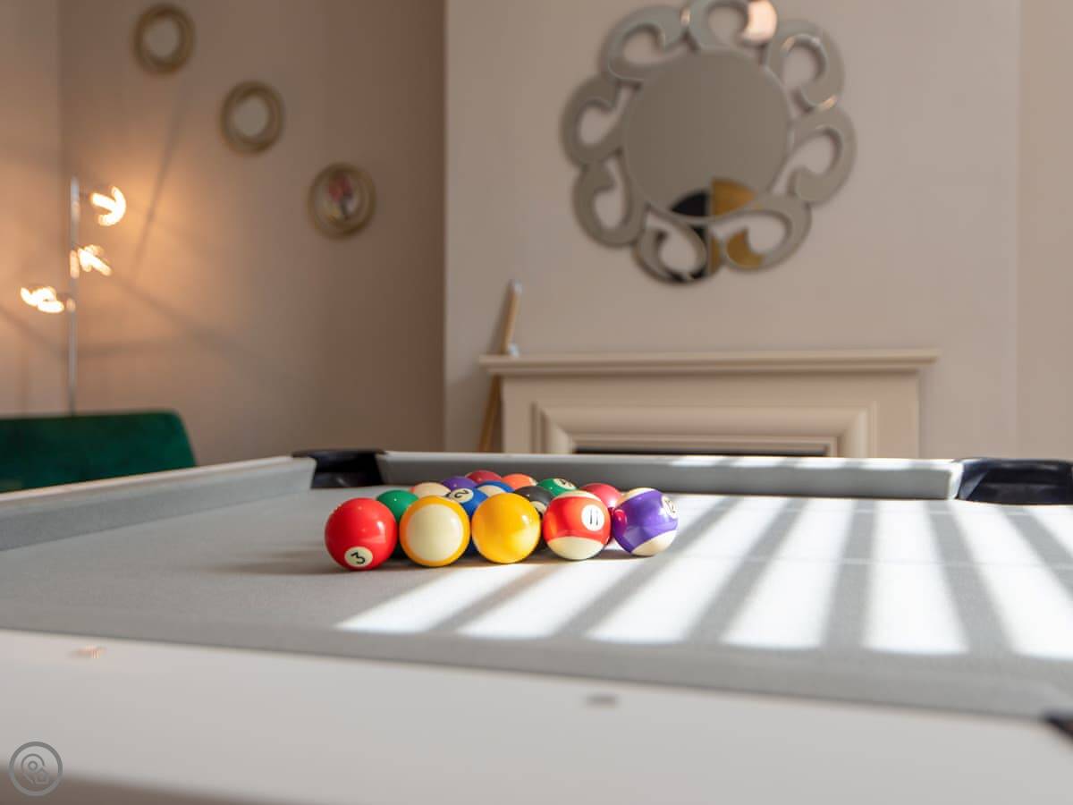 The stairs are fine. There's an open plan living area downstairs with a wood burner. The kitchen's modern, it has a dishwasher. There's a games room with a pool table and two extra sofa beds, so you could fit more if you really needed to.