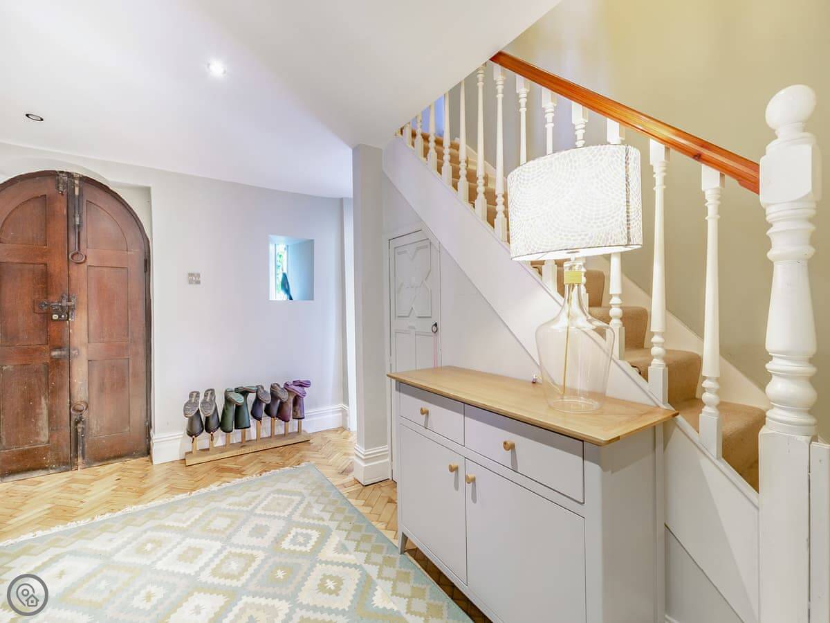 It sleeps eight. There are four bedrooms and two bathrooms. It's got a 4 Star rating, which is accurate. It's spacious and well-finished. The layout is a bit unusual. There are two separate living rooms, each with a wood burner. One has a double sofa bed in it. There are also two separate staircases going up to different parts of the house.