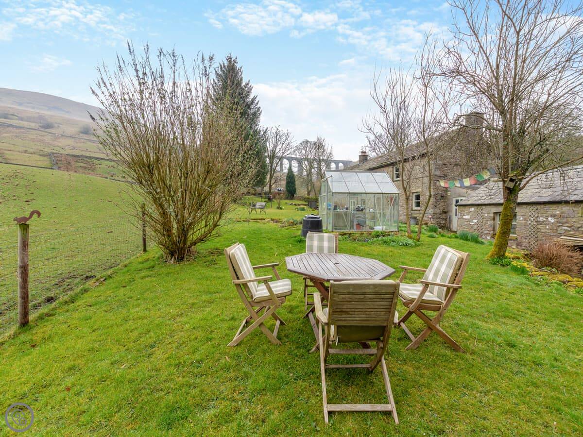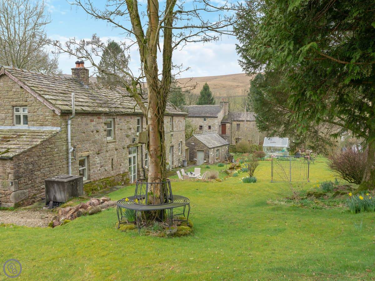 Slingsby Barn is in Cowgill. That's a small village in Dentdale, Cumbria. It's a proper stone barn conversion, detached, with its own garden. The garden's big and grassy, with a little stream at the bottom next to the fields.